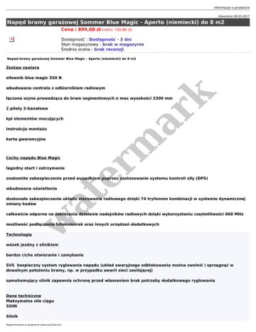 Informacje o produkcie Utworzono 08-03-2017 Napęd bramy garażowej Sommer Blue Magic - Aperto (niemiecki) do 8 m2 Cena : 899,00 zł (netto: 730,89 zł) Dostępność : Dostępność - 3 dni Stan magazynowy : brak w magazynie Średnia ocena : brak recenzji Napęd bramy garażowej Sommer Blue Magic - Aperto (niemiecki) do 8 m2 Zestaw zawiera siłownik blue magic 550 N er m ar k wbudowana centrala z odbiornikiem radiowym łączona szyna prowadząca do bram segmentowych o max wysokości 2300 mm 2 piloty 2-kanałowe kpl elementów mocujących instrukcja montażu karta gwarancyjna Cechy napędu Blue Magic łagodny start i zatrzymanie znakomite zabezpieczenie przed wypadkiem poprzez zastosowanie systemu kontroli siły (DPS) at wbudowane oświetlenie doskonałe zabezpieczenie układu sterowania radiowego dzięki 74 trylionom kombinacji w systemie dynamicznej zmiany kodów w całkowicie odporne na zakłócenia działanie nadajników radiowych dzięki wykorzystaniu częstotliwości 868 MHz możliwość podłączenia fotokomórek oraz innych urządzeń dodatkowych Technologia wózek jezdny z silnikiem bardzo ciche otwieranie i zamykanie SVS bezpieczny system ryglowania napędu (układ awaryjnego odblokowania można zwolnić i sprzęgnąć w dowolnym położeniu bramy, np. w przypadku awarii sieci zasilającej) samohamujący silnik zapewnia ochronę przed włamaniem brak potrzeby dodatkowego ryglowania Dane techniczne Maksymalna siła ciągu 550N Silnik Wygenerowano w programie www.oscGold.com prądu stałego 24V Maksymalna prędkość 160 mm/sek Napięcie zasilania AC 230V, 50 Hz Zakres poboru mocy 60 - 220W Moc znamionowa 140 W Maksymalna szerokość bramy 3500 mm er m ar k Zakres temperatur - 20 , + 60 C Maksymalna wysokość bramy segmentowej 2300 mm w at Maksymalna wysokość bramy uchylnej 2550 mm