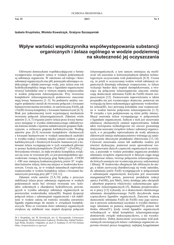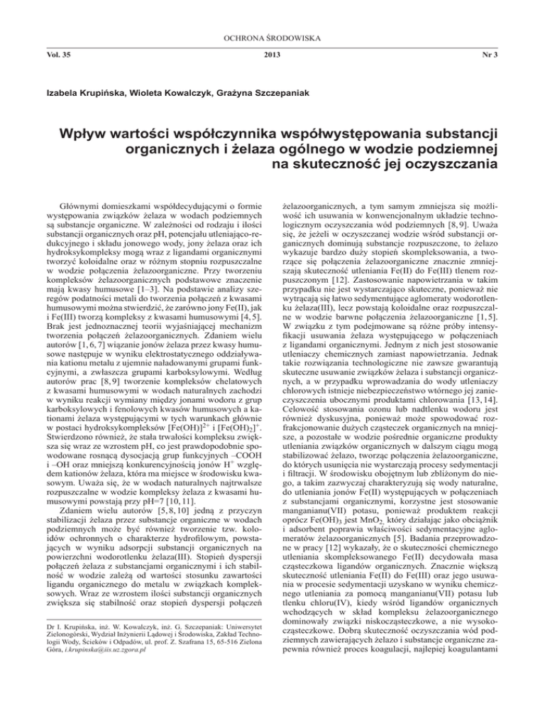 OCHRONA ŚRODOWISKA Vol. 35 2013 Nr 3 Izabela Krupińska, Wioleta Kowalczyk, Grażyna Szczepaniak Wpływ wartości współczynnika współwystępowania substancji organicznych i żelaza ogólnego w wodzie podziemnej na skuteczność jej oczyszczania Głównymi domieszkami współdecydującymi o formie występowania związków żelaza w wodach podziemnych są substancje organiczne. W zależności od rodzaju i ilości substancji organicznych oraz pH, potencjału utleniająco-redukcyjnego i składu jonowego wody, jony żelaza oraz ich hydroksykompleksy mogą wraz z ligandami organicznymi tworzyć koloidalne oraz w różnym stopniu rozpuszczalne w wodzie połączenia żelazoorganiczne. Przy tworzeniu kompleksów żelazoorganicznych podstawowe znaczenie mają kwasy humusowe [1–3]. Na podstawie analizy szeregów podatności metali do tworzenia połączeń z kwasami humusowymi można stwierdzić, że zarówno jony Fe(II), jak i Fe(III) tworzą kompleksy z kwasami humusowymi [4, 5]. Brak jest jednoznacznej teorii wyjaśniającej mechanizm tworzenia połączeń żelazoorganicznych. Zdaniem wielu autorów [1, 6, 7] wiązanie jonów żelaza przez kwasy humusowe następuje w wyniku elektrostatycznego oddziaływania kationu metalu z ujemnie naładowanymi grupami funkcyjnymi, a zwłaszcza grupami karboksylowymi. Według autorów prac [8, 9] tworzenie kompleksów chelatowych z kwasami humusowymi w wodach naturalnych zachodzi w wyniku reakcji wymiany między jonami wodoru z grup karboksylowych i fenolowych kwasów humusowych a kationami żelaza występującymi w tych warunkach głównie w postaci hydroksykompleksów [Fe(OH)]2+ i [Fe(OH)2]+. Stwierdzono również, że stała trwałości kompleksu zwiększa się wraz ze wzrostem pH, co jest prawdopodobnie spowodowane rosnącą dysocjacją grup funkcyjnych –COOH i –OH oraz mniejszą konkurencyjnością jonów H+ względem kationów żelaza, która ma miejsce w środowisku kwasowym. Uważa się, że w wodach naturalnych najtrwalsze rozpuszczalne w wodzie kompleksy żelaza z kwasami humusowymi powstają przy pH=7 [10, 11]. Zdaniem wielu autorów [5, 8, 10] jedną z przyczyn stabilizacji żelaza przez substancje organiczne w wodach podziemnych może być również tworzenie tzw. koloidów ochronnych o charakterze hydrofilowym, powstających w wyniku adsorpcji substancji organicznych na powierzchni wodorotlenku żelaza(III). Stopień dyspersji połączeń żelaza z substancjami organicznymi i ich stabilność w wodzie zależą od wartości stosunku zawartości ligandu organicznego do metalu w związkach kompleksowych. Wraz ze wzrostem ilości substancji organicznych zwiększa się stabilność oraz stopień dyspersji połączeń Dr I. Krupińska, inż. W. Kowalczyk, inż. G. Szczepaniak: Uniwersytet Zielonogórski, Wydział Inżynierii Lądowej i Środowiska, Zakład Technologii Wody, Ścieków i Odpadów, ul. prof. Z. Szafrana 15, 65-516 Zielona Góra, [email protected] żelazoorganicznych, a tym samym zmniejsza się możliwość ich usuwania w konwencjonalnym układzie technologicznym oczyszczania wód podziemnych [8, 9]. Uważa się, że jeżeli w oczyszczanej wodzie wśród substancji organicznych dominują substancje rozpuszczone, to żelazo wykazuje bardzo duży stopień skompleksowania, a tworzące się połączenia żelazoorganiczne znacznie zmniejszają skuteczność utleniania Fe(II) do Fe(III) tlenem rozpuszczonym [12]. Zastosowanie napowietrzania w takim przypadku nie jest wystarczająco skuteczne, ponieważ nie wytrącają się łatwo sedymentujące aglomeraty wodorotlenku żelaza(III), lecz powstają koloidalne oraz rozpuszczalne w wodzie barwne połączenia żelazoorganiczne [1, 5]. W związku z tym podejmowane są różne próby intensyfikacji usuwania żelaza występującego w połączeniach z ligandami organicznymi. Jednym z nich jest stosowanie utleniaczy chemicznych zamiast napowietrzania. Jednak takie rozwiązania technologiczne nie zawsze gwarantują skuteczne usuwanie związków żelaza i substancji organicznych, a w przypadku wprowadzania do wody utleniaczy chlorowych istnieje niebezpieczeństwo wtórnego jej zanieczyszczenia ubocznymi produktami chlorowania [13, 14]. Celowość stosowania ozonu lub nadtlenku wodoru jest również dyskusyjna, ponieważ może spowodować rozfrakcjonowanie dużych cząsteczek organicznych na mniejsze, a pozostałe w wodzie pośrednie organiczne produkty utleniania związków organicznych w dalszym ciągu mogą stabilizować żelazo, tworząc połączenia żelazoorganiczne, do których usunięcia nie wystarczają procesy sedymentacji i filtracji. W środowisku obojętnym lub zbliżonym do niego, a takim zazwyczaj charakteryzują się wody naturalne, do utleniania jonów Fe(II) występujących w połączeniach z substancjami organicznymi, korzystne jest stosowanie manganianu(VII) potasu, ponieważ produktem reakcji oprócz Fe(OH)3 jest MnO2, który działając jako obciążnik i adsorbent poprawia właściwości sedymentacyjne aglomeratów żelazoorganicznych [5]. Badania przeprowadzone w pracy [12] wykazały, że o skuteczności chemicznego utleniania skompleksowanego Fe(II) decydowała masa cząsteczkowa ligandów organicznych. Znacznie większą skuteczność utleniania Fe(II) do Fe(III) oraz jego usuwania w procesie sedymentacji uzyskano w wyniku chemicznego utleniania za pomocą manganianu(VII) potasu lub tlenku chloru(IV), kiedy wśród ligandów organicznych wchodzących w skład kompleksu żelazoorganicznego dominowały związki niskocząsteczkowe, a nie wysokocząsteczkowe. Dobrą skuteczność oczyszczania wód podziemnych zawierających żelazo i substancje organiczne zapewnia również proces koagulacji, najlepiej koagulantami 28 I. Krupińska, W. Kowalczyk, G. Szczepaniak glinowymi [15–17]. Według autorów pracy [12] skuteczność procesu koagulacji w usuwaniu połączeń żelazoorganicznych koagulantami glinowymi zwiększa się wraz ze wzrostem masy cząsteczkowej ligandów organiczny