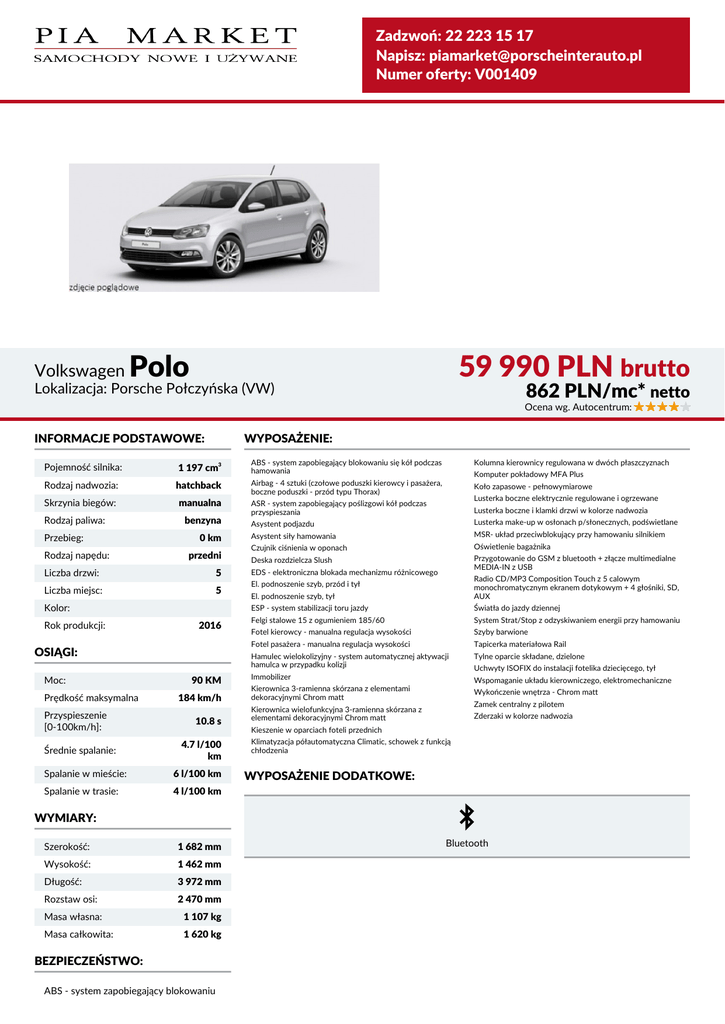 Zadzwoń: 22 223 15 17 Napisz: [email protected] Numer oferty: V001409 Volkswagen Polo 59 990 PLN brutto 862 PLN/mc* netto Lokalizacja: Porsche Połczyńska (VW) Ocena wg. Autocentrum: INFORMACJE PODSTAWOWE: WYPOSAŻENIE: Pojemność silnika: 1 197 cm3 ABS - system zapobiegający blokowaniu się kół podczas hamowania Kolumna kierownicy regulowana w dwóch płaszczyznach Rodzaj nadwozia: hatchback Airbag - 4 sztuki (czołowe poduszki kierowcy i pasażera, boczne poduszki - przód typu Thorax) Koło zapasowe - pełnowymiarowe Skrzynia biegów: manualna ASR - system zapobiegający poślizgowi kół podczas przyspieszania Lusterka boczne i klamki drzwi w kolorze nadwozia Rodzaj paliwa: Przebieg: Rodzaj napędu: benzyna 0 km przedni Liczba drzwi: 5 Liczba miejsc: 5 Kolor: Rok produkcji: 2016 OSIĄGI: Moc: Prędkość maksymalna Przyspieszenie [0-100km/h]: Średnie spalanie: 90 KM 184 km/h 10.8 s 4.7 l/100 km Spalanie w mieście: 6 l/100 km Spalanie w trasie: 4 l/100 km Komputer pokładowy MFA Plus Lusterka boczne elektrycznie regulowane i ogrzewane Asystent podjazdu Lusterka make-up w osłonach p/słonecznych, podświetlane Asystent siły hamowania MSR- układ przeciwblokujący przy hamowaniu silnikiem Czujnik ciśnienia w oponach Oświetlenie bagażnika Deska rozdzielcza Slush Przygotowanie do GSM z bluetooth + złącze multimedialne MEDIA-IN z USB EDS - elektroniczna blokada mechanizmu różnicowego El. podnoszenie szyb, tył Radio CD/MP3 Composition Touch z 5 calowym monochromatycznym ekranem dotykowym + 4 głośniki, SD, AUX ESP - system stabilizacji toru jazdy Światła do jazdy dziennej Felgi stalowe 15 z ogumieniem 185/60 System Strat/Stop z odzyskiwaniem energii przy hamowaniu Fotel kierowcy - manualna regulacja wysokości Szyby barwione Fotel pasażera - manualna regulacja wysokości Tapicerka materiałowa Rail Hamulec wielokolizyjny - system automatycznej aktywacji hamulca w przypadku kolizji Tylne oparcie składane, dzielone Immobilizer Wspomaganie układu kierowniczego, elektromechaniczne Kierownica 3-ramienna skórzana z elementami dekoracyjnymi Chrom matt Wykończenie wnętrza - Chrom matt Kierownica wielofunkcyjna 3-ramienna skórzana z elementami dekoracyjnymi Chrom matt Zderzaki w kolorze nadwozia El. podnoszenie szyb, przód i tył Uchwyty ISOFIX do instalacji fotelika dziecięcego, tył Zamek centralny z pilotem Kieszenie w oparciach foteli przednich Klimatyzacja półautomatyczna Climatic, schowek z funkcją chłodzenia WYPOSAŻENIE DODATKOWE: WYMIARY: Szerokość: 1 682 mm Wysokość: 1 462 mm Długość: 3 972 mm Rozstaw osi: 2 470 mm Masa własna: 1 107 kg Masa całkowita: 1 620 kg BEZPIECZEŃSTWO: ABS - system zapobiegający blokowaniu Bluetooth się kół podczas hamowania Airbag - 4 sztuki (czołowe poduszki kierowcy i pasażera, boczne poduszki przód typu Thorax) ESP - system stabilizacji toru jazdy *Rata leasingu Niniejsza informacja oraz kalkulacja dotyczy produktów Porsche Inter Auto Polska Sp. z o.o. Niniejsza informacja nie stanowi oferty w rozumieniu kodeksu cywilnego. Kalkulacja ma jedynie charakter poglądowy i szacunkowy, oparta jest na wskazanych powyżej założeniach; zarówno wskazana cena produktu, jak i wyliczona rata leasingowa mogą ulec zmianie. Informacja nie stanowi gwarancji dostępności produktu. Ostateczne warunki, w tym cenę i wysokość raty leasingowej, określa umowa. Oferta ma charakter informacyjny, nie stanowi oferty handlowej w rozumieniu Art. 66. § 1 Kodeksu Cywilnego.