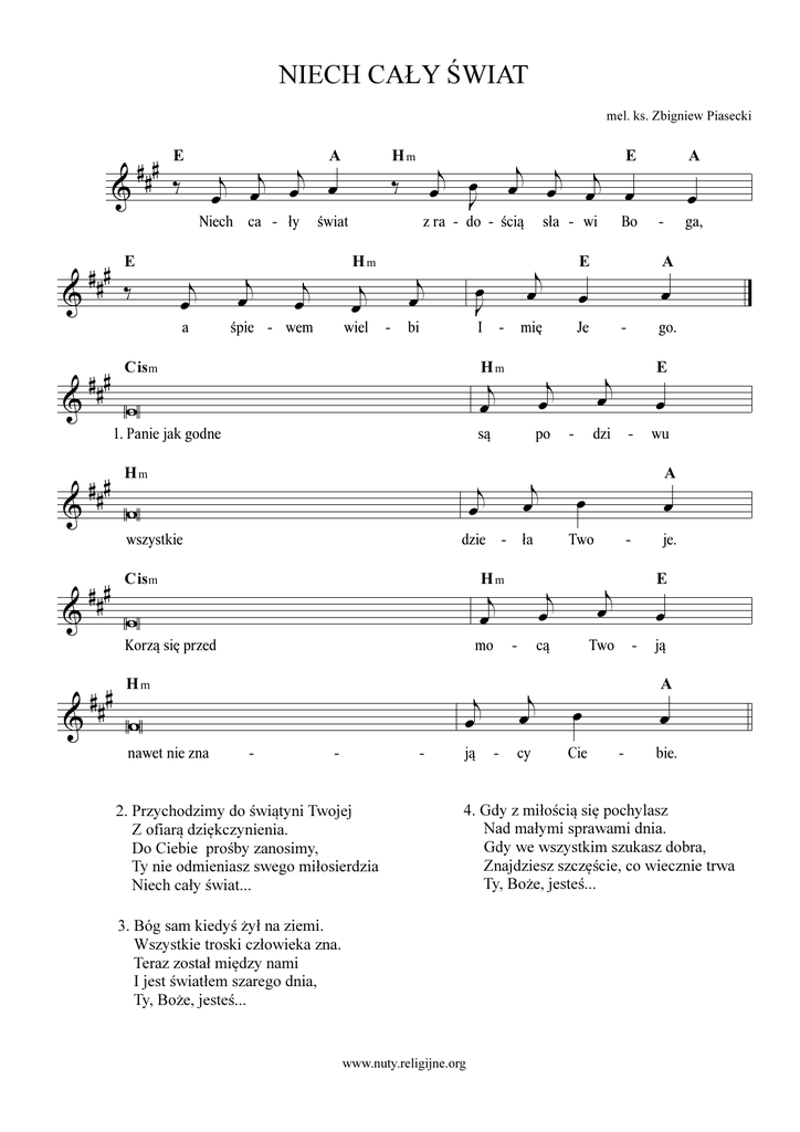 NIECH CAŁY ŚWIAT mel. ks. Zbigniew Piasecki # # # ‰E & j j œj œ œ œ A Niech ca - ły & ### E ‰ j œ a & ### j œ ‰ świat z ra - do - ścią j œ Hm j œ j œ śpie - wem wiel - œ J bi I Cis m W 1. Panie jak godne & ### & W & j œ œ mię Je Hm j œ j œ są po j œ mo - j œ Hm W - - - 2. Przychodzimy do świątyni Twojej Z ofiarą dziękczynienia. Do Ciebie prośby zanosimy, Ty nie odmieniasz swego miłosierdzia Niech cały świat... ją - E - œ - œ - cą Two Cie wu A j œ cy ga, go. œ œ - E dzi j œ œ œ j œ - A A j œ Hm W Bo Two j œ Cis m nawet nie zna sła - wi dzie - ła Korzą się przed ### - j œ Hm wszystkie ### j j j E œ œ œ œ j œ œ J Hm je. E œ - ją A œ - bie. 4. Gdy z miłością się pochylasz Nad małymi sprawami dnia. Gdy we wszystkim szukasz dobra, Znajdziesz szczęście, co wiecznie trwa Ty, Boże, jesteś... 3. Bóg sam kiedyś żył na ziemi. Wszystkie troski człowieka zna. Teraz został między nami I jest światłem szarego dnia, Ty, Boże, jesteś... www.nuty.religijne.org