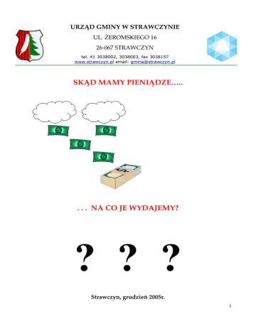 URZĄD GMINY W STRAWCZYNIE UL. ŻEROMSKIEGO 16 26-067 STRAWCZYN tel. 41 3038002, 3038003, fax 3038157 www.strawczyn.pl email: [email protected] SKĄD MAMY PIENIĄDZE….. . . . NA CO JE WYDAJEMY? ? ? ? Strawczyn, grudzień 2005r. 1 Szanowni Mieszkańcy gminy Strawczyn Każdy mieszkaniec gminy Strawczyn ma p r a w o znać budżet gminy. Książeczką, którą macie Państwo mieć w swoich rękach po raz pierwszy, chcemy przedstawić i przybliżyć gospodarkę finansową naszej gminy w 2005 r. Mamy świadomość, że to opracowanie z pewnością nie jest doskonałe. Jego celem jest nie tyle szczegółowe analizowanie wszystkich kwot w budżecie, co raczej przybliżenie Państwu pewnych zjawisk i wielkości związanych z wykonaniem budżetu. Jeżeli Państwo czują potrzebę uzyskania bardziej szczegółowych danych – to taką osobą, która wie wszystko na temat budżetu gminy jest Skarbnik Gminy i oczywiście Wójt Gminy. Niezaniechana zostanie dotychczasowa forma przekazywania informacji o budżecie gminy. Corocznie Wójt Gminy na zebraniach ogólnowiejskich przekazywał i nadal będzie przekazywał mieszkańcom informacje o budżecie gminy i jego wykonaniu. 2 CO TO JEST BUDŻET? i JAK PRZEDSTAWIA SIĘ BUDŻET GMINY STRAWCZYN NA 2005 ROK Budżet – plan finansowy, na podstawie którego gmina prowadzi gospodarkę finansową, uchwalony corocznie przez Radę Gminy. W budżecie spotykacie Państwo pojęcia tj. dochody – wydatki przychody – rozchody Są to pojęcia, które mają zdefiniowane znaczenie w ustawie o finansach publicznych. W gminie Strawczyn w 2005 roku wygląda, to tak: DOCHODY to pieniądze jakie planuje pozyskać gmina 20.771.381 zł PRZYCHODY to wszystkie zaciągane pożyczki i kredyty 1.872.295 zł WYDATKI to pieniądze przeznaczone na utrzymanie infrastruktury, obiektów w gminie oraz na inwestycje 18.965.748 zł ROZCHODY to spłaty zobowiązań pożyczek i kredytów 3.677.928 zł 3 SKĄD MAMY PIENIĄDZE? CZYLI DOCHODY GMINY W 2005 ROKU DOCHODY WŁASNE SUBWENCJE czyli czyli czyli to co sami gromadzimy albo to co otrzymujemy z to co otrzymujemy od otrzymujemy w postaci Ministerstwa Finansów Wojewody lub innych udziałów w podatkach DOTACJE instytucji dochodowych od osób fizycznych przekazywanych przez Ministerstwo Finansów lub od osób prawnych przekazywanych przez Urząd Skarbowy dochody własne gromadzimy na podstawie różnych ustaw i wolno nam je wydawać na co chcemy, ale w granicach prawa i na cele, które należą do zadań gminy 4 subwencje – to pula pieniędzy należnej gminie z budżetu państwa wg określonego kryterium z budżetu państwa i wydajemy je zgodnie z potrzebami dotacje – mają określone przeznaczenie i nie wolno przeznaczać na co innego. Nie na wszystkie dochody Gmina ma bezpośredni wpływ. Są takie, które nie zależą od nas. Dochody te przekazywane są przez Urzędy Skarbowe i Ministerstwo Finansów. Do nich należą min.: ! • udziały we wpływach z podatku dochodowego od osób prawnych • udziały we wpływach z podatku dochodowego od osób fizycznych • podatek od działalności gospodarczej opłacony w formie karty • podatek od czynności cywilnoprawnych • podatek od spadków i darowizn ! 5 FUNDUSZE UNII EUROPEJSKIEJ Co planujemy uzyskać? Wejście Polski do Unii Europejskiej dało nam możliwość pozyskiwania środków ze źródeł zagranicznych. Fundusze Unijne są wykorzystywane na ściśle określony cel i podlegają bardzo szczegółowemu rozliczeniu. Co planujemy uzyskać z Unii Europejskiej? Plan dochodów na 2005 rok w zakresie pozyskania środków unijnych przedstawia się następująco: • budowa kanalizacji - 1.294.455 zł • rozbudowa i modernizacja oczyszczalni ścieków - 1.355.844 zł • przebudowa dróg gminnych - 2.785.093 zł W sumie z Unii Europejskiej planujemy otrzymać 5.435.392 zł 5.435.392 zł 6 CO SAMI GROMADZIMY, CZYLI WYSOKOŚĆ DOCHODÓW WŁASNYCH Wpływy z różnych opłat (w złotych polskich) 393.583 Wpływy z mienia komunalnego wpływy z opłat administracyjnych wpływy z opłat za wydanie pozwolenia na sprzedaż alkoholu wpłaty na budowę kanalizacji i podłączenie do sieci 102.327 6.500 121.250 77.600 wodociągowej pozostałe opłaty i środki z innych źródeł 85.906 Dochody podstawowe - 2.878.866 udziały we wpływach z podatku dochodowego od osób 9.500 prawnych udziały we wpływach z podatku dochodowego od osób 1.383.207 fizycznych podatek rolny 204.648 podatek leśny 30.499 podatek od nieruchomości 984.858 podatek od środków transportowych 181.430 podatek od działalności gospodarczej opłacony w formie karty 8.000 podatkowej podatek od czynności cywilnoprawnych 43.000 wpływy z opłaty skarbowej 18.000 odsetki od nieterminowych wpłat podatków i pozostałe 9.524 podatek od spadków i darowizn 6.200 Czyli razem to daje: 3.272.449 zł. 7 TO CO OTRZYMUJEMY ! DOTACJA Planowana kwota dotacji 3.340.100 SUBWENCJE Planowana kwota 8.723.440 w tym: część oświatowa 5.637.851 część wyrównawcza 2.934.957 część równoważąca 150.632 ŚRODKI UNII EUROPEJSKIEJ Planowana kwota 5.435.392 Czyli razem to daje 20.771.381 Do tego zamierzamy pożyczyć RAZEM: 1.872.295 22.643.676 Tak wyglądają nasze zaplanowane dochody i przychody. Ta kwota ma wystarczyć na cały rok 2005 8 NA CO JE WYDAJEMY WYDATKI BUDŻETU GMINY NA 2005 ROK. W celu realizacji zadań nałożonych na gminę powołane są jednostki organizacyjne, które wykonują te zadania. W naszej gminie są to: 1. Urząd Gminy 2. Gminny Ośrodek Pomocy Społecznej (GOPS) 3. Gminny Ośrodek Kultury (GOK) 4. Zakład Gospodarki Komunalnej (ZGK ) 5. Zespół Obsługi Szkół (ZOS) 6. Zespoły Placówek Oświatowych (ZPO) 7. Szkoły Podstawowe (SP) 8. PRZEDSZKOLE 9. Samorządowy Zakład Opieki Zdrowotnej (SZOZ) Są to jednostki tworzone i nadzorowane przez Gminę. 9 NA JAKIE CELE JEDNOSTKI WYDAJĄ PIENIĄDZE? 1. Urząd Gminy w tym na wydatki inwestycyjne 8.855.942 46,69% 5.919.049 - rozbudowa i modernizacja oczyszczalni ś
