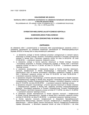 DSP. 1132/ 1/20/2016 OGŁOSZENIE NR 20/2016 konkursu ofert o udzielenie zamówienia na udzielanie świadczeń zdrowotnych z dnia 08 sierpnia 2016r. Na podstawie art. 26 ustawy z dnia 15 kwietnia 2011 r. o działalności leczniczej (t. j. Dz. U. 2015 poz.618) DYREKTOR WIELOSPECJALISTYCZNEGO SZPITALA SAMODZIELNEGO PUBLICZNEGO ZAKŁADU OPIEKI ZDROWOTNEJ W NOWEJ SOLI ZAPRASZA do składania ofert i uczestniczenia w konkursie ofert poprzedzającym zawarcie umów o udzielenie zamówienia na udzielanie świadczeń zdrowotnych w Wielospecjalistycznym Szpitalu SPZOZ w Nowej Soli w niżej określonych zakresach : 1. 2. 3. 4. 5. 6. 7. w dziedzinie urologii w formie realizacji procedur urologicznych w ramach dyżuru dziennego w Dziale Urologii, leczenia i konsultacji pacjentów w Poradni Urologicznej szpitala w Nowej Soli z terminem zawarcia umów od dnia 01.09.2016r. do dnia 31.08.2018r - z zamiarem zawarcia 2(dwóch) umów , w dziedzinie urologii w formie dyżurów dziennych w Dziale Urologii, leczenia i konsultacji pacjentów w Poradni Urologicznej szpitala w Nowej Soli z terminem zawarcia umowy od dnia 01.11.2016r. do dnia 31.10.2018r- z zamiarem zawarcia 1(jednej) umowy, w dziedzinie anestezjologii i intensywnej terapii w formie dyżurów dziennych, nocnych, świątecznych w Dziale Anestezjologii i Intensywnej Terapii, Bloku Operacyjnym oraz na terenie pozostałych oddziałów szpitalnych szpitala w Nowej Soli z terminem zawarcia umowy od dnia 01.10.2016r. do dnia 30.09.2018r. – z zamiarem zawarcia 1jednej) umowy, w dziedzinie ortopedii i traumatologii w formie dyżurów dziennych w Dziale Urazowo – Ortopedycznym szpitala w Nowej Soli, leczenia i konsultacji pacjentów w Poradni Ortopedycznej, Poradni Prelukascyjnej Wad Postawy z terminem zawarcia umów od dnia 01.10.2016r. do dnia 30.09.2018r. - z zamiarem zawarcia 1(jednej) umowy , w dziedzinie ortopedii i traumatologii w formie dyżurów dziennych w Dziale Urazowo – Ortopedycznym szpitala w Nowej Soli ,realizacji procedur endoprotezoplastyki, leczenia i konsultacji pacjentów w Poradni Ortopedycznej, Poradni Prelukascyjnej Wad Postawy z terminem zawarcia umowy od dnia 01.11.2016r. do dnia 31.10.2018r. - z zamiarem zawarcia 1(jednej) umowy, w dziedzinie chorób wewnętrznych w formie dyżurów nocnych i świątecznych w Dziale Chorób Wewnętrznych szpitala w Nowej Soli z terminem zawarcia umowy od dnia 01.09.2016r. do dnia 31.08.2018r. – z zamiarem zawarcia 1(jednej) umowy, w formie dyżurów nocnych, świątecznych w Zespołach Specjalistycznych Ratownictwa Medycznego, dyżurów nocnych, świątecznych w Szpitalnym Oddziale Ratunkowym – obszar ogólny, obszar chirurgiczny, Nocna i Świąteczna Podstawowa Opieka Zdrowotna z terminem zawarcia umów od dnia 01.09.2016 r. do dnia 11 31.08.2017r. i od dnia 01.10.2016 do dnia 30.09.2017r. – z zamiarem zawarcia 7 umów , 8. w formie dyżurów dziennych, dyżurów nocnych, świątecznych w Dziale Neurochirurgii i Neurotraumatologii szpitala w Nowej Soli, leczenia i konsultacji pacjentów w Poradni Neurochirurgicznej z terminem zawarcia umowy od dnia 01.11.2016r. do dnia 31.10.2018r. – z zamiarem zawarcia 1(jednej)umowy, 9. w dziedzinie ginekologii i położnictwa w formie dyżurów nocnych, świątecznych w Dziale Położniczo – Ginekologicznym szpitala w Nowej Soli z terminem zawarcia umowy od dnia 01.10.2016r. do dnia 30.09.2018r. - z zamiarem zawarcia 1(jednej) umowy , 10. w dziedzinie ginekologii i położnictwa w zakresie realizacji procedur zamkniętych i otwartych formie dyżurów dziennych, nocnych, świątecznych w Dziale Położniczo – Ginekologicznym, leczenia i konsultacji pacjentów w Poradni Ginekologicznej szpitala w Nowej Soli z terminem zawarcia umowy od dnia 01.10.2016r. do dnia 30.09.2018r. - z zamiarem zawarcia 1(jednej) umowy , 11. w dziedzinie chorób wewnętrznych, endokrynologii i diabetologii w formie dyżurów dziennych, nocnych, świątecznych w Dziale Chorób Wewnętrznych szpitala w Nowej Soli z terminem zawarcia umowy od dnia 01.09.2016r. do dnia 31.08.2018r. – z zamiarem zawarcia 1(jednej) umowy 12. w dziedzinie radiologii i diagnostyki obrazowej w formie realizacji procedur radiologicznych w formie dyżuru dziennego w Szpitalnym Zakładzie Radiologii szpitala w Nowej Soli z terminem zawarcia umowy od dnia 01.10.2016r. do dnia 30.09.2018r. – z zamiarem zawarcia 1(jednej) umowy , 13. w dziedzinie radiologii i diagnostyki obrazowej w formie realizacji procedur radiologicznych w formie dyżuru dziennego, dyżurów w gotowości w Szpitalnym Zakładzie Radiologii szpitala w Nowej Soli z terminem zawarcia umowy od dnia 01.09.2016r. do dnia 31.10.2018r. – z zamiarem zawarcia 2(dwóch) umów, 14. w dziedzinie patomorfologii w zakresie realizacji badań i procedur w formie dyżuru dziennego w Szpitalnym Zakładzie Patomorfologii szpitala w Nowej Soli z terminem zawarcia umowy od dnia 01.11.2016r. do dnia 31.10.2018r. - z zamiarem zawarcia 1 (jednej) umowy, 15. w dziedzinie chorób wewnętrznych i kardiologii w formie dyżurów dziennych, nocnych, świątecznych w Dziale Kardiologicznym, leczenia i konsultacji pacjentów w Poradni Kardiologicznej szpitala w Nowej Soli, opisów procedur o nazwie: angiografia TK/ badanie kardiologiczne TK ( także z podaniem z podaniem środka kontrastowego) , TK – badanie wielofazowe innej okolicy anatomicznej, TK badanie innej okolicy anatomicznej – bez środka kontrastowego wykonywanych w Szpitalnym Zakładzie Radiologii szpitala w Nowej Soli z terminem zawarcia umowy od dnia 01.10.2016r. do dnia 30.09.2018r. – z zamiarem zawarcia 1 (jednej) umowy , 16. w formie realizacji procedur: „ablacja zaburzeń rytmu z wykorzystaniem systemu elektroanatomicznego 3D”, krioablacja balonowa w migotaniu przedsionków w Szpitalnym Zakładzie Hemodynamiki szpitala w Nowej Soli z terminem zawarcia umowy od dnia 01.11.2016r. do dnia 31.10.2018r. - z zamiarem zawarcia 1(jednej) umowy , 17. w formie dyżurów dziennych, nocnych, 