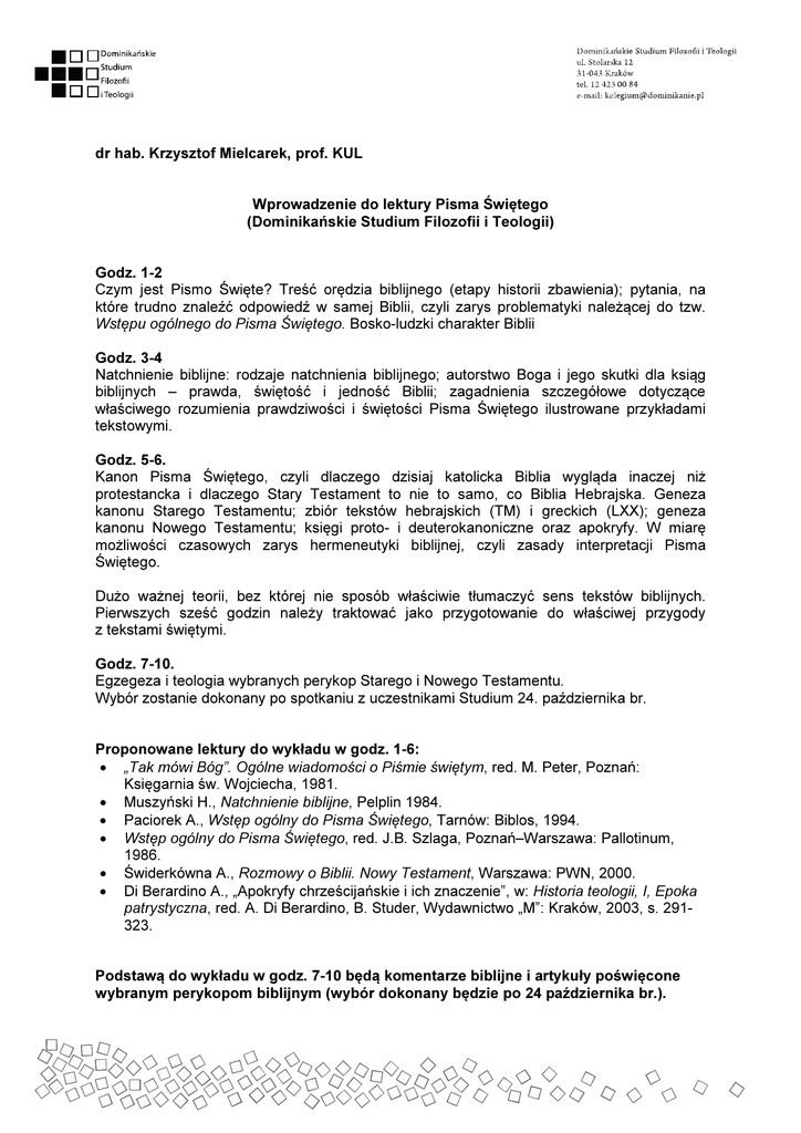 dr hab. Krzysztof Mielcarek, prof. KUL Wprowadzenie do lektury Pisma Świętego (Dominikańskie Studium Filozofii i Teologii) Godz. 1-2 Czym jest Pismo Święte? Treść orędzia biblijnego (etapy historii zbawienia); pytania, na które trudno znaleźć odpowiedź w samej Biblii, czyli zarys problematyki należącej do tzw. Wstępu ogólnego do Pisma Świętego. Bosko-ludzki charakter Biblii Godz. 3-4 Natchnienie biblijne: rodzaje natchnienia biblijnego; autorstwo Boga i jego skutki dla ksiąg biblijnych – prawda, świętość i jedność Biblii; zagadnienia szczegółowe dotyczące właściwego rozumienia prawdziwości i świętości Pisma Świętego ilustrowane przykładami tekstowymi. Godz. 5-6. Kanon Pisma Świętego, czyli dlaczego dzisiaj katolicka Biblia wygląda inaczej niż protestancka i dlaczego Stary Testament to nie to samo, co Biblia Hebrajska. Geneza kanonu Starego Testamentu; zbiór tekstów hebrajskich (TM) i greckich (LXX); geneza kanonu Nowego Testamentu; księgi proto- i deuterokanoniczne oraz apokryfy. W miarę możliwości czasowych zarys hermeneutyki biblijnej, czyli zasady interpretacji Pisma Świętego. Dużo ważnej teorii, bez której nie sposób właściwie tłumaczyć sens tekstów biblijnych. Pierwszych sześć godzin należy traktować jako przygotowanie do właściwej przygody z tekstami świętymi. Godz. 7-10. Egzegeza i teologia wybranych perykop Starego i Nowego Testamentu. Wybór zostanie dokonany po spotkaniu z uczestnikami Studium 24. października br. Proponowane lektury do wykładu w godz. 1-6: • „Tak mówi Bóg”. Ogólne wiadomości o Piśmie świętym, red. M. Peter, Poznań: Księgarnia św. Wojciecha, 1981. • Muszyński H., Natchnienie biblijne, Pelplin 1984. • Paciorek A., Wstęp ogólny do Pisma Świętego, Tarnów: Biblos, 1994. • Wstęp ogólny do Pisma Świętego, red. J.B. Szlaga, Poznań–Warszawa: Pallotinum, 1986. • Świderkówna A., Rozmowy o Biblii. Nowy Testament, Warszawa: PWN, 2000. • Di Berardino A., „Apokryfy chrześcijańskie i ich znaczenie”, w: Historia teologii, I, Epoka patrystyczna, red. A. Di Berardino, B. Studer, Wydawnictwo „M”: Kraków, 2003, s. 291323. Podstawą do wykładu w godz. 7-10 będą komentarze biblijne i artykuły poświęcone wybranym perykopom biblijnym (wybór dokonany będzie po 24 października br.).