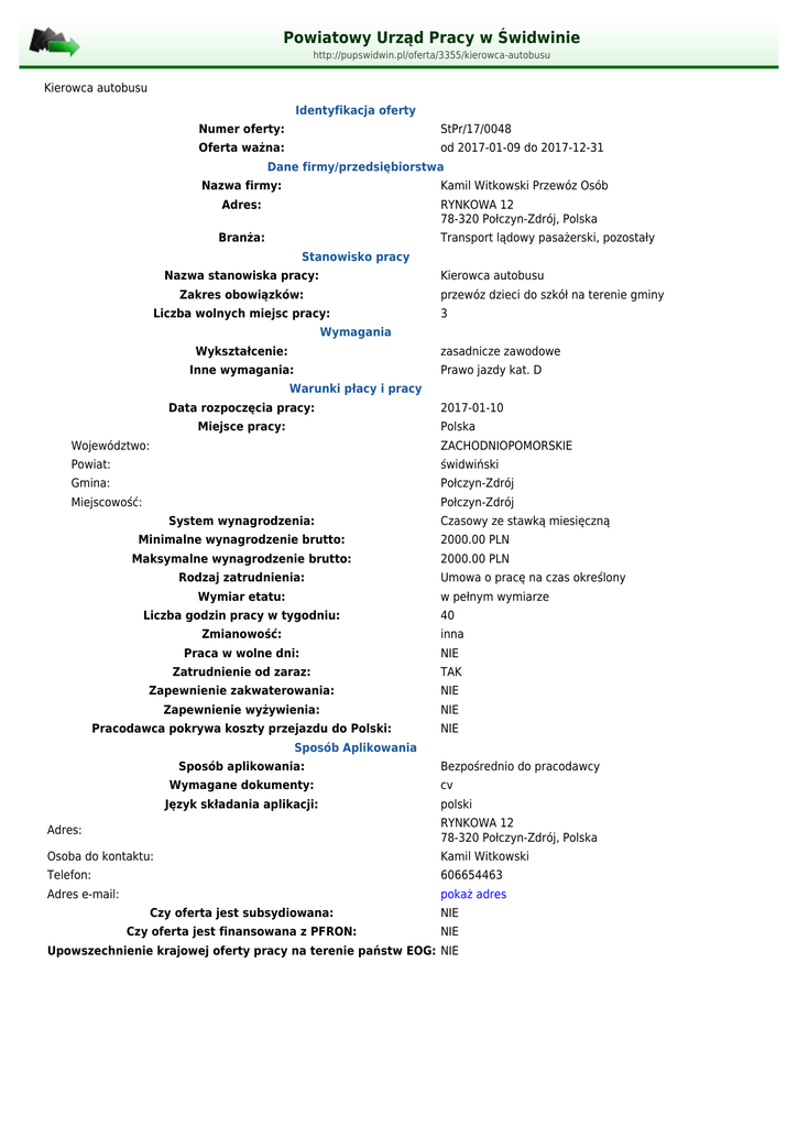 Powiatowy Urząd Pracy w Świdwinie http://pupswidwin.pl/oferta/3355/kierowca-autobusu Kierowca autobusu Identyfikacja oferty Numer oferty: StPr/17/0048 Oferta ważna: od 2017-01-09 do 2017-12-31 Dane firmy/przedsiębiorstwa Nazwa firmy: Kamil Witkowski Przewóz Osób Adres: RYNKOWA 12 78-320 Połczyn-Zdrój, Polska Branża: Transport lądowy pasażerski, pozostały Stanowisko pracy Nazwa stanowiska pracy: Kierowca autobusu Zakres obowiązków: przewóz dzieci do szkół na terenie gminy Liczba wolnych miejsc pracy: 3 Wymagania Wykształcenie: zasadnicze zawodowe Inne wymagania: Prawo jazdy kat. D Warunki płacy i pracy Data rozpoczęcia pracy: Miejsce pracy: 2017-01-10 Polska Województwo: ZACHODNIOPOMORSKIE Powiat: świdwiński Gmina: Połczyn-Zdrój Miejscowość: Połczyn-Zdrój System wynagrodzenia: Czasowy ze stawką miesięczną Minimalne wynagrodzenie brutto: 2000.00 PLN Maksymalne wynagrodzenie brutto: 2000.00 PLN Rodzaj zatrudnienia: Wymiar etatu: Umowa o pracę na czas określony w pełnym wymiarze Liczba godzin pracy w tygodniu: 40 Zmianowość: inna Praca w wolne dni: NIE Zatrudnienie od zaraz: TAK Zapewnienie zakwaterowania: NIE Zapewnienie wyżywienia: NIE Pracodawca pokrywa koszty przejazdu do Polski: NIE Sposób Aplikowania Sposób aplikowania: Wymagane dokumenty: Język składania aplikacji: Bezpośrednio do pracodawcy cv polski Adres: RYNKOWA 12 78-320 Połczyn-Zdrój, Polska Osoba do kontaktu: Kamil Witkowski Telefon: 606654463 Adres e-mail: pokaż adres Czy oferta jest subsydiowana: NIE Czy oferta jest finansowana z PFRON: NIE Upowszechnienie krajowej oferty pracy na terenie państw EOG: NIE
