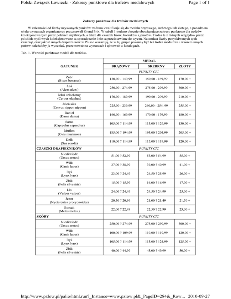 Polski Związek Łowiecki - Zakresy punktowe dla trofeów medalowych Page 1 of 1 Zakresy punktowe dla trofeów medalowych W zaleŜności od liczby uzyskanych punktów trofeum kwalifikuje się do medalu brązowego, srebrnego lub złotego, a ponadto na wielu wystawach organizatorzy przyznawali Grand Prix. W tabeli 1 podano obecnie obowiązujące zakresy punktowe dla trofeów kolekcjonowanych przez polskich myśliwych, a takŜe dla czaszek lisów, borsuków i jenotów. Trofea te z róŜnych względów przez polskich myśliwych kolekcjonowane są sporadycznie i nie są przedstawiane do wycen. Natomiast liczby pozyskiwanych tych zwierząt, oraz jakość innych drapieŜników w Polsce wskazują, Ŝe w tej grupie powinny być teŜ trofea medalowe i wzorem innych państw naleŜałoby je wyceniać, prezentować na wystawach i ujmować w katalogach. Tab. 1. Wartości punktowe medali dla trofeów. MEDAL GATUNEK BRĄZOWY SREBRNY ZŁOTY PUNKTY CIC śubr (Bison bonasus) 130,00 - 140,99 150,00 - 169,99 170,00 + Łoś (Alces alces) 250,00 - 274,99 275,00 - 299,99 300,00 + Jeleń szlachetny (Cervus elaphus) 170,00 - 189,99 190,00 - 209,99 210,00 + Jeleń sika (Cervus nippon nippon) 225,00 - 239,99 240,00 - 254, 99 255,00 + Daniel (Dama dama) 160,00 - 169,99 170,00 - 179,99 180,00 + Sarna (Capreolus capreolus) 105,00 ? 114,99 115,00 ? 129,99 130,00 + Muflon (Ovis musimon) 185,00 ? 194,99 195,00 ? 204,99 205,00 + Dzik (Sus scrofa) 110,00 ? 114,99 115,00 ? 119,99 120,00 + CZASZKI DRAPIEśNIKÓW PUNKTY CIC Niedźwiedź (Ursus arctos) 51,00 ? 52,99 53,00 ? 54,99 55,00 + Wilk (Canis lupus) 37,00 ? 38,99 39,00 ? 40,99 41,00 + Ryś (Lynx lynx) 23,00 ? 24,49 24,50 ? 25,99 26,00 + śbik (Felis silvestris) 15,00 ? 15,99 16,00 ? 16,99 17,00 + Lis (Vulpes vulpes) 24,00 ? 24,49 24,50 ? 24,99 25,00 + Jenot (Nyctereutes procyonoides) 20,50 ? 20,99 21,00 ? 21,49 21,50 + Borsuk (Meles meles ) 22,00 ? 22,49 22,50 ? 22,99 23,00 + SKÓRY PUNKTY CIC Niedźwiedź (Ursus arctos) 250,00 ? 274,99 275,00 ? 299,99 300,00 + Wilk (Canis lupus) 100,00 ? 109,99 110,00 ? 119,99 120,00 + Ryś (Lynx lynx) 105,00 ? 114,99 115,00 ? 124,99 125,00 + śbik (Felis silvestris) 40,00 ? 44,99 45,00 ? 49,99 50,00 + http://www.pzlow.pl/palio/html.run?_Instance=www.pzlow.pl&_PageID=284&_Row... 2010-09-27