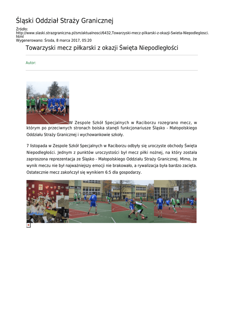 Śląski Oddział Straży Granicznej Źródło: http://www.slaski.strazgraniczna.pl/sm/aktualnosci/6432,Towarzyski-mecz-pilkarski-z-okazji-Swieta-Niepodleglosci. html Wygenerowano: Środa, 8 marca 2017, 05:20 Towarzyski mecz piłkarski z okazji Święta Niepodległości Autor: W Zespole Szkół Specjalnych w Raciborzu rozegrano mecz, w którym po przeciwnych stronach boiska stanęli funkcjonariusze Śląsko - Małopolskiego Oddziału Straży Granicznej i wychowankowie szkoły. 7 listopada w Zespole Szkół Specjalnych w Raciborzu odbyły się uroczyste obchody Święta Niepodległości. Jednym z punktów uroczystości był mecz piłki nożnej, na który została zaproszona reprezentacja ze Śląsko - Małopolskiego Oddziału Straży Granicznej. Mimo, że wynik meczu nie był najważniejszy emocji nie brakowało, a rywalizacja była bardzo zacięta. Ostatecznie mecz zakończył się wynikiem 6:5 dla gospodarzy.
