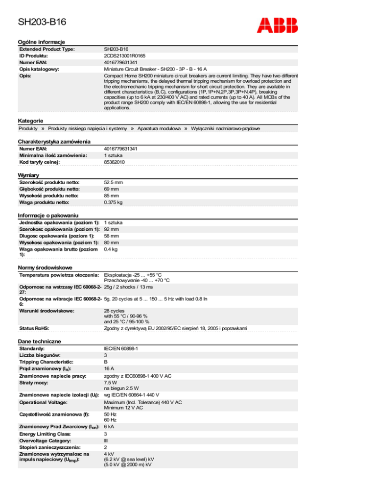 SH203-B16 Ogólne informacje Extended Product Type: ID Produktu: Numer EAN: Opis katalogowy: Opis: SH203-B16 2CDS213001R0165 4016779631341 Miniature Circuit Breaker - SH200 - 3P - B - 16 A Compact Home SH200 miniature circuit breakers are current limiting. They have two different tripping mechanisms, the delayed thermal tripping mechanism for overload protection and the electromechanic tripping mechanism for short circuit protection. They are available in different characteristics (B,C), configurations (1P,1P+N,2P,3P,3P+N,4P), breaking capacities (up to 6 kA at 230/400 V AC) and rated currents (up to 40 A). All MCBs of the product range SH200 comply with IEC/EN 60898-1, allowing the use for residential applications. Kategorie Produkty » Produkty niskiego napięcia i systemy » Aparatura modułowa » Wyłączniki nadmiarowo-prądowe Charakterystyka zamówienia Numer EAN: Minimalna ilość zamówienia: Kod taryfy celnej: 4016779631341 1 sztuka 85362010 Wymiary Szerokość produktu netto: Głębokość produktu netto: Wysokość produktu netto: Waga produktu netto: 52.5 mm 69 mm 85 mm 0.375 kg Informacje o pakowaniu Jednostka opakowania (poziom 1): Szerokosc opakowania (poziom 1): Dlugosc opakowania (poziom 1): Wysokosc opakowania (poziom 1): Waga opakowania brutto (poziom 1): 1 sztuka 92 mm 58 mm 80 mm 0.4 kg Normy środowiskowe Temperatura powietrza otoczenia: Eksploatacja -25 ... +55 °C Przechowywanie -40 ... +70 °C Odpornosc na wstrzasy IEC 60068-2- 25g / 2 shocks / 13 ms 27: Odpornosc na wibracje IEC 60068-2- 5g, 20 cycles at 5 ... 150 ... 5 Hz with load 0.8 In 6: Warunki środowiskowe: 28 cycles with 55 °C / 90-96 % and 25 °C / 95-100 % Status RoHS: Zgodny z dyrektywą EU 2002/95/EC sierpień 18, 2005 i poprawkami Dane techniczne Standardy: Liczba biegunów: Tripping Characteristic: Prąd znamionowy (In): Znamionowe napiecie pracy: Straty mocy: IEC/EN 60898-1 3 B 16 A zgodny z IEC60898-1 400 V AC 7.5 W na biegun 2.5 W Znamionowe napiecie izolacji (Ui): wg IEC/EN 60664-1 440 V Operational Voltage: Maximum (Incl. Tolerance) 440 V AC Minimum 12 V AC Częstotliwość znamionowa (f): 50 Hz 60 Hz Znamionowy Prad Zwarciowy (Icn): 6 kA Energy Limiting Class: 3 Overvoltage Category: III Stopień zanieczyszczenia: 2 Znamionowa wytrzymalosc na 4 kV impuls napieciowy (Uimp): (6.2 kV @ sea level) kV (5.0 kV @ 2000 m) kV Dielectric Test Voltage: Material obudowy: Typ napędu: Actuator Marking: Contact Position Indication: Stopień ochrony: Remarks: Electrical Endurance: Trwalosc Mechaniczna: Typ terminala: Screw Terminal Type: Connecting Capacity: Momenty dokrecajace: Recommended Screw Driver: Montaż na szynie DIN: Pozycja montażu: 50 / 60 Hz, 1 min: 2 kV Insulation Group II, RAL 7035 Insulation group II, black, sealable I /O ON / OFF IP20 IP40 in enclosure with cover 20000 AC cycle 20000 cycle Screw Terminals Cage Terminal Elastyczny z tulejką 0.75 ... 25 mm² Elastyczny 0.75 ... 25 mm² Sztywny 0.75 ... 25 mm² Skrętka 0.75 ... 25 mm² 2 N·m Pozidriv 2 TH35-7.5 (Szyna montażowa 35 x 7.5 mm) wg IEC 60715 TH35-15 (Szyna montazowa 35 x 15 mm) wg IEC 60715 Any Certyfikaty i deklaracje (Numer dokumentu) Deklaracja zgodności - CE: Dane RoHS: 2CDK403003D0401 2CDK400003K0201 Classifications eClass: ETIM 4.0: ETIM 5.0: Kod klasyfikacji: UNSPSC: 7.0 27141901 EC000042 - Miniature circuit breaker (MCB) EC000042 - Miniature circuit breaker (MCB) F 39121614