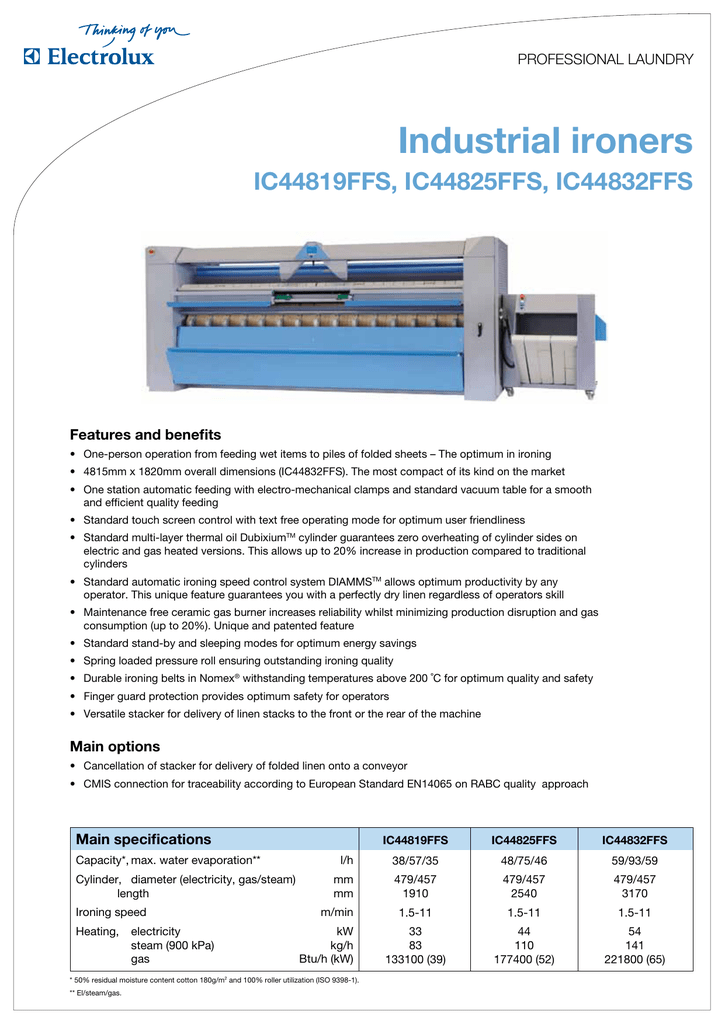 PROFESSIONAL LAUNDRY Industrial ironers IC44819FFS, IC44825FFS, IC44832FFS Features and benefits • One-person operation from feeding wet items to piles of folded sheets – The optimum in ironing • 4815mm x 1820mm overall dimensions (IC44832FFS). The most compact of its kind on the market • One station automatic feeding with electro-mechanical clamps and standard vacuum table for a smooth and efficient quality feeding • Standard touch screen control with text free operating mode for optimum user friendliness • Standard multi-layer thermal oil DubixiumTM cylinder guarantees zero overheating of cylinder sides on electric and gas heated versions. This allows up to 20% increase in production compared to traditional cylinders • Standard automatic ironing speed control system DIAMMSTM allows optimum productivity by any operator. This unique feature guarantees you with a perfectly dry linen regardless of operators skill • Maintenance free ceramic gas burner increases reliability whilst minimizing production disruption and gas consumption (up to 20%). Unique and patented feature • Standard stand-by and sleeping modes for optimum energy savings • Spring loaded pressure roll ensuring outstanding ironing quality • Durable ironing belts in Nomex® withstanding temperatures above 200 ˚C for optimum quality and safety • Finger guard protection provides optimum safety for operators • Versatile stacker for delivery of linen stacks to the front or the rear of the machine Main options • Cancellation of stacker for delivery of folded linen onto a conveyor • CMIS connection for traceability according to European Standard EN14065 on RABC quality approach Main specifications Capacity*,max. water evaporation** Cylinder, diameter (electricity, gas/steam) length Ironing speed Heating, electricity steam (900 kPa) gas IC44819FFS IC44825FFS IC44832FFS l/h 38/57/35 48/75/46 59/93/59 mm mm 479/457 1910 479/457 2540 479/457 3170 m/min 1.5-11 1.5-11 1.5-11 33 83 133100 (39) 44 110 177400 (52) 54 141 221800 (65) kW kg/h Btu/h (kW) * 50% residual moisture content cotton 180g/m2 and 100% roller utilization (ISO 9398-1). ** El/steam/gas. IC44819FFS Electrical connections IC44825FFS IC44832FFS Heating Voltage 400-415V 3AC 50 Hz kW(A) 35.7 (63) 46 (80) 56.8 (100) Gas, steam 400-415V 3AC 50 Hz kW(A) 2.9 (16) 2.9 (16) 3.2 (16) 20 900 10 20 20 900 10 20 2000/2500 3700/5000 160 900 200 6/8 550-700 2000/2500 3700/5000 160 1000 200 6/8 550-700 El Steam, gas and air connections Steam Rec. steam pressure Condensate Gas Gas pressure, natural gas (G20/G25) propane (G31) Air outlet Evacuated air Pressure drop Compressed air Rec. air pressure DN kPa DN DN Pa Pa ø mm m3/h max. Pa mm kPa 20 900 10 20 2000/2500 3700/5000 160 780 200 6/8 550-700 Sound levels Airborne sound level dB(A) 65 65 65 3 3 3 Heat emission % of installed power, max. Shipping data Ironer mass Shipping volume, ironer net, kg crated, kg m3 1405 1700 7.6 1545 1890 9.2 1715 2075 10.7 Stacker mass Shipping volume, stacker net, kg crated, kg m3 175 345 2.9 175 345 2.9 175 345 2.9 mm mm 1100 1910 1100 2540 1100 3170 mm mm 900 3500 900 3500 900 3500 Dimensions in mm A Width B Depth C Height D E F G H J K 3555 1820 1590 2575 980 1090 1030 675 90 500 4185 1820 1590 3205 980 1090 1030 675 90 500 4815 1820 1590 3835 980 1090 1030 675 90 500 Dimensions for automatic feeding Minimum Maximum Dimensions for automatic folding Minimum Maximum* 1 2 3 4 Control panel Exhaust connection Steam connection Condensate connection 5 Electrical connection 6 Compressed air connection 7 Gas connection * Recommended for most textiles. May vary depending on textile thickness and nature. Right side view Front view Top view Production in items per hour Electric/Gas Textile quality RM* IC44819FFS IC44825FFS IC44832FFS 110 110 160 - 115 135 50/50 polyester-cotton sheet, 3000 x 1800 mm 140 gr/m2 35% 50/50 polyester-cotton sheet, 2900 x 2400 mm 140 gr/m2 35% 100% cotton sheet, 3000 x 2800 mm 160 gr/m2 50% - - 80 100% cotton table cloth, 2000 x 1500 mm 260 gr/m2 55% 62 80 80 IC44832FFS Production in items per hour Steam (9 bar) Textile quality RM* IC44819FFS IC44825FFS 110 110 200 - 115 155 50/50 polyester-cotton sheet, 3000 x 1800 mm 140 gr/m2 35% 50/50 polyester-cotton sheet, 2900 x 2400 mm 140 gr/m2 35% 100% cotton sheet, 3000 x 2800 mm 160 gr/m2 50% - - 95 100% cotton table cloth, 2000 x 1500 mm 260 gr/m2 55% 75 95 95 * RM: Residual Moisture before ironing Above production figures correspond to the machine capacity. They can vary with the efficiency of the operator and are achieved with 300 mm between items at feeding. Multi-layer thermal oil DubixiumTM cylinder guarantees smooth operation at all times thanks to zero overheating of sides. Automatic ironing speed adjustment systems DIAMMSTM is based on real moisture of the items. Unique and patented. Share more of our thinking at www.electrolux.com We reserve the right to alter specifications without notice. Art. No. 438903501/01 09.15 www.electrolux.com/laundrysystems
