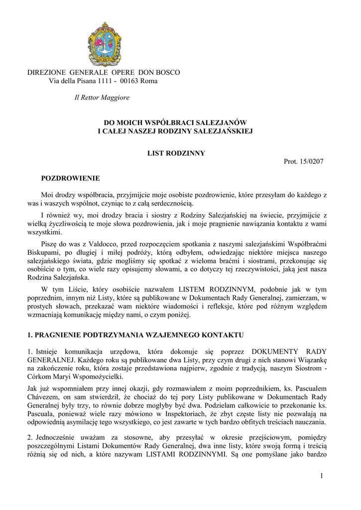 DIREZIONE GENERALE OPERE DON BOSCO Via della Pisana 1111 - 00163 Roma Il Rettor Maggiore DO MOICH WSPÓŁBRACI SALEZJANÓW I CAŁEJ NASZEJ RODZINY SALEZJAŃSKIEJ LIST RODZINNY Prot. 15/0207 POZDROWIENIE Moi drodzy współbracia, przyjmijcie moje osobiste pozdrowienie, które przesyłam do każdego z was i waszych wspólnot, czyniąc to z całą serdecznością. I również wy, moi drodzy bracia i siostry z Rodziny Salezjańskiej na świecie, przyjmijcie z wielką życzliwością te moje słowa pozdrowienia, jak i moje pragnienie nawiązania kontaktu z wami wszystkimi. Piszę do was z Valdocco, przed rozpoczęciem spotkania z naszymi salezjańskimi Współbraćmi Biskupami, po długiej i miłej podróży, którą odbyłem, odwiedzając niektóre miejsca naszego salezjańskiego świata, gdzie mogliśmy się spotkać z wieloma braćmi i siostrami, przekonując się osobiście o tym, co wiele razy opisujemy słowami, a co dotyczy tej rzeczywistości, jaką jest nasza Rodzina Salezjańska. W tym Liście, który osobiście nazwałem LISTEM RODZINNYM, podobnie jak w tym poprzednim, innym niż Listy, które są publikowane w Dokumentach Rady Generalnej, zamierzam, w prostych słowach, przekazać wam niektóre wiadomości i refleksje, które pod różnym względem wzmacniają komunikację między nami, o czym poniżej. 1. PRAGNIENIE PODTRZYMANIA WZAJEMNEGO KONTAKTU 1. Istnieje komunikacja urzędowa, która dokonuje się poprzez DOKUMENTY RADY GENERALNEJ. Każdego roku są publikowane dwa Listy, przy czym drugi z nich stanowi Wiązankę na zakończenie roku, która zostaje przedstawiona najpierw, zgodnie z tradycją, naszym Siostrom Córkom Maryi Wspomożycielki. Jak już wspomniałem przy innej okazji, gdy rozmawiałem z moim poprzednikiem, ks. Pascualem Chávezem, on sam stwierdził, że chociaż do tej pory Listy publikowane w Dokumentach Rady Generalnej były trzy, to równie dobrze mogłyby być dwa. Podzielam całkowicie to przekonanie ks. Pascuala, ponieważ wiele razy mówiono w Inspektoriach, że zbyt częste listy nie pozwalają na odpowiednią asymilację tego wszystkiego, co jest zawarte w tych bardzo obfitych treściach nauczania. 2. Jednocześnie uważam za stosowne, aby przesyłać w okresie przejściowym, pomiędzy poszczególnymi Listami Dokumentów Rady Generalnej, dwa inne listy, które swoją formą i treścią różnią się od nich, a które nazywam LISTAMI RODZINNYMI. Są one pomyślane jako bardzo 1 rodzinny sposób dzielenia się wiadomościami, prostymi refleksjami o życiu, marzeniach i różnych wydarzeniach. Zwykle będą się ukazywać w miesiącach kwiecień-maj i w październiku. 3. Na zakończenie, korzystając z nowych technologii oraz dostępności filmów i innych środków, pozwalających dotrzeć błyskawicznie do każdej części świata, pomyśleliśmy wspólnie z Dykasterią ds. Komunikacji Społecznej Zgromadzenia, że byłoby bardzo odpowiednie, gdybym wszedł w bardzo bliski kontakt z wami, czyniąc to poprzez zarejestrowane pozdrowienie i przesłanie w pięciominutowym filmiku, który opatrzyliśmy tytułem „Drodzy Współbracia”. A jako, że jest to krótki film, będzie można go umieścić w sieciach społecznościowych, umożliwiając szybki i bezpośredni kontakt z tematyką, jaka wiązać się będzie z daną okolicznością. Ten przekaz o nazwie „Drodzy Współbracia” ma jako swoich bezpośrednich odbiorców moich współbraci salezjanów (SDB), ponieważ uważam, że jest konieczne, abym był obecny pośród Salezjanów Księdza Bosko najczęściej, jak tylko to jest możliwe; ta obecność będzie mogła być dobrze przyjęta i wykorzystana z pożytkiem przez całą naszą Rodzinę Salezjańską. Reasumując. Tym, co zasadniczo przyświeca tej inicjatywie, jest pragnienie podtrzymania kontaktu i możliwie jak najczęstsze nasze SPOTKANIE SIĘ na żywo w ciągu roku i za pośrednictwem środków, o których mówiłem. Na koniec chcę wyrazić moją wdzięczność za trud, jaki podjęli Dykasteria ds. Komunikacji Społecznej i Radcy Regionalni, ponieważ – oprócz Dokumentów Rady Generalnej, które są publikowane w sześciu językach – także wszystko inne, czy to LISTY RODZINNE i wideo („Drodzy Współbracia”), czy też wideokomentarz do Wiązanki, jest publikowane w 20 językach. Jest to świadomy wybór, który pozwala na dotarcie jak największej ilości wiadomości w ojczystych językach, ułatwiając wzajemne poznanie i bliskość w relacjach. 2. WYDARZENIE NAPRAWDĘ WYJĄTKOWE I HISTORYCZNE: CAŁA RODZINA SALEZJAŃSKA ŚWIAT NA VALDOCCO Przełożone i Przełożeni Generalni wszystkich Zgromadzeń z naszej Rodziny Salezjańskiej, Przełożeni Instytutów Życia Konsekrowanego, Przewodniczący, Koordynatorki i Koordynatorzy na poziomie światowym wszystkich Grup z naszej Rodziny Salezjańskiej, przeżyli wyjątkowy i historyczny moment. Informacje na temat tego wydarzenia były przekazywane bezpośrednio i na bieżąco w tych dniach (31 stycznia i 1 lutego br.). Teraz chciałbym jedynie podkreślić WYJĄTKOWE I HISTORYCZNE znaczenie, jakie miało to spotkanie. Zostali zaproszeni wszyscy Przełożeni Generalni trzydziestu Grup, które przynależą prawnie do naszej Rodziny Salezjańskiej, aby przeżywać razem wokół Księdza Bosko, w miejscach salezjańskich na Valdocco i Becchi, nasze bycie synami i córkami tego samego charyzmatycznego Ojca. Chcieliśmy trwać w zjednoczeniu i w komunii, modlić się razem i wyrazić na wiele sposbów naszą przynależność do tego wielkiego drzewa, jakim jest nasza Rodzina Salezjańska ze swoim wspólnym pniem: Księdzem Bosko i charyzmatem salezjańskim. Bycie razem było bardzo przyjemne. Odwiedziliśmy razem nasze „święte miejsca salezjańskie” w Becchi, na Colle Don Bosco, w Chieri i na Valdocco. Odnowiliśmy nasze zaangażowanie i wierność posłannictwu na rzecz młodzieży świata, zwłaszcza najuboższej, opuszczonej i wykluczonej, miało miejsce „wyznanie wiary chrze