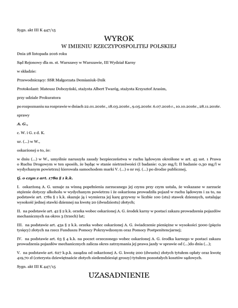 Sygn. akt III K 447/15 WYROK W IMIENIU RZECZYPOSPOLITEJ POLSKIEJ Dnia 28 listopada 2016 roku Sąd Rejonowy dla m. st. Warszawy w Warszawie, III Wydział Karny w składzie: Przewodniczący: SSR Małgorzata Demianiuk-Dzik Protokolant: Mateusz Dobczyński, stażysta Albert Twaróg, stażysta Krzysztof Arasim, przy udziale Prokuratora po rozpoznaniu na rozprawie w dniach 22.01.2016r., 18.03.2016r., 9.05.2016r. 6.07.2016 r., 10.10.2016r., 28.11.2016r. sprawy A. G., c. W. i G. z d. K. ur. (...) w W., oskarżonej o to, że: w dniu (...) w W., umyślnie naruszyła zasady bezpieczeństwa w ruchu lądowym określone w art. 45 ust. 1 Prawa o Ruchu Drogowym w ten sposób, że będąc w stanie nietrzeźwości (I badanie: 0,30 mg/l; II badanie 0,30 mg/l w wydychanym powietrzu) kierowała samochodem marki V. (...) o nr rej. (...) po drodze publicznej, tj. o czyn z art. 178a § 1 k.k. I. oskarżoną A. G. uznaje za winną popełnienia zarzucanego jej czynu przy czym ustala, że wskazane w zarzucie stężenie dotyczy alkoholu w wydychanym powietrzu i że oskarżona prowadziła pojazd w ruchu lądowym i za to, na podstawie art. 178a § 1 k.k. skazuje ją i wymierza jej karę grzywny w liczbie 100 (stu) stawek dziennych, ustalając wysokość jednej stawki dziennej na kwotę 20 (dwudziestu) złotych; II. na podstawie art. 42 § 2 k.k. orzeka wobec oskarżonej A. G. środek karny w postaci zakazu prowadzenia pojazdów mechanicznych na okres 3 (trzech) lat; III. na podstawie art. 43a § 2 k.k. orzeka wobec oskarżonej A. G. świadczenie pieniężne w wysokości 5000 (pięciu tysięcy) złotych na rzecz Funduszu Pomocy Pokrzywdzonym oraz Pomocy Postpenitencjarnej; IV. na podstawie art. 63 § 4 k.k. na poczet orzeczonego wobec oskarżonej A. G. środka karnego w postaci zakazu prowadzenia pojazdów mechanicznych zalicza okres zatrzymania jej prawa jazdy w sprawie od (...)do dnia (...); V. na podstawie art. 627 k.p.k. zasądza od oskarżonej A. G. kwotę 200 (dwustu) złotych tytułem opłaty oraz kwotę 419,70 zł (czterysta dziewiętnaście złotych siedemdziesiąt groszy) tytułem pozostałych kosztów sądowych. Sygn. akt III K 447/15 UZASADNIENIE Na podstawie zebranego i ujawnionego na rozprawie głównej materiału dowodowego Sąd ustalił następujący stan faktyczny: w dniu (...) ok. godz. (...) A. G. kierując samochodem osobowym V. (...) o nr rej. (...) wyjechała z miejsca zamieszkania udając się do pracy. Oskarżona kierując pojazdem znajdowała się w stanie nietrzeźwości. Ok. godz. (...) jadąc Aleją (...) została zatrzymana przez funkcjonariuszy Policji do kontroli. Oskarżoną poddano badaniu na zwartość alkoholu w wydychanym powietrzu A. I.. Pierwsze badanie o godz. (...) wykazało 0,30 mg/l, drugie o godz. (...) - 0,30 mg/ l alkoholu w wydychanym powietrzu. Oskarżona została następnie poddana badaniu urządzeniem stacjonarnym Alkomat A 2.0, gdzie badanie w pierwszym pomiarze o godz. (...) wykazało 0,15 mg/l , a w drugim pomiarze o godz. (...) – 0,14 mg/ l w wydychanym powietrzu. Oskarżona do protokołu badania podała, że spożywała piwo w ilości 1 litra o godz. (...) poprzedniego dnia. Oskarżonej zostało zatrzymane prawo jazdy kat B. Powyższy stan faktyczny Sąd ustalił w oparciu o: częściowe wyjaśnienia oskarżonej A. G. (k. 154-155), zeznania świadka I. K. (k. 9v), protokół użycia alkosensora wraz z wydrukami (k.2-2v), protokół użycia alkomatu wraz z wydrukami (k.4-4v), świadectw wzorcowania (k.3-3v, 5-5v), opinię pisemną i ustną uzupełniająca biegłego z zakresu toksykologii Z. W. (k. 162-172, 196-200). Oskarżona przyznała się do popełnienia zarzucanego jej czynu i złożyła wyjaśnienia. Sąd dał wiarę wyjaśnieniom oskarżonej poza kwestią jej przekonania o stanie trzeźwości. Wyjaśnienia oskarżonej w tym względzie są sprzeczne nie tylko z wynikami badań alkosensorem i alkomatem, ale także zasadami logiki i doświadczenia życiowego. Jak wynika bowiem z wyjaśnień samej oskarżonej poprzedniego dnia do późnych godzin wieczornych spożywała ona alkohol, a następnie zaledwie po kilku godzinach prowadziła pojazd. Nadto z opinii biegłego Z. W. wynika, że niewiarygodne jest, aby osoba, która sporadycznie – okazjonalnie spożywa alkohol, nie odczuwała skutków jego spożycia mając stężenie alkoholu na poziomie 0,30 mg/l w wydychanym powietrzu. Przekonanie oskarżonej o stanie swojej trzeźwości stanowi jedynie przyjętą przez nią linię obrony, mającą na celu złagodzenie jej winy. Nadto nie zasługują na wiarę wyjaśnienia oskarżonej co do okoliczności spożywania alkoholu. Są one w tym względzie sprzeczne z opinią biegłego, albowiem biegły wskazał, że przy takich jak podała oskarżona czasie i ilości spożytego alkoholu o godz. (...), kiedy została poddana pierwszemu badaniu winna mieć już wynik 0,00 alkoholu w wydychanym powietrzu, tymczasem oskarżona jeszcze przy kolejnych badaniach, już urządzeniem stacjonarnym, o godz. (...) i (...) wykazywała wynik 0.15 i 0.14 m/l alkoholu w wydychanym powietrzu. Sąd w całości obdarzył wiarą zeznania świadka I. K., gdyż są one logiczne i korelują z wyjaśnieniami oskarżonej, a także znajdują potwierdzenie w dowodzie z badania aloksensorem i alkomatem. Świadek zetknęła się z oskarżoną w ramach pełnienia czynności służbowych, nie miał żadnych motywów, aby zeznawać niezgodnie z prawdą. Sąd jako pełną, rzetelną i fachową ocenił opinię biegłego z zakresu toksykologii Z. W.. Biegły w sposób obszerny i szczegółowy odniósł się do postawionego mu przez Sąd pytania, wyjaśniając możliwe przyczyny tożsamości dwóch pierwszych wyników badań jak i kwestię spadku zawartości alkoholu w wydychanym powietrzu podczas badania alkomatem. W ten sam sposób należało ocenić uzupełniającą ustną opinię biegłego. W ocenie Sądu brak było podstaw, aby kwestionować autentyczność, czy wartość dowodową pozostałych dokument
