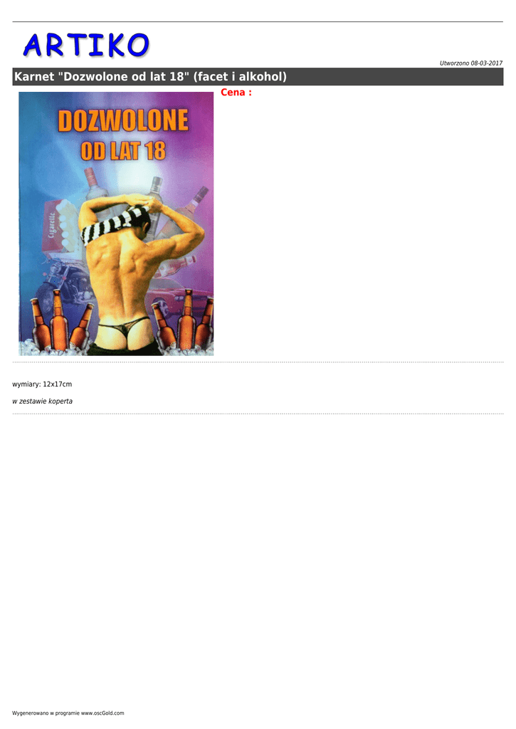 Utworzono 08-03-2017 Karnet "Dozwolone od lat 18" (facet i alkohol) Cena : wymiary: 12x17cm w zestawie koperta Wygenerowano w programie www.oscGold.com