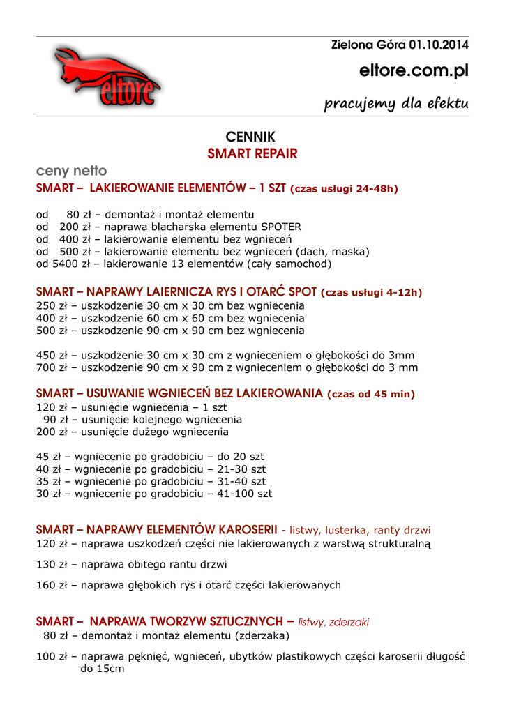 Zielona Góra 01.10.2014 eltore.com.pl pracujemy dla efektu CENNIK SMART REPAIR ceny netto SMART – LAKIEROWANIE ELEMENTÓW – 1 SZT (czas usługi 24-48h) od 80 zł – demontaż i montaż elementu od 200 zł – naprawa blacharska elementu SPOTER od 400 zł – lakierowanie elementu bez wgnieceń od 500 zł – lakierowanie elementu bez wgnieceń (dach, maska) od 5400 zł – lakierowanie 13 elementów (cały samochod) SMART – NAPRAWY LAIERNICZA RYS I OTARĆ SPOT (czas usługi 4-12h) 250 zł – uszkodzenie 30 cm x 30 cm bez wgniecenia 400 zł – uszkodzenie 60 cm x 60 cm bez wgniecenia 500 zł – uszkodzenie 90 cm x 90 cm bez wgniecenia 450 zł – uszkodzenie 30 cm x 30 cm z wgnieceniem o głębokości do 3mm 700 zł – uszkodzenie 90 cm x 90 cm z wgnieceniem o głębokości do 3 mm SMART – USUWANIE WGNIECEŃ BEZ LAKIEROWANIA (czas od 45 min) 120 zł – usunięcie wgniecenia – 1 szt 90 zł – usunięcie kolejnego wgniecenia 200 zł – usunięcie dużego wgniecenia 45 40 35 30 zł zł zł zł – – – – wgniecenie wgniecenie wgniecenie wgniecenie po po po po gradobiciu gradobiciu gradobiciu gradobiciu – – – – do 20 szt 21-30 szt 31-40 szt 41-100 szt SMART – NAPRAWY ELEMENTÓW KAROSERII - listwy, lusterka, ranty drzwi 120 zł – naprawa uszkodzeń części nie lakierowanych z warstwą strukturalną 130 zł – naprawa obitego rantu drzwi 160 zł – naprawa głębokich rys i otarć części lakierowanych SMART – NAPRAWA TWORZYW SZTUCZNYCH – listwy, zderzaki 80 zł – demontaż i montaż elementu (zderzaka) 100 zł – naprawa pęknięć, wgnieceń, ubytków plastikowych części karoserii długość do 15cm Zielona Góra 01.10.2014 eltore.com.pl pracujemy dla efektu SMART – SZYBY (czas usługi 1h) od 100 zł – uszkodzenie do średnicy 2 cm SMART – NAPRAWA TAPICEREK 80 zł – tapicerka materiałowa i welurowa - uszkodzenie do 2 cm 100 zł – tapicerka skórzana i winylowa - uszkodzenie do 2 cm, odtworzenie struktury 230 zł – tapicerka skórzana i winylowa - przywrócenie oryginalnej barwy 200 zł – naprawa obicia kierownicy 480 zł – naprawa fotela SMART – RENOWACJA FELG (cena za 1 szt) od 50 zł – lakierowanie felg stalowych od 150 zł – lakierowanie felg aluminiowych od 200 zł – polerowanie felg aluminiowych SMART – RENOWACJA LAMP (cena za 1 szt) 120 zł - renowacja kloszy lamp przednich lub tylnych (usuwanie rys i zamatowieo)