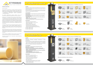 STYROBUD Uniwersal MYŚLIMY O WAS CIEPŁO Szanowni Państwo, Nasze wieloletnie doświadczenie w produkcji materiałów budowlanych pozwoliło nam stworzyć nowoczesny produkt, który zdobywa coraz większe uznanie wśród użytkowników. Dlatego prezentujemy Państwu Systemy Kominowe STYROBUD. Wykonane z materiałów kwasoodpornych i ognioodpornych zapewniających całkowite bezpieczeństwo i niezawodność działania. Do produkcji wykorzystujemy wyłącznie najlepsze surowce oraz komponenty, współpracując z najlepszymi firmami w kraju i za granicą. Producentem rur ceramicznych dla naszych Systemów Kominowych jest PD Refractories. To największa firma produkująca wyroby szamotowe w Europie Wschodniej. Jej początki sięgają jeszcze XIX wieku. Dzięki wysoko rozwiniętej technologii, PD Refractories buduje piece i kominy dla koksowni i hut, spełniając tym samym najwyższe wymagania dotyczące tego typu produktów. Od 1997 roku zakład ze Svitavy rozpoczął sprzedaż ceramicznych przewodów kominowych na wymagający rynek USA. W styczniu 2000 roku firma została członkiem międzynarodowej Grupy Preiss-Daimler. Amerykanie zainteresowali się tą ceramiką gdyż jej wyjątkowe właściwości tj. szczelność, termika i przede wszystkim wyjątkowa odporność na działanie kwasów powstających podczas spalania wszystkich paliw daje gwarancje całkowitego bezpieczeństwa przy niemalże nieograniczonej żywotności. Nasze Systemy Kominowe to wyroby nowej generacji, a zaproponowana oferta to niezawodny produkt, pewny serwis, kompetentni pracownicy współpracujący na co dzień z architektami, projektantami i wykonawcami. Nasi technolodzy posiadają bogatą wiedzą techniczną z zakresu techniki kominowej Systemy Kominowe STYROBUD otrzymały pozytywne opinie Instytutu Ceramiki i Materiałów Budowlanych potwierdzone Certyfikatami. Zapraszamy do zapoznania się z naszą ofertą i życzymy zadowolenia z naszych produktów. BUDOWA Wykonany jest z lekkich pustaków keramzytobetonowych, ceramicznych rur szamotowych izolowanych wełną mineralną, elementy metalowe wykonane z blachy kwasoodpornej. Komin jest wykonany ze specjalnie zaprojektowanych pustaków tworzących kanały przewiewne, które w sposób ciągły wentylują rury oraz wełnę zapewniając im w ten sposób najlepsze warunki pracy. ZASTOSOWANIE System Uniwersal – to komin trójwarstwowy (pustak, wełna mineralna, rura szamotowa) Przeznaczony jest do kotłów, pieców, kominków w tym do następujących rodzajów paliw: - stałych (drewno, węgiel, miał, eko groszek, koks, brykiet, pellet, itp.) - ciekłych – olej - gazowych – otwarta komora spalania - średnice kanału spalinowego: 140, 160, 180, 200, 250, 300 mm WŁAŚCIWOŚCI - zakres pracy w temperaturze do 600 °C - szybko wytwarza odpowiedni ciąg kominowy - odporny na pożar sadzy - odporny na działanie kwasów i wilgoci - przewidywana praca w podciśnieniu - możliwość stawiania na zewnątrz budynku - doskonale tłumi dźwięki wydostające się z kotłów - posiada europejskie certyfikaty CE zgodnie z normami: EN 13063-1 T600 N1 D3 G50 EN 13063-2 T600 N1 D3 G50 EN 13063-3 T600 N1 D3 G50 STYROBUD Turbo BUDOWA Wykonany jest z lekkich pustaków keramzytobetonowych, ceramicznych rur szamotowych, elementów metalowych wykonannych z blachy kwasoodpornej. Komin jest wykonany ze specjalnie zaprojektowanych pustaków tworzących kanały nawiewne, które w sposób ciągły dostarczają powietrze do paleniska – pieca co chroni urządzenia grzewcze przed awariami i ma zasadniczy wpływ na ich sprawność. Kanały nawiewne dostarczając powietrze do pieca jednocześnie osuszają rury utrzymując je w doskonałym stanie. ZASTOSOWANIE System Turbo – to komin warstwowy nieizolowany (pustak, dpowiednia rura szamotowa) Przeznaczony jest do następujących urządzeń i rodzajów paliw: - gazowych – zamknięta komora spalania w tym piece kondensacyjne - ciekłych – olej piece kondensacyjne - zalecany do domów jednorodzinnych ale też stosowany w budynkach wielokondygnacyjnych - możliwość podpięcia do 10 kotłów różnej mocy - średnice kanału spalinowego: 100, 140, 200, 250, 300 mm WŁAŚCIWOŚCI - zakres pracy w temperaturze do 200 °C - szybko wytwarza odpowiedni ciąg kominowy - odporny na działanie kwasów i wilgoci - możliwa praca w nadciśnieniu i podciśnieniu - możliwość stawiania na zewnątrz budynku - wysokość komina do 30 m - łatwy i szybki montaż - szczelny dzięki specjalnie dobranym rurom i uszczelkom - posiada europejskie certyfikaty CE zgodnie z normami: - EN 13063-2 T200 P1 W2 O50 - EN 13063-3 T200 P1 W2 O50 Elementy wchodzące w skład systemu STYROBUD Uniwersal Pustak kominowy Drzwiczki wyczystki Płyta czołowa Rura prosta Trójnik wyczystki Osłona stożka Otulina Kratka przewietrzająca Trójnik spalin 90° Mały ściek kondensatu Kit w proszku Stożek osłonowy Trójnik spalin 45° Duży ściek kondensatu Elementy dodatkowe lub zamienne Płyta wspornikowa Kratka nawiewna Daszek betonowy Daszek metalowy Elementy wchodzące w skład systemu STYROBUD Turbo Pustak kominowy Rura prosta Rozeta przyłącza powietrza Trójnik wyczystki / trójnik spalin Drzwiczki wyczystki Ściek kondensatu Osłona stożka Obejma z dystansami Uszczelka przyłącza spalin Stożek osłonowy Dekiel wyczystki Osłona ścieku kondensatu Kratka nawiewna Syfon kondensatu Kit w proszku Podstawa pod ściek kondensatu Elementy dodatkowe lub zamienne Daszek betonowy Płyta wspornikowa Pustaki kominowe i wentylacyjne Pustaki keramzytobetonowe dymowe Model Wymiary [cm] [wys./szer./dł.] Waga [kg] Średnica do rur fi [mm] Ilość na palecie [szt.] PK1/36 24x36x36 15 100 - 200 30 PK1/38 24x38x38 17 100 - 200 30 PK2 24x38x77 31,5 100 - 200 15 Pustaki keramzytobetonowe dymowe z kanałem wentylacyjnym Model Wymiary [cm] [wys./szer./dł.] Waga [kg] Średnica do rur fi [mm] Ilość na palecie [szt.] PKW/36 24x36x50 24,5 100 - 200 30 PKW/38 24x38x52 23,5 100 - 200 30 PKW2/38