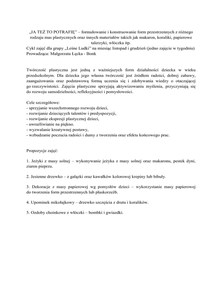 „JA TEŻ TO POTRAFIĘ” – formułowanie i konstruowanie form przestrzennych z różnego rodzaju mas plastycznych oraz innych materiałów takich jak makaron, koraliki, papierowe talerzyki, włóczka itp. Cykl zajęć dla grupy „Leśne Ludki” na miesiąc listopad i grudzień (jedno zajęcie w tygodniu) Prowadząca: Małgorzata Łęcka - Bonk Twórczość plastyczna jest jedną z ważniejszych form działalności dziecka w wieku przedszkolnym. Dla dziecka jego własna twórczość jest źródłem radości, dobrej zabawy, zaangażowania oraz podstawową formą uczenia się i zdobywania wiedzy o otaczającej go rzeczywistości. Zajęcia plastyczne sprzyjają aktywizowaniu myślenia, przyczyniają się do rozwoju samodzielności, refleksyjności i pomysłowości. Cele szczegółowe: - sprzyjanie wszechstronnego rozwoju dzieci, - rozwijanie dziecięcych talentów i predyspozycji, - rozwijanie ekspresji plastycznej dzieci, - uwrażliwianie na piękno. - wyzwalanie kreatywnej postawy, - wzbudzanie poczucia radości i dumy z tworzenia oraz efektu końcowego prac. Propozycje zajęć: 1. Jeżyki z masy solnej – wykonywanie jeżyka z masy solnej oraz makaronu, pestek dyni, ziaren pieprzu. 2. Jesienne drzewko – z gałązki oraz kawałków kolorowej krepiny lub bibuły. 3. Dekoracje z masy papierowej wg pomysłów dzieci – wykorzystanie masy papierowej do tworzenia form przestrzennych lub płaskorzeźb. 4. Upominek mikołajkowy – drzewko szczęścia z drutu i koralików. 5. Ozdoby choinkowe z włóczki – bombki i gwiazdki.