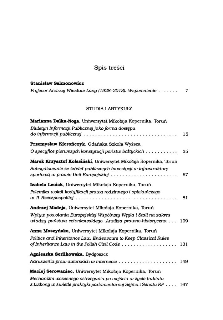 Spis treści Stanisław Salmonowicz Profesor Andrzej Wiesław Lang (1928-2013). Wspomnienie 7 STUDIA I ARTYKUŁY Marianna Dalka-Noga, Uniwersytet Mikołaja Kopernika, Toruń Biuletyn Informacji Publicznejjako forma dostępu do informacji publicznej 15 Przemysław Kierończyk, Gdańska Szkoła Wyższa O specyfice pierwszych konstytucji państw bałtyckich 35 Marek Krzysztof Kolasiński, Uniwersytet Mikołaja Kopernika, Toruń Subsydiowanie ze źródeł publicznych inwestycji w infrastrukturę sportową w prawie Unii Europejskiej 67 Izabela Leciak, Uniwersytet Mikołaja Kopernika, Tbruń Polemika wokół kodyfikacji prawa rodzinnego i opiekuńczego w II Rzeczpospolitej 81 Andrzej Madeja, Uniwersytet Mikołaja Kopernika, Toruń Wpływ powołania Europejskiej Wspólnoty Węgla i Stali na zakres wiładzy państwa członkowskiego. Analiza prawno-historyczna . . . 109 Anna Moszyńska, Uniwersytet Mikołaja Kopernika, Toruń Politics and Inheritance Law. Endeavours to Keep Classical Rules of Inheritance Law in the Polish Civil Code 131 Agnieszka Serlikowska, Bydgoszcz Naruszenia praw autorskich w Internecie 149 Maciej Serowaniec, Uniwersytet Mikołaja Kopernika, Tbruń Mechanizm wczesnego ostrzegania po wejściu w życie traktatu z Lizbony w świetle praktyki parlamentarnej Sejmu i Senatu RP . . . . 167 4 Spis treści Dalia Skutecka, Uniwersytet Gdański Prawne regulacje systemu monitorowania i kontroli jakości paliw w kontekście wybranych zagadnień kontroli działalności gospodarczej przedsiębiorców 197 Marta Szadkowska, Uniwersytet Mikołaja Kopernika, Tbruń Zabójstwo eutanatyczne - tendencje liberalizacyjne w Europie na przykładzie Belgii 221 Magdalena Wółkowska, Uniwersytet Mikołaja Kopernika, Toruń Prawa kulturalne w Europejskiej Konwencji Praw Człowieka. Analiza w oparciu o orzecznictwo Europejskiego Trybunału Praw Człowieka w Strasburgu 241 RECENZJE Danuta Janicka, Uniwersytet Mikołaja Kopernika, Toruń Moderne deutsche Strafrechtsdenker, red. Thomas Vormbaum, Springer, Berlin-Heidelberg 2011, ss. 379 263 Michał Piwnicki, Uniwersytet Mikołaja Kopernika, Tbruń Michał Przywara, System wyborczy do Sejmu i do Senatu RP po 1989 roku - ciągłość i zmiany, Wydawnictwo Sejmowe, Warszawa 2012, ss. 320 267 Tabel of contents Stanisław Salmonowicz 7 Profesor Andrzej Wiesław Lang (1928-2013). Obituary STUDIES AND ARTICLES Marianna Dalka-Noga, Nicolaus Copernicus University, Toruń 15 Public Information Bulletin as aform of access to public information . . Przemysław Kierończyk, College of Gdańsk About the Specificity of the First Constitutions of Baltic States 35 Marek Krzysztof Kolasiński, Nicolaus Copernicus University, Tbruń Aids Granted by the State to the Investments in Sport Infrastructure on the Basis of the European Union Law 67 Izabela Leciak, Nicolaus Copernicus University, Toruń Polemics around codification of family and tutelary law in II Republic of Poland 81 Andrzej Madeja, Nicolaus Copernicus University, Toruń The Implications of Instituting the European Coal and Steel Community for Powers of the Member-State. A Legal-Historical Perspective 109 Anna Moszyńska, Nicolaus Copernicus University, Toruń Politics and Inheritance Law. Endeavours to Keep Classical Rules of Inheritance Law in the Polish Civil Code 131 Agnieszka Serlikowska, Bydgoszcz Internet Copyright Infringements 149 Maciej Serowaniec, Nicolaus Copernicus University, Tbruń Early Warning System after the entry into force of the Lisbon Treaty under the parliamentary practice of Polish Sejm and Senate 167 6 Table of contents Dalia Skutecka, University of Gdańsk Legal regulation for system of monitoring and control offuels quality, selected issues related to the entrepreneur's control 197 Marta Szadkowska, Nicolaus Copernicus University, Toruń Euthanasia - the linearization trends in Europe. The case of proposed Belgian regulations 221 Magdalena Wółkowska, Nicolaus Copernicus University, Tbruń Cultural rights in the European Convention on Human Rights. Analysis based on case law of the European Court of Human Rights in Strasbourg 241 REVIEWS Danuta Janicka, Nicolaus Copernicus University, Toruń Moderne deutsche Strafrechtsdenker, red. Thomas Vormbaum, Springer, Berlin-Heidelberg 2011, ss. 379 263 Michał Piwnicki, Nicolaus Copernicus University, Toruń Michał Przywara, System wyborczy do Sejmu i do Senatu RP po 1989 roku - ciągłość i zmiany, Wydawnictwo Sejmowe, Warszawa 2012, ss. 320 267