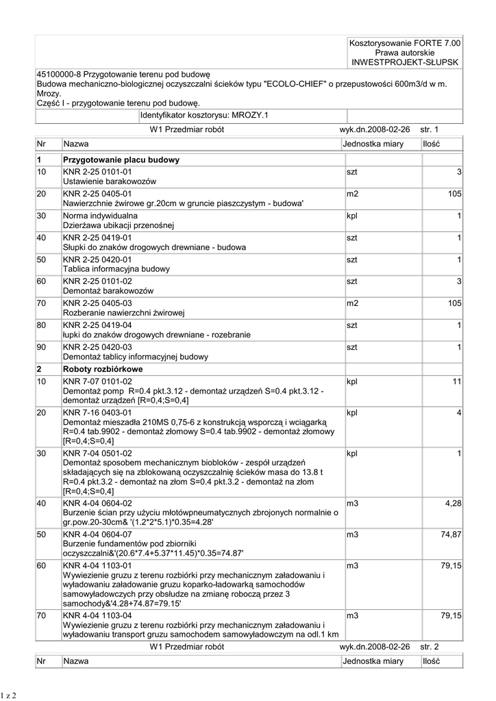 1z2 Kosztorysowanie FORTE 7.00 Prawa autorskie INWESTPROJEKT-SŁUPSK 45100000-8 Przygotowanie terenu pod budowę Budowa mechaniczno-biologicznej oczyszczalni ścieków typu "ECOLO-CHIEF" o przepustowości 600m3/d w m. Mrozy. Część I - przygotowanie terenu pod budowę. Identyfikator kosztorysu: MROZY.1 W1 Przedmiar robót Nr Nazwa 1 10 Przygotowanie placu budowy KNR 2-25 0101-01 Ustawienie barakowozów KNR 2-25 0405-01 Nawierzchnie Ŝwirowe gr.20cm w gruncie piaszczystym - budowa' 20 30 40 50 60 70 80 Norma indywidualna DzierŜawa ubikacji przenośnej KNR 2-25 0419-01 Słupki do znaków drogowych drewniane - budowa KNR 2-25 0420-01 Tablica informacyjna budowy KNR 2-25 0101-02 DemontaŜ barakowozów KNR 2-25 0405-03 Rozberanie nawierzchni Ŝwirowej KNR 2-25 0419-04 łupki do znaków drogowych drewniane - rozebranie wyk.dn.2008-02-26 str. 1 Jednostka miary Ilość szt 3 m2 105 kpl 1 szt 1 szt 1 szt 3 m2 105 szt 1 szt 1 90 KNR 2-25 0420-03 DemontaŜ tablicy informacyjnej budowy 2 10 Roboty rozbiórkowe kpl KNR 7-07 0101-02 DemontaŜ pomp R=0.4 pkt.3.12 - demontaŜ urządzeń S=0.4 pkt.3.12 demontaŜ urządzeń [R=0,4;S=0,4] kpl KNR 7-16 0403-01 DemontaŜ mieszadła 210MS 0,75-6 z konstrukcją wsporczą i wciągarką R=0.4 tab.9902 - demontaŜ złomowy S=0.4 tab.9902 - demontaŜ złomowy [R=0,4;S=0,4] KNR 7-04 0501-02 kpl DemontaŜ sposobem mechanicznym biobloków - zespół urządzeń składających się na zblokowaną oczyszczalnię ścieków masa do 13.8 t R=0.4 pkt.3.2 - demontaŜ na złom S=0.4 pkt.3.2 - demontaŜ na złom [R=0,4;S=0,4] KNR 4-04 0604-02 m3 Burzenie ścian przy uŜyciu młotówpneumatycznych zbrojonych normalnie o gr.pow.20-30cm& '(1.2*2*5.1)*0.35=4.28' KNR 4-04 0604-07 m3 Burzenie fundamentów pod zbiorniki oczyszczalni&'(20.6*7.4+5.37*11.45)*0.35=74.87' m3 KNR 4-04 1103-01 Wywiezienie gruzu z terenu rozbiórki przy mechanicznym załadowaniu i wyładowaniu załadowanie gruzu koparko-ładowarką samochodów samowyładowczych przy obsłudze na zmianę roboczą przez 3 samochody&'4.28+74.87=79.15' KNR 4-04 1103-04 m3 Wywiezienie gruzu z terenu rozbiórki przy mechanicznym załadowaniu i wyładowaniu transport gruzu samochodem samowyładowczym na odl.1 km W1 Przedmiar robót wyk.dn.2008-02-26 20 30 40 50 60 70 Nr Nazwa Jednostka miary 11 4 1 4,28 74,87 79,15 79,15 str. 2 Ilość 2z2 80 90 100 110 120 130 140 150 160 170 180 190 200 210 220 230 240 KNR 4-04 1103-05 Wywiezienie gruzu z terenu rozbiórki przy mechanicznym załadowaniu i wyładowaniu nakłady uzupełniające na kaŜdy dalszy rozpoczęty km odl.transportu ponad 1 km [S=9] KNNR 1 0209-04 Wykopy oraz przekopy wykonywane koparkami przedsiębiernymi na odkład o poj.łyŜki 0.25 m3, grunt kat.III&kan. '(45+15)*0.9*1.8=97.2'woda '30*0.9*1.5=40.5'razem '97.2+40.5=137.7' KNR 4-02 0232-02 DemontaŜ rury betonowej kielichowej o średnicy 200mm& KNR 4-02 0232-04 DemontaŜ rury betonowej kielichowej o średnicy 300mm KNR 405 tom I (na prawach norm zak’adowych) 0409-01 DemontaŜ studni rewizyjnych z kręgów betonowych w gotowym wykopie studnia z kręgów o średnicy 1000mm i głębokości 3mm KNR 405 tom I (na prawach norm zak’adowych) 0409-05 DemontaŜ studni rewizyjnych z kręgów betonowych w gotowym wykopie studnia z kręgów o średnicy 1500mm i głębokości 3mm KNR 405 tom I (na prawach norm zak’adowych) 0409-04 DemontaŜ studni rewizyjnych z kręgów betonowych w gotowym wykopie studnia z kręgów o średnicy 1200mm,za kaŜdy 1m róŜnicy głębokości KNR 4-02 0113-01 DemontaŜ w wykopie rurociągu Ŝeliwnego ciśnieniowego o średnicy 50mm,uszczelnienie ołowiem KNNR 1 0214-02 Zasypanie wykopów fundamentowych podłuŜnych,punktowych,rowów,wykopów obiektowych z zagęszczeniem mechanicznym spycharkami, gr.zagęszczanej warstwy w stanie luźnym 30 cm, kat.gruntu III-IV KNNR 6 0804-01 Rozebranie nawierzchni z kostki betonowej KNNR 6 0805-01 Rozebranie nawierzchni z płyt drogowych betonowych gr.12 cm, wypełnienie spoin piaskiem KNNR 6 0805-06 Rozebranie chodników z płyt betonowych o wym.50x50x7 cm na podsypce piaskowej KNNR 6 0806-01 Rozebranie krawęŜników betonowych na podsypce piaskowej KNNR 6 0806-08 Rozebranie obrzeŜy torowiskowych o wym.8x30 cm na podsypce piaskowej KNR 4-04 1103-01 Wywiezienie gruzu z terenu rozbiórki przy mechanicznym załadowaniu i wyładowaniu załadowanie gruzu koparko-ładowarką samochodów samowyładowczych przy obsłudze na zmianę roboczą przez 3 samochody&'650*0.14+350*0.15+170*0.05+320*0.15*0.3+150*0.3*0.08=170.' KNR 4-04 1103-04 Wywiezienie gruzu z terenu rozbiórki przy mechanicznym załadowaniu i wyładowaniu transport gruzu samochodem samowyładowczym na odl.1 km KNR 4-04 1103-05 Wywiezienie gruzu z terenu rozbiórki przy mechanicznym załadowaniu i wyładowaniu nakłady uzupełniające na kaŜdy dalszy rozpoczęty km odl.transportu ponad 1 km [S=9] ----- Koniec wydruku ----- m3 79,15 m3 137,7 m 35 m 25 kpl 1 kpl 2 m -4 m 30 m3 137,7 m2 650 m2 350 m2 170 m 320 m 150 m3 170 m3 170 m3 170