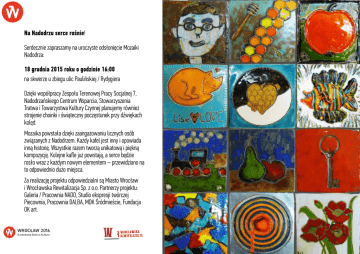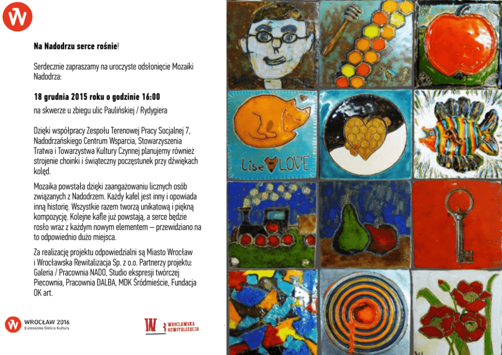 Na Nadodrzu serce rośnie! Serdecznie zapraszamy na uroczyste odsłonięcie Mozaiki Nadodrza: 18 grudnia 2015 roku o godzinie 16:00 na skwerze u zbiegu ulic Paulińskiej / Rydygiera Dzięki współpracy Zespołu Terenowej Pracy Socjalnej 7, Nadodrzańskiego Centrum Wsparcia, Stowarzyszenia Tratwa i Towarzystwa Kultury Czynnej planujemy również strojenie choinki i świąteczny poczęstunek przy dźwiękach kolęd. Mozaika powstała dzięki zaangażowaniu licznych osób związanych z Nadodrzem. Każdy kafel jest inny i opowiada inną historię. Wszystkie razem tworzą unikatową i piękną kompozycję. Kolejne kafle już powstają, a serce będzie rosło wraz z każdym nowym elementem – przewidziano na to odpowiednio dużo miejsca. Za realizację projektu odpowiedzialni są Miasto Wrocław i Wrocławska Rewitalizacja Sp. z o.o. Partnerzy projektu: Galeria / Pracownia NADO, Studio ekspresji twórczej Piecownia, Pracownia DALBA, MDK Śródmieście, Fundacja OK art.