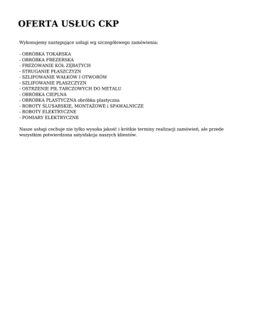 OFERTA USŁUG CKP Wykonujemy następujące usługi wg szczegółowego zamówienia: - OBRÓBKA TOKARSKA - OBRÓBKA FREZERSKA - FREZOWANIE KÓŁ ZĘBATYCH - STRUGANIE PŁASZCZYZN - SZLIFOWANIE WAŁKÓW I OTWORÓW - SZLIFOWANIE PŁASZCZYZN - OSTRZENIE PIŁ TARCZOWYCH DO METALU - OBRÓBKA CIEPLNA - OBRÓBKA PLASTYCZNA obróbka plastyczna - ROBOTY ŚLUSARSKIE, MONTAŻOWE i SPAWALNICZE - ROBOTY ELEKTRYCZNE - POMIARY ELEKTRYCZNE Nasze usługi cechuje nie tylko wysoka jakość i krótkie terminy realizacji zamówień, ale przede wszystkim potwierdzona satysfakcja naszych klientów.