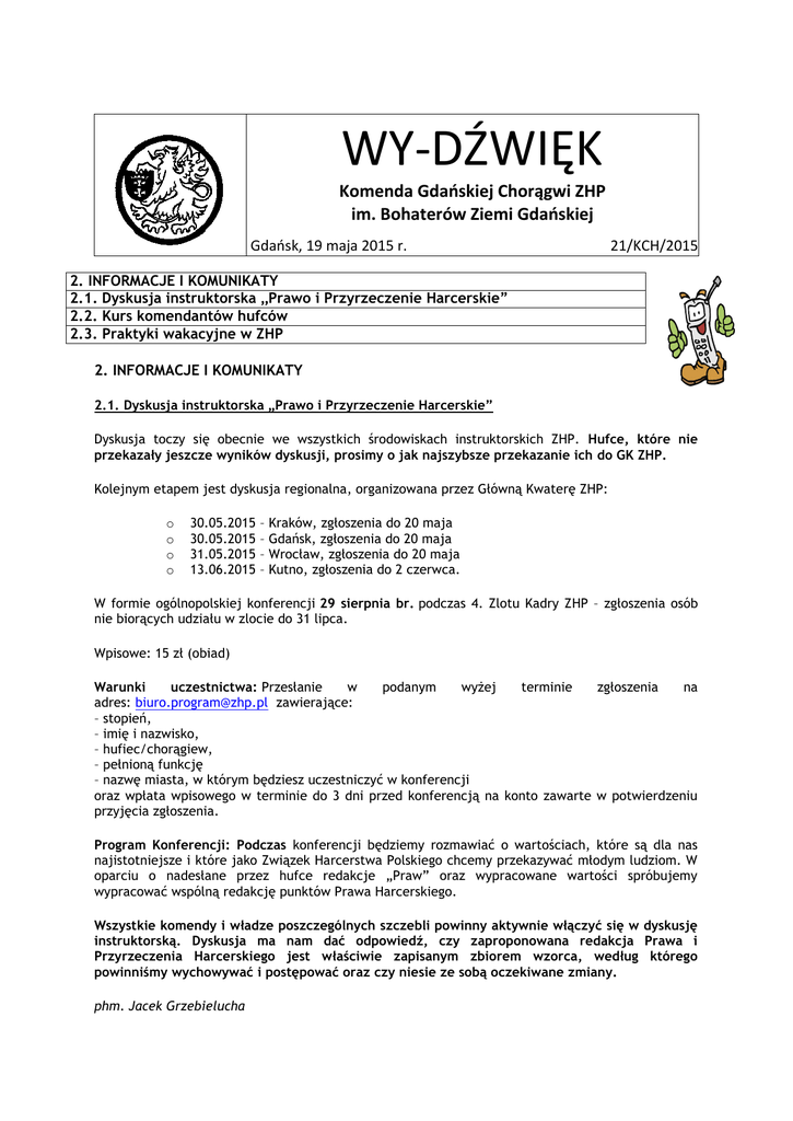WY-DŹWIĘK Komenda Gdańskiej Chorągwi ZHP im. Bohaterów Ziemi Gdańskiej Gdańsk, 19 maja 2015 r. 21/KCH/2015 2. INFORMACJE I KOMUNIKATY 2.1. Dyskusja instruktorska „Prawo i Przyrzeczenie Harcerskie” 2.2. Kurs komendantów hufców 2.3. Praktyki wakacyjne w ZHP 2. INFORMACJE I KOMUNIKATY 2.1. Dyskusja instruktorska „Prawo i Przyrzeczenie Harcerskie” Dyskusja toczy się obecnie we wszystkich środowiskach instruktorskich ZHP. Hufce, które nie przekazały jeszcze wyników dyskusji, prosimy o jak najszybsze przekazanie ich do GK ZHP. Kolejnym etapem jest dyskusja regionalna, organizowana przez Główną Kwaterę ZHP: o o o o 30.05.2015 30.05.2015 31.05.2015 13.06.2015 – Kraków, zgłoszenia do 20 maja – Gdańsk, zgłoszenia do 20 maja – Wrocław, zgłoszenia do 20 maja – Kutno, zgłoszenia do 2 czerwca. W formie ogólnopolskiej konferencji 29 sierpnia br. podczas 4. Zlotu Kadry ZHP – zgłoszenia osób nie biorących udziału w zlocie do 31 lipca. Wpisowe: 15 zł (obiad) Warunki uczestnictwa: Przesłanie w podanym wyżej terminie zgłoszenia na adres: [email protected] zawierające: – stopień, – imię i nazwisko, – hufiec/chorągiew, – pełnioną funkcję – nazwę miasta, w którym będziesz uczestniczyć w konferencji oraz wpłata wpisowego w terminie do 3 dni przed konferencją na konto zawarte w potwierdzeniu przyjęcia zgłoszenia. Program Konferencji: Podczas konferencji będziemy rozmawiać o wartościach, które są dla nas najistotniejsze i które jako Związek Harcerstwa Polskiego chcemy przekazywać młodym ludziom. W oparciu o nadesłane przez hufce redakcje „Praw” oraz wypracowane wartości spróbujemy wypracować wspólną redakcję punktów Prawa Harcerskiego. Wszystkie komendy i władze poszczególnych szczebli powinny aktywnie włączyć się w dyskusję instruktorską. Dyskusja ma nam dać odpowiedź, czy zaproponowana redakcja Prawa i Przyrzeczenia Harcerskiego jest właściwie zapisanym zbiorem wzorca, według którego powinniśmy wychowywać i postępować oraz czy niesie ze sobą oczekiwane zmiany. phm. Jacek Grzebielucha 2.2. Kurs komendantów hufców Informujemy, że termin zgłoszeń na kurs komendantów hufców upływa 25 maja 2015 r. Zapraszamy do aplikowania na kursy komendantów, skarbników i członków komend ds. organizacyjnych i programowych hufców. Więcej informacji na temat kursu znajduje się na stronie: http://www.gdanska.zhp.pl/index.php?main=1&sub=66&item=763 phm. Jacek Grzebielucha 2.3. Praktyki wakacyjne w ZHP Główna Kwatera ZHP po raz kolejny ogłasza ofertę praktyk wakacyjnych dla członków Związku Harcerstwa Polskiego! Zapraszamy studentów i absolwentów pragnących zdobyć cenne doświadczenie, nowe umiejętności i wiedzę na temat funkcjonowania największej organizacji wychowawczej w Polsce. Oferta jest przewidziana dla członków ZHP powyżej 18 roku życia, szukających doświadczenia zawodowego i rozwoju ścieżki instruktorskiej. Praktyki wakacyjne trwają dwa tygodnie. Młodzi specjaliści mogą rozwijać się w obszarze: promocji i komunikacji, analizy badań, administracji, finansów, kształcenia, IT i programu. To wyjątkowe przeżycie jest w Twoim zasięgu ręki! Nie zwlekaj – zgłoś się! Czekamy na Twoją ankietę do 7 czerwca. Więcej o praktykach można przeczytać na: http://zhp.pl/2015/spedz-dwa-tygodnie-w-glownejkwaterze-zhp-zglos-sie-na-wakacyjne-praktyki/ phm. Jacek Grzebielucha