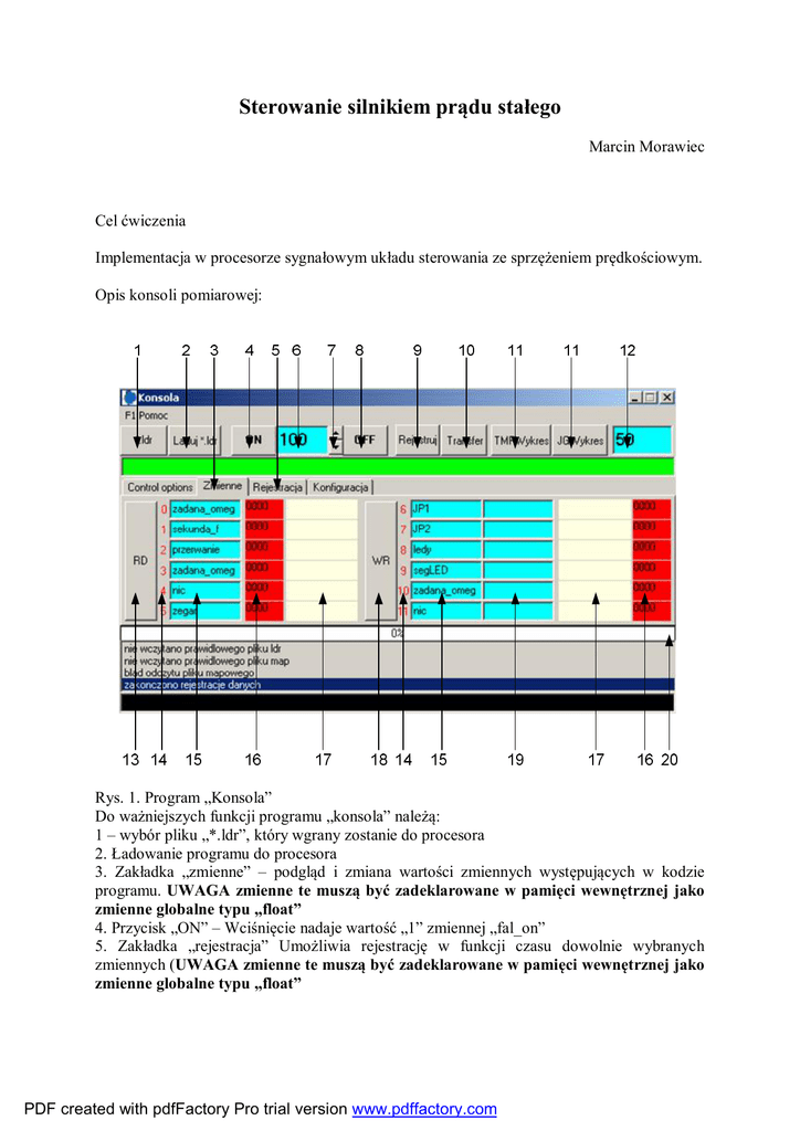 Sterowanie silnikiem prądu stałego Marcin Morawiec Cel ćwiczenia Implementacja w procesorze sygnałowym układu sterowania ze sprzężeniem prędkościowym. Opis konsoli pomiarowej: Rys. 1. Program „Konsola” Do ważniejszych funkcji programu „konsola” należą: 1 – wybór pliku „*.ldr”, który wgrany zostanie do procesora 2. Ładowanie programu do procesora 3. Zakładka „zmienne” – podgląd i zmiana wartości zmiennych występujących w kodzie programu. UWAGA zmienne te muszą być zadeklarowane w pamięci wewnętrznej jako zmienne globalne typu „float” 4. Przycisk „ON” – Wciśnięcie nadaje wartość „1” zmiennej „fal_on” 5. Zakładka „rejestracja” Umożliwia rejestrację w funkcji czasu dowolnie wybranych zmiennych (UWAGA zmienne te muszą być zadeklarowane w pamięci wewnętrznej jako zmienne globalne typu „float” PDF created with pdfFactory Pro trial version www.pdffactory.com 6. Zadajnik prędkości. Wprowadzona wartość (ze znakiem) po podzieleniu przez 1000 przepisywana jest do zmiennej „zadana_omega”. Zmienna ta przyjmuje wartości w zakresie <-1..1>. 7. Zadajnik prędkośći 8. Przycisk OFF - Wciśnięcie nadaje wartość „0” zmiennej „fal_on” 9.Rejestruj – rozpoczęcie rejestracji – uwaga rejestrowanych jest max. 500 próbek każdej zmiennej 10.Transfer – Przepisanie zarejestrowanych danych z procesora do komputera PC 11. Programy do wizualizacji zebranych danych. 12. Co ile przerwać rejestrowana jest jedna próbka danych. UWAGA – wartość minimalna „1” odpowiada długości jednego przerwania procesora (150µs). Możliwa jest rejestracja danych co „x*150µs”, gdzie x jest dowolna liczbą całkowitą. 13. Przycisk odczytu wartości zmiennych 14. Odblokowanie odczytywanych danych (kolor „czerwony” – dane z wybranej komórki nie są odczytywane/zmieniane) 15. Nazwa zmiennej odczytywanej/zapisywanej „UWAGA zmienne te muszą być zadeklarowane w pamięci wewnętrznej jako zmienne globalne typu float”. Wybór zmiennej potwierdzić Enterem 16. Adres wybranej zmiennej. W przypadku, gdy zmienna nie występuje w projekcie komórka podświetlona jest na czerwono 17. Odczytana wartość 18. Przycisk Zapisu 19. Wartość nadawana zmiennej typu float (UWAGA – potwierdzić Enterem) 20. Pasek postępu wgrywania programu (UWAGA – nie dochodzi do końca) Struktura oprogramowania sterującego. SPEED.c Program sterujący pracą przekształtnika realizowany jest w przerwaniach, wywoływanych co 150µs. Jest to najkrótszy czas generowania impulsu aktywującego tranzystory przekształtnika. W celu zwiększenie długości impulsów należy w mikroprocesorze utrzymywać stan odpowiedniej zmiennej sterującej przez kilka-kilkaset-kilka tysięcy przerwać (10 przerwań to 1.5ms, 1000 przerwań to 150ms, 1 000 000 przerwań to 150s itd). Przerwanie rozpoczyna się i kończy nawiasami klamrowymi po komendzie „void irq0_isr(int interrupt_number)”. Parametry silnika: In=2A, Un=30V, n=3000 obr/min Program ćwiczenia: 1. Zadać napięcie na zasilaczu 30V (kolor czerwony przewodu to +!!!! – sprawdzić połączenie przed podaniem zasilania). 2. Narysować schemat połączeń układu napędowego (rzeczywisty schemat z mostkiem H) 3. W oknie 6 wpisać wartość np. 100. Zmienna zadana_omega=100/1000=0.1 j.w. Następnie załączyć ON. Domyślny układ regulacji to napięciowy. Napięcie: uzad=zadana_omega. Zakres zmian napięcia to (-1…1). Zbadać pracę układu napędowego. Zarejestrować prąd twornika silnika (I1 – w [A] lub I1_b=I1/In, ud- napięcie PDF created with pdfFactory Pro trial version www.pdffactory.com zasilania w j.w.), prędkość mierzoną enkoderem – zmienna enkorder1, napięcie zadane uzad). 4. Wprowadzić opóźnienie (rampę) na sygnał zadany: zadana_omega. Rampa spowoduje, że napięcie zadane (uzad) nie będzie zadawane skokowo. Uwaga! Należy przypisać do zmiennej uzad= omega_zad (zmienne należy definiować jako float w pliku deklaracje.h). 5. Zarejestrować przebiegi (I1_b, uzad, omega_zad, ud, enkoder1). 6. Ustawić czas narastania (i hamowania) sygnału rampy aby rozruch maszyny trwał 1s (uwaga przerwanie = 150us należy odpowiednio przeliczyć!!!). 7. Zaprojektować układ regulacji ze sprzężeniem prędkościowym, w którym: zadana_omega – prędkość zadana, omega_zad – prędkość z rampą, uzad – napięcie zadane zmienna wyjściowa z regulatora prądu, I1_b – prąd twornika mierzony w j.w. fclipf(zmienna, ograniczenie) – funkcja służąca do ograniczenia wyjść z regulatorów, enkoder1 – zmierzona prędkość przeskalowana na j.w. Enkoder zastosowany w układzie napędowym zwraca tylko sygnał dodatniej prędkości!!! Należy wykorzystać sygnał rampy (omega_zad) oraz poniższy kod programu: if ((omega_zad<0)) znak=-1; else znak=1; enkoder1=enkoder1*znak; gdzie: znak jest znakiem prędkości kątowej wirnika. PDF created with pdfFactory Pro trial version www.pdffactory.com