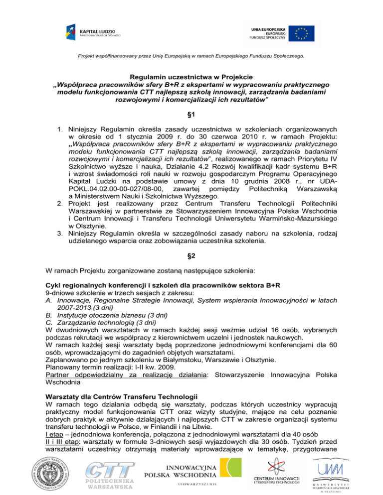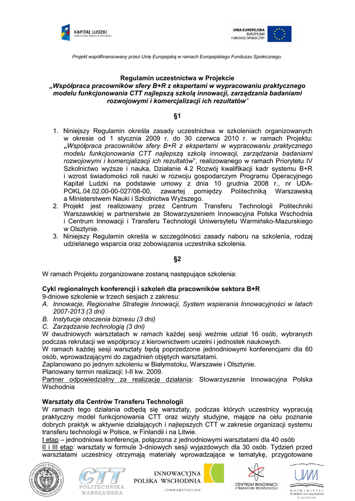 Projekt współfinansowany przez Unię Europejską w ramach Europejskiego Funduszu Społecznego. Regulamin uczestnictwa w Projekcie „Współpraca pracowników sfery B+R z ekspertami w wypracowaniu praktycznego modelu funkcjonowania CTT najlepszą szkolą innowacji, zarządzania badaniami rozwojowymi i komercjalizacji ich rezultatów” §1 1. Niniejszy Regulamin określa zasady uczestnictwa w szkoleniach organizowanych w okresie od 1 stycznia 2009 r. do 30 czerwca 2010 r. w ramach Projektu: „Współpraca pracowników sfery B+R z ekspertami w wypracowaniu praktycznego modelu funkcjonowania CTT najlepszą szkolą innowacji, zarządzania badaniami rozwojowymi i komercjalizacji ich rezultatów”, realizowanego w ramach Priorytetu IV Szkolnictwo wyższe i nauka, Działanie 4.2 Rozwój kwalifikacji kadr systemu B+R i wzrost świadomości roli nauki w rozwoju gospodarczym Programu Operacyjnego Kapitał Ludzki na podstawie umowy z dnia 10 grudnia 2008 r., nr UDAPOKL.04.02.00-00-027/08-00, zawartej pomiędzy Politechniką Warszawską a Ministerstwem Nauki i Szkolnictwa Wyższego. 2. Projekt jest realizowany przez Centrum Transferu Technologii Politechniki Warszawskiej w partnerstwie ze Stowarzyszeniem Innowacyjna Polska Wschodnia i Centrum Innowacji i Transferu Technologii Uniwersytetu Warmińsko-Mazurskiego w Olsztynie. 3. Niniejszy Regulamin określa w szczególności zasady naboru na szkolenia, rodzaj udzielanego wsparcia oraz zobowiązania uczestnika szkolenia. §2 W ramach Projektu zorganizowane zostaną następujące szkolenia: Cykl regionalnych konferencji i szkoleń dla pracowników sektora B+R 9-dniowe szkolenie w trzech sesjach z zakresu: A. Innowacje, Regionalne Strategie Innowacji, System wspierania Innowacyjności w latach 2007-2013 (3 dni) B. Instytucje otoczenia biznesu (3 dni) C. Zarządzanie technologią (3 dni) W dwudniowych warsztatach w ramach każdej sesji weźmie udział 16 osób, wybranych podczas rekrutacji we współpracy z kierownictwem uczelni i jednostek naukowych. W ramach każdej sesji warsztaty będą poprzedzone jednodniowymi konferencjami dla 60 osób, wprowadzającymi do zagadnień objętych warsztatami. Zaplanowano po jednym szkoleniu w Białymstoku, Warszawie i Olsztynie. Planowany termin realizacji: I-II kw. 2009. Partner odpowiedzialny za realizację działania: Stowarzyszenie Innowacyjna Polska Wschodnia Warsztaty dla Centrów Transferu Technologii W ramach tego działania odbędą się warsztaty, podczas których uczestnicy wypracują praktyczny model funkcjonowania CTT oraz wizyty studyjne, mające na celu poznanie dobrych praktyk w aktywnie działających i najlepszych CTT w zakresie organizacji systemu transferu technologii w Polsce, w Finlandii i na Litwie. I etap – jednodniowa konferencja, połączona z jednodniowymi warsztatami dla 40 osób II i III etap: warsztaty w formule 3-dniowych sesji wyjazdowych dla 30 osób. Tydzień przed warsztatami uczestnicy otrzymają materiały wprowadzające w tematykę, przygotowane przez ekspertów. Podczas warsztatów w grupach problemowych pod nadzorem moderatora przygotowują propozycje rozwiązań i prezentują je uczestnikom. Po prezentacjach odbywają się dyskusje celem dokonania wyboru optymalnych rozwiązań. Eksperci opracowują zebrane materiały i przygotowują wraz z własnymi komentarzami dla uczestników etapu IV. IV etap: 1-dniowa konferencja, prezentująca dorobek poprzednich etapów. Warsztaty/Wizyty studyjne Wizyta studyjna/szkolenie we Wrocławskim Centrum Transferu Technologii i CIiTT UAM w Poznaniu dla 15 pracowników sektora B+R, czas trwania: 3 dni. Cel: poznanie „best practices” w aktywnie działających i najlepszych CTT w zakresie organizacji systemu transferu technologii poprzez szkolenie i dyskusje panelowe z udziałem pracowników tych jednostek oraz nawiązanie kontaktów roboczych. Wizyta studyjna/szkolenie w Finlandii-Technopolis Helsinki, dla 15 pracowników sektora B+R, czas trwania: 3 dni. Cel: poznanie zagranicznych „best practices” w CTT współpracujących aktywnie z fińskimi parkami naukowo-technologicznymi (jednymi z najlepszych na świecie) w szczególności w zakresie organizacji systemu transferu technologii w Finlandii. Spotkania i dyskusje z udziałem pracowników tych jednostek pozwolą na określenie możliwej formuły dalszej współpracy z partnerami fińskimi. Wizyta studyjna/szkolenie na Litwie, 2009, dla 15 pracowników sektora B+R, czas trwania: 3 dni. Cel: zapoznanie się z systemem transferu technologii na Litwie i organizacją litewskich CTT w Kownie (CTT uczelniane) i w Wilnie (Lithuanian Innovation Centre) oraz uczestnictwo w warsztatach prezentujących dobre praktyki i możliwości komercjalizacji technologii. Termin realizacji: Konferencje i warsztaty I, II etap: czerwiec 2009 III etap: wrzesień 2009 IV etap: październik 2009 Wizyty studyjne: Wrocław, Poznań: sierpień 2009 Finlandia, Litwa: wrzesień 2009 Partner odpowiedzialny za realizację działania: Politechnika Warszawska Cykl regionalnych szkoleń dla pracowników sektora B+R D. Zarządzanie projektami ((3 moduły szkoleniowe po 3 dni dla grupy 16-osobowej w każdym z miast: Olsztyn, Białystok, Warszawa) E. Zarządzanie technologią i negocjacje w transferze technologii ((3 moduły szkoleniowe po 3 dni dla grupy 16-osobowej w każdym z miast: Olsztyn, Białystok, Warszawa) Wstępny harmonogram szkoleń: D. Zarządzanie projektami (3 moduły 3-dniowe) I moduł - Olsztyn: październik 2009 I moduł - Warszawa: listopad 2009 I moduł – Białystok: grudzień 2009 II moduł – Olsztyn: listopad 2009 II moduł Białystok, Warszawa: grudzień 2009 III moduł – Olsztyn, Białystok, Warszawa: I kw. 2010 E. Zarządzanie technologią i negocjacje w transferze technologii (3 moduły 3-dniowe) I, II, III moduł: Białystok, Warszawa, Olsztyn: II kw. 2010 Partner odpowiedzialny w Olsztynie. za realizację działania: §3 Uniwersytet Warmińsko-Mazurski 1. Uczestnikami szkolenia mogą by