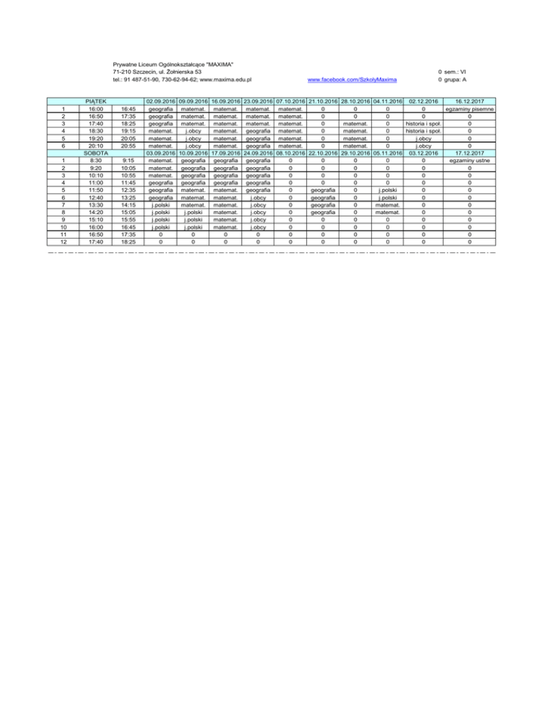 Prywatne Liceum Ogólnokształcące "MAXIMA" 71-210 Szczecin, ul. Żołnierska 53 tel.: 91 487-51-90, 730-62-94-62; www.maxima.edu.pl 1 2 3 4 5 6 1 2 3 4 5 6 7 8 9 10 11 12 PIĄTEK 16:00 16:50 17:40 18:30 19:20 20:10 SOBOTA 8:30 9:20 10:10 11:00 11:50 12:40 13:30 14:20 15:10 16:00 16:50 17:40 16:45 17:35 18:25 19:15 20:05 20:55 9:15 10:05 10:55 11:45 12:35 13:25 14:15 15:05 15:55 16:45 17:35 18:25 02.09.2016 geografia geografia geografia matemat. matemat. matemat. 03.09.2016 matemat. matemat. matemat. geografia geografia geografia j.polski j.polski j.polski j.polski 0 0 09.09.2016 matemat. matemat. matemat. j.obcy j.obcy j.obcy 10.09.2016 geografia geografia geografia geografia matemat. matemat. matemat. j.polski j.polski j.polski 0 0 16.09.2016 matemat. matemat. matemat. matemat. matemat. matemat. 17.09.2016 geografia geografia geografia geografia matemat. matemat. matemat. matemat. matemat. matemat. 0 0 23.09.2016 matemat. matemat. matemat. geografia geografia geografia 24.09.2016 geografia geografia geografia geografia geografia j.obcy j.obcy j.obcy j.obcy j.obcy 0 0 www.facebook.com/SzkolyMaxima 07.10.2016 matemat. matemat. matemat. matemat. matemat. matemat. 08.10.2016 0 0 0 0 0 0 0 0 0 0 0 0 21.10.2016 0 0 0 0 0 0 22.10.2016 0 0 0 0 geografia geografia geografia geografia 0 0 0 0 28.10.2016 0 0 matemat. matemat. matemat. matemat. 29.10.2016 0 0 0 0 0 0 0 0 0 0 0 0 0 sem.: VI 0 grupa: A 04.11.2016 02.12.2016 16.12.2017 0 0 egzaminy pisemne 0 0 0 0 historia i społ. 0 0 historia i społ. 0 0 j.obcy 0 0 j.obcy 0 05.11.2016 03.12.2016 17.12.2017 0 0 egzaminy ustne 0 0 0 0 0 0 0 0 0 j.polski 0 0 j.polski 0 0 matemat. 0 0 matemat. 0 0 0 0 0 0 0 0 0 0 0 0 0 0