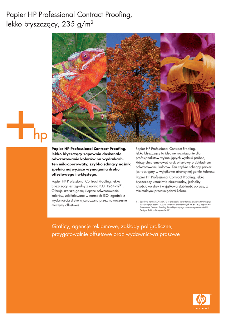 Papier HP Professional Contract Proofing, lekko błyszczący, 235 g/m2 Papier HP Professional Contract Proofing, lekko błyszczący zapewnia doskonałe odwzorowanie kolorów na wydrukach. Ten mikroporowaty, szybko schnący nośnik spełnia najwyższe wymagania druku offsetowego i wklęsłego. Papier HP Professional Contract Proofing, lekko błyszczący jest zgodny z normą ISO 12647-2[k1]. Oferuje szerszą gamę i lepsze odwzorowanie kolorów, zdefiniowane w normach ISO, zgodnie z wydajnością druku wyznaczaną przez nowoczesne maszyny offsetowe. Papier HP Professional Contract Proofing, lekko błyszczący to idealne rozwiązanie dla profesjonalistów wykonujących wydruki próbne, którzy chcą emulować druk offsetowy o dokładnym odwzorowaniu kolorów. Ten szybko schnący papier jest dostępny w wyjątkowo atrakcyjnej gamie kolorów. Papier HP Professional Contract Proofing, lekko błyszczący umożliwia niezawodny, jednolity jakościowo druk i wyjątkową stabilność obrazu, z minimalnymi przesunięciami koloru. [k1] Zgodny z normą ISO 12647-2 w przypadku korzystania z drukarek HP Designjet 90 i Designjet z serii 130/30, systemów atramentowych HP 84 i 85, papieru HP Professional Contract Proofing, lekko błyszczącego oraz oprogramowania EFI Designer Edition dla systemów HP. Graficy, agencje reklamowe, zakłady poligraficzne, przygotowalnie offsetowe oraz wydawnictwa prasowe Papier HP Professional Contract Proofing, lekko błyszczący, 235 g/m2 Zgodność Najnowsze informacje na temat zgodności materiałów eksploatacyjnych do drukarek wielkoformatowych można znaleźć na stronie www.hp.com/go/designjet/supplies Najnowsze profile ICC dla nośników można znaleźć pod adresem www.hp.com/go/designjet/supplies (należy kliknąć profile ICC i wybrać model drukarki). W przypadku drukarek niepostscriptowych informacji na ten temat można zasięgnąć u dostawcy procesora RIP. Waga 235 g/m2 wg metody testowej ISO 536 Grubość materiału drukującego 220 μm wg metody testowej ISO 534 Nieprzezroczystość Powyżej 90% wg metody testowej TAPPI T-425 Jasność materiału drukowania Powyżej 95% wg metody testowej TAPPI T-452 Laminacja materiału drukującego Tak, laminowanie “na zimno”. Papier ten można laminować przy użyciu dostępnych na rynku folii samoprzylepnych. Więcej informacji na ten temat można uzyskać u partnerów HP zajmujących się laminowaniem. Wykończenie nośnika Lekko błyszczący Poziom połysku materiału drukującego Lekko błyszczący wg metody testowej ASTM D-523 Zakres tempretatur pracy od 15° C do 30° C Zakres wilgotności podczas pracy Wilgotność względna od 20 do 70% Wilgotność poza pracą Wilgotność względna od 20 do 60% Czas suszenia materiału drukującego Natychmiast (w temperaturze 23° C, przy wilgotności względnej 50%) Żywotność na półce Rok w oryginalnym, fabrycznie zamkniętym opakowaniu Zakres temperatur przechowywania, Fahrenheit od 15° C do 30° C Wilgotność poza pracą Wilgotność względna od 20 do 60% Kraj pochodzenia Wyprodukowano w Niemczech Numery katalogowe HP Oświadczenie gwarancyjne Numer produktu wymiary noœnika w roli A3+/330 mm x 483 mm NOWOŒÆ! Q8049A 458 mm x 30.5 m 8 82780-21031 8 Q7971A 610 mm x 30.5 m 8 29160-8660 2 8 29160-8660 3 HP gwarantuje, że wielkoformatowe materiały drukarskie HP są wolne od wad produkcyjnych i są tak zaprojektowane, by przy właściwym użytkowaniu nie powodować zacięć drukarki. Jeśli z jakiegokolwiek powodu użytkownik jest niezadowolony z wielkoformatowego materiału drukarskiego HP, powinien skontaktować się ze swoim sprzedawcą. © 2006 Hewlett-Packard Development Company, L.P. Wszystkie gwarancje udzielane w odniesieniu do Produktów i Usług HP określone zostały w oświadczeniach gwarancyjnych załączanych do każdego produktu i usługi. Żaden zapis niniejszego dokumentu nie może być uważany za dodatkową gwarancję. HP nie ponosi odpowiedzialności za błędy techniczne lub drukarskie w niniejszym dokumencie. Aby uzyskać więcej informacji na temat materiałów konsumpcyjnych HP, odwiedź http://www.hp.com/go/designjet/supplies 4AA0-4443PLE 06/06 Oznaczenie na kodzie kreskowym (UPC) Q7970A