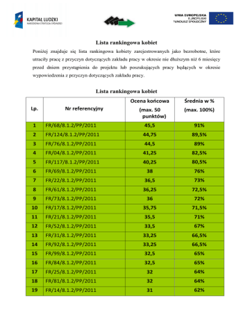 Lista rankingowa kobiet Poniżej znajduje się lista rankingowa kobiety zarejestrowanych jako bezrobotne, które utraciły pracę z przyczyn dotyczących zakładu pracy w okresie nie dłuższym niż 6 miesięcy przed dniem przystąpienia do projektu lub poszukujących pracy będących w okresie wypowiedzenia z przyczyn dotyczących zakładu pracy. Lista rankingowa kobiet Ocena końcowa Lp. Nr referencyjny (max. 50 punktów) Średnia w % (max. 100%) 1 FR/68/8.1.2/PP/2011 45,5 91% 2 FR/124/8.1.2/PP/2011 44,75 89,5% 3 FR/76/8.1.2/PP/2011 44,5 89% 4 FR/04/8.1.2/PP/2011 41,25 82,5% 5 FR/117/8.1.2/PP/2011 40,25 80,5% 6 FR/69/8.1.2/PP/2011 38 76% 7 FR/22/8.1.2/PP/2011 36,5 73% 8 FR/61/8.1.2/PP/2011 36,25 72,5% 9 FR/73/8.1.2/PP/2011 36 72% 10 FR/17/8.1.2/PP/2011 35,75 71,5% 11 FR/21/8.1.2/PP/2011 35,5 71% 12 FR/52/8.1.2/PP/2011 33,5 67% 13 FR/31/8.1.2/PP/2011 33,25 66,5% 14 FR/92/8.1.2/PP/2011 33,25 66,5% 15 FR/99/8.1.2/PP/2011 32,5 65% 16 FR/84/8.1.2/PP/2011 32,5 65% 17 FR/25/8.1.2/PP/2011 32 64% 18 FR/81/8.1.2/PP/2011 32 64% 19 FR/14/8.1.2/PP/2011 31 62% 20 FR/123/8.1.2/PP/2011 31 62% 21 FR/101/8.1.2/PP/2011 30,25 60,5% 22 FR/113/8.1.2/PP/2011 30,25 60,5% 23 FR/37/8.1.2/PP/2011 30 60% 24 FR/40/8.1.2/PP/2011 26,5 53% 25 FR/64/8.1.2/PP/2011 26 52% Osoby zaznaczone kolorem zielonym, to osoby które zostały zakwalifikowane do udziału w projekcie, osoby zaznaczone kolorem żółtym, to osoby, które będą się znajdowały na liście rezerwowej, a osoby zaznaczone kolorem czerwonym, to osoby które nie zostały zakwalifikowane do udziału w Projekcie w przeprowadzonym procesie rekrutacji ze względu na otrzymaną niewystarczającą liczbę punktów.