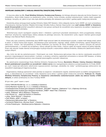 Miasto i Gmina Siewierz - http://www.siewierz.pl/ Data umieszczenia informacji: 2013-01-15 07:35:09 WSPÓLNIE ZAGRALIŚMY Z WIELKĄ ORKIESTRĄ ŚWIĄTECZNEJ POMOCY 13 stycznia odbył się 21. Finał Wielkiej Orkiestry Świątecznej Pomocy, do którego aktywnie włączyła się Gmina Siewierz i jej mieszkańcy. Akcja miała miejsce na siewierskim rynku, na który, mimo mrozów, przybyli wolontariusze i ludzie chętni wspomóc fundację i szczytny cel, jakim w tym roku była zbiórka pieniędzy dla ratowania życia dzieci i godnej opieki medycznej seniorów. Siewierską akcję zainaugurował występ Orkiestry Dętej OSP Siewierz, która odegrała słynny hymn WOŚP, po czym prowadzący charytatywną imprezę Dyrektor Miejsko-Gminnego Ośrodka Kultury Damian Dawczyński oraz szef sztabu WOŚP w Siewierzu Jacek Gruszczyński powitali wszystkich zebranych oraz gorąco zachęcali do szczodrości przy wspieraniu tej jednej z największych polskich akcji zbiórki pieniędzy. Wolontariuszy swymi występami wsparły dzieci i młodzież z gminnych placówek oświatowych, które przygotowały ciekawy repertuar artystyczny zapewniający dobrą zabawę do późnego wieczora. Na siewierskim rynku zagrali również goście:zespół Skangur oraz Natural Mystic Akustycznie. Przez cały czas uczestnicy siewierskiej akcji WOŚP mogli wrzucać datki do orkiestrowych puszek, a także mieli okazję wziąć udział w loterii, w której można było wygrać, zafundowane przez sponsorów, nagrody: tablet, telefon komórkowy, aparat fotograficzny, odkurzacz, mikser, bal karnawałowy w Hotelu Podkowa czy karnety do Parku Wodnego Jura. Loteria cieszyła się sporym zainteresowaniem, a i znaleźli się szczęśliwcy, którzy zakupili po kilka losów, i którym udało się wygrać więcej niż jedną nagrodę. Przez cały wieczór trwała również emocjonująca licytacja koszulki z wizerunkiem Alberta Einsteina, ostatecznie zakończona kwotą 1 tysiąca złotych. Aby mróz nie dał się wolontariuszom i filantropom we znaki, Restauracja Jędrusiowa Izba za darmo częstowała wszystkich pysznym rozgrzewającym barszczykiem i żurkiem, a strażacy ochotnicy zapewniali schronienie w remizie OSP Siewierz, w której przygotowali kurs pierwszej pomocy oraz omawiali poszczególne czynności ratownicze. Na zakończenie siewierskiego finału Wielkiej Orkiestry Świątecznej Pomocy Burmistrz Miasta i Gminy Siewierz Zdzisław Banaś podziękował wszystkim za szczodrość i dobre serce oraz zaangażowanie włożone w przeprowadzenie 21.Finału WOŚP, po czym rozpoczął odliczanie zakończone wypuszczeniem słynnego „światełka do nieba” symbolizującego jednoczenie się wszystkich wspierających tegoroczną akcję. Organizatorzy dziękują sponsorom (lista poniżej) za wsparcie i ufundowanie nagród, wolontariuszom za wielkie zaangażowanie i serce, a ofiarodawcom za szczodrość i wolę ratowania życia dzieci i godnej opieki medycznej seniorów. Podczas 21. Finału Wielkiej Orkiestry Świątecznej Pomocy w Siewierzu czterdziestu wolontariuszom udało się zebrać kwotę 17000 złotych, w całości przekazaną na rzecz Fundacji WOŚP. W tym roku „grali” razem z nami: ■ ■ ■ ■ ■ ■ ■ ■ ■ ■ ■ firma TOPCON POLSKA Sp. z o. o. z siedzibą w Siewierzu firma Mechanic System Sp. z o. o. z siedzibą w Siewierzu Przedsiębiorstwo Produkcyjno-Usługowo-Handlowe „DOLOMIT” Kopalnia „Ząbkowice” S.A. z Dąbrowy Górniczej Przedsiębiorstwo Produkcyjno-Usługowo-Handlowe „FABET” Adam Flak z Siewierza Hotel „Podkowa” SPA & Wellness z Siewierza Pan Roman Lis - właściciel Kantoru w Siewierzu sklep „Świat Alkoholi” z Siewierzu Park Wodny „JURA” w Łazach Restauracja„Jędrusiowa Izba” w Siewierzu Hurtownia Papiernicza „Biurowy Świat” z Siewierza Firmia Produkcyjno – Handlowa Janina Dębowiec z Siewierza Urząd Miasta i Gminy Siewierz, 42-470 Siewierz, ul. Żwirki i WIgury 16, tel. 32 64 99 400, e-mail: [email protected] Burmistrz Miasta i Gminy Siewierz mgr Zdzisław Banaś