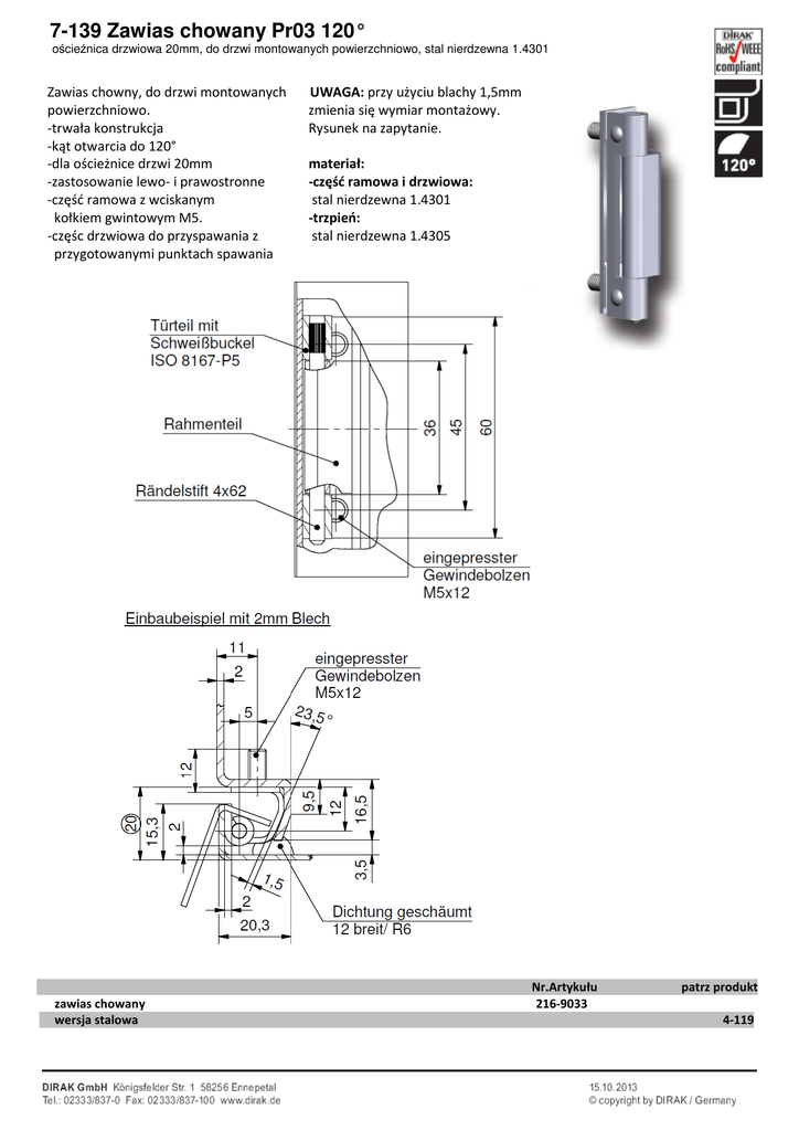 7-139 Zawias chowany Pr03 120° ościeżnica drzwiowa 20mm, do drzwi montowanych powierzchniowo, stal nierdzewna 1.4301 Zawias chowny, do drzwi montowanych powierzchniowo. -trwała konstrukcja -kąt otwarcia do 120° -dla ościeżnice drzwi 20mm -zastosowanie lewo- i prawostronne -część ramowa z wciskanym kołkiem gwintowym M5. -częśc drzwiowa do przyspawania z przygotowanymi punktach spawania Opis zawias chowany wersja stalowa UWAGA: przy użyciu blachy 1,5mm zmienia się wymiar montażowy. Rysunek na zapytanie. materiał: -część ramowa i drzwiowa: stal nierdzewna 1.4301 -trzpień: stal nierdzewna 1.4305 wymiar X w mm zakres ścisku S Nr.Artykułu 216-9033 patrz produkt 4-119