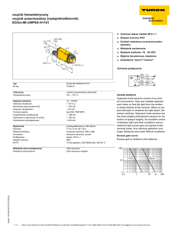 czujnik fotoelektryczny czujnik przeciwsobny (nadajnik/odbiornik) EO3m-Mi-UNP6X-H1141 ■ 4-pinowe złącze męskie M12 x 1 ■ Stopień ochrony IP67 ■ Czułość ustawiana za pomocą potencjometru ■ Wskaźnik wyrównania ■ Napięcie zasilania: 10…30 VDC ■ Wyjście dwustanowe, bipolarne ■ Zadziałanie "jasno"/"ciemno" Schemat podłączenia EO3m-Mi-UNP6X-H1141 7700513 Tryb pracy Temperatura pracy czujnik przeciwsobny (odbiornik) -20…+70 °C Napięcie zasilania Tętnienie resztkowe Nominalny prąd zasilania DC Prąd bez obciążenia I0 Funkcja wyjścia Częstotliwość przełączania Opóźnienie w gotowości do pracy Wyzwolenie przeciążeniowe 10…30VDC < 10 % Uss ð 150 mA ð 25 mA styk NO, PNP/NPN ð 500 Hz ð 100 ms > 220 mA Wykonanie Wymiary Materiał obudowy Soczewka Podłączenie Stopień ochrony MTTF prostopadłościenna, Mini Beam 71.3x 12.3x 30.7 mm tworzywo sztuczne, PBT, żółta tworzywo sztuczne, acrylic złącze, M12 x 1 IP67 777lat zgodnie z SN 29500 (Ed. 99) 40 °C Wskaźnik stanu przełączenia Wskaźnik wzmocnienia LED czerwony LED czerwony miganie Zasada działania Opposed mode sensors consist of an emitter and receiver. They are installed opposite each other so that the light from the emitter is aimed directly at the receiver. When an object interrupts or weakens the light beam, the sensor switches. Opposed mode sensors are the most reliable photoelectric sensors for detection of opaque targets. An excellent contrast between light and dark conditions and an extremly high excess gain are typical of this sensing mode, thus allowing operation over larger distances and under difficult conditions. Excess gain curve Excess gain in relation to the distance Edition • 2013-09-18T13:27:33+02:00 Typ Nr kat. 1/3 Hans Turck GmbH & Co.KG ñ D-45472 Mülheim an der Ruhr ñ Witzlebenstraße 7 ñ Tel. 0208 4952-0 ñ Fax 0208 4952-264 ñ [email protected] ñ www.turck.com czujnik fotoelektryczny czujnik przeciwsobny (nadajnik/odbiornik) EO3m-Mi-UNP6X-H1141 Akcesoria montażowe Typ Nr kat. TMBM18FA 7700395 Uchwyt montażowy, VA 1.4401, dla gwintu 18 mm Wymiary TMB18SF 7700396 Uchwyt montażowy, czarny PBT, dla gwintu 10 mm TMB3018SC 7700397 Uchwyt montażowy, czarny PBT, dla gwintu 18 mm TMBMIS 7700401 Uchwyt montażowy, stal nierdzewna, dla serii BT18/BQ18 i ..MI-.. Akcesoria - okablowanie Typ Nr kat. RKC4.4T-2/TEL 6625013 Wymiary Przewód podłączeniowy, złącze żeńskie M12, proste, 4-pinowe, długość: 2 m; materiał otuliny: PVC, czarny; certyfikat cULus; dostępne również inne długości kabli i typy otuliny, Edition • 2013-09-18T13:27:33+02:00 patrz www.turck.com 2/3 Hans Turck GmbH & Co.KG ñ D-45472 Mülheim an der Ruhr ñ Witzlebenstraße 7 ñ Tel. 0208 4952-0 ñ Fax 0208 4952-264 ñ [email protected] ñ www.turck.com czujnik fotoelektryczny czujnik przeciwsobny (nadajnik/odbiornik) EO3m-Mi-UNP6X-H1141 Akcesoria - okablowanie Typ Nr kat. WKC4.4T-2/TEL 6625025 Wymiary Przewód podłączeniowy, złącze żeńskie M12, kątowe, 4-pinowe, długość: 2 m; materiał otuliny: PVC, czarny; certyfikat cULus; dostępne również inne długości kabli i typy otuliny, Edition • 2013-09-18T13:27:33+02:00 patrz www.turck.com 3/3 Hans Turck GmbH & Co.KG ñ D-45472 Mülheim an der Ruhr ñ Witzlebenstraße 7 ñ Tel. 0208 4952-0 ñ Fax 0208 4952-264 ñ [email protected] ñ www.turck.com