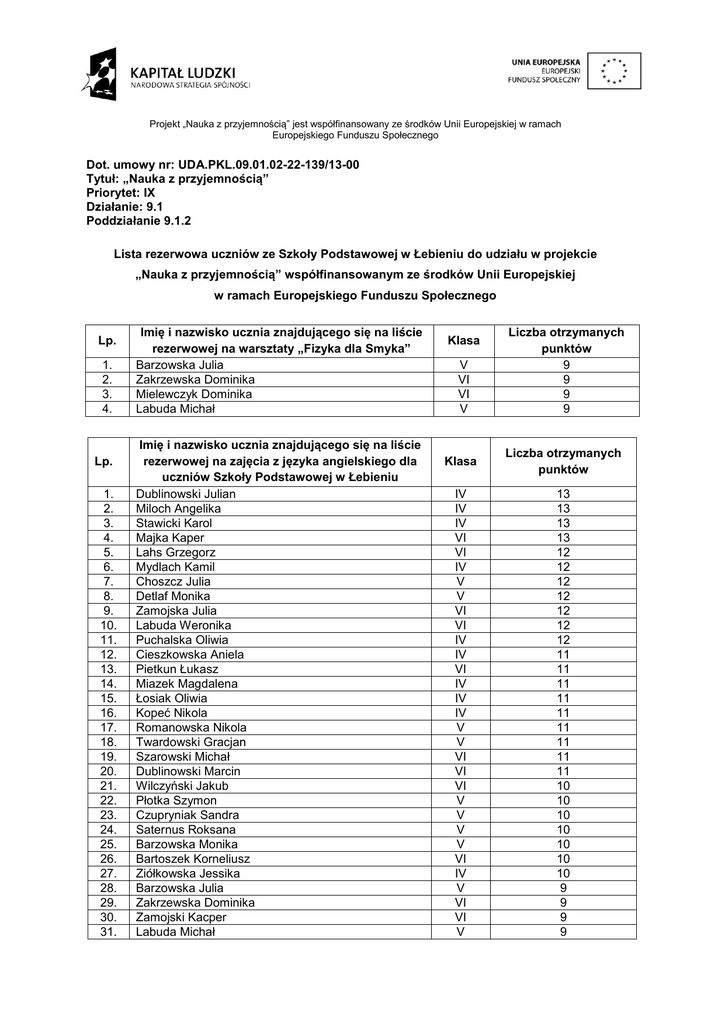 Projekt „Nauka z przyjemnością” jest współfinansowany ze środków Unii Europejskiej w ramach Europejskiego Funduszu Społecznego Dot. umowy nr: UDA.PKL.09.01.02-22-139/13-00 Tytuł: „Nauka z przyjemnością” Priorytet: IX Działanie: 9.1 Poddziałanie 9.1.2 Lista rezerwowa uczniów ze Szkoły Podstawowej w Łebieniu do udziału w projekcie „Nauka z przyjemnością” współfinansowanym ze środków Unii Europejskiej w ramach Europejskiego Funduszu Społecznego Lp. 1. 2. 3. 4. Lp. 1. 2. 3. 4. 5. 6. 7. 8. 9. 10. 11. 12. 13. 14. 15. 16. 17. 18. 19. 20. 21. 22. 23. 24. 25. 26. 27. 28. 29. 30. 31. Imię i nazwisko ucznia znajdującego się na liście rezerwowej na warsztaty „Fizyka dla Smyka” Barzowska Julia Zakrzewska Dominika Mielewczyk Dominika Labuda Michał Imię i nazwisko ucznia znajdującego się na liście rezerwowej na zajęcia z języka angielskiego dla uczniów Szkoły Podstawowej w Łebieniu Dublinowski Julian Miloch Angelika Stawicki Karol Majka Kaper Lahs Grzegorz Mydlach Kamil Choszcz Julia Detlaf Monika Zamojska Julia Labuda Weronika Puchalska Oliwia Cieszkowska Aniela Pietkun Łukasz Miazek Magdalena Łosiak Oliwia Kopeć Nikola Romanowska Nikola Twardowski Gracjan Szarowski Michał Dublinowski Marcin Wilczyński Jakub Płotka Szymon Czupryniak Sandra Saternus Roksana Barzowska Monika Bartoszek Korneliusz Ziółkowska Jessika Barzowska Julia Zakrzewska Dominika Zamojski Kacper Labuda Michał Klasa V VI VI V Liczba otrzymanych punktów 9 9 9 9 Klasa Liczba otrzymanych punktów IV IV IV VI VI IV V V VI VI IV IV VI IV IV IV V V VI VI VI V V V V VI IV V VI VI V 13 13 13 13 12 12 12 12 12 12 12 11 11 11 11 11 11 11 11 11 10 10 10 10 10 10 10 9 9 9 9 Projekt „Nauka z przyjemnością” jest współfinansowany ze środków Unii Europejskiej w ramach Europejskiego Funduszu Społecznego Osoby z listy rezerwowej będą kwalifikowane do udziału w projekcie w przypadku rezygnacji osób z listy podstawowej, zgodnie z Regulaminem rekrutacji i uczestnictwa w projekcie „Nauka z przyjemnością”, stanowiącym Załącznik do Zarządzenia Nr W-57/2014 Wójta Gminy Nowa Wieś Lęborska z dnia 08.10.2014 r. w sprawie przyjęcia Regulaminu rekrutacji i uczestnictwa w projekcie pt. „Nauka z przyjemnością” współfinansowanym ze środków Unii Europejskiej w ramach Europejskiego Funduszu Społecznego.