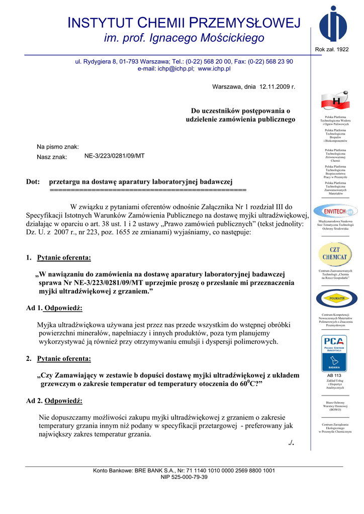 INSTYTUT CHEMII PRZEMYSŁOWEJ im. prof. Ignacego Mościckiego Rok zał. 1922 ul. Rydygiera 8, 01-793 Warszawa; Tel.: (0-22) 568 20 00, Fax: (0-22) 568 23 90 e-mail: [email protected]; www.ichp.pl Warszawa, dnia 12.11.2009 r. Do uczestników postępowania o udzielenie zamówienia publicznego Polska Platforma Technologiczna Wodoru i Ogniw Paliwowych Polska Platforma Technologiczna Biopaliw i Biokomponentów Na pismo znak: Nasz znak: Dot: NE-3/223/0281/09/MT przetargu na dostawę aparatury laboratoryjnej badawczej =============================================== W związku z pytaniami oferentów odnośnie Załącznika Nr 1 rozdział III do Specyfikacji Istotnych Warunków Zamówienia Publicznego na dostawę myjki ultradźwiękowej, działając w oparciu o art. 38 ust. 1 i 2 ustawy „Prawo zamówień publicznych” (tekst jednolity: Dz. U. z 2007 r., nr 223, poz. 1655 ze zmianami) wyjaśniamy, co następuje: Polska Platforma Technologiczna Zrównoważonej Chemii Polska Platforma Technologiczna Bezpieczeństwa Pracy w Przemyśle Polska Platforma Technologiczna Zaawansowanych Materiałów Międzynarodowa Naukowa Sieć Tematyczna Technologii Ochrony Środowiska 1. Pytanie oferenta: „W nawiązaniu do zamówienia na dostawę aparatury laboratoryjnej badawczej sprawa Nr NE-3/223/0281/09/MT uprzejmie proszę o przesłanie mi przeznaczenia myjki ultradźwiękowej z grzaniem.” Centrum Zaawansowanych Technologii „Chemia na Rzecz Gospodarki” Ad 1. Odpowiedż: Myjka ultradźwiękowa używana jest przez nas przede wszystkim do wstępnej obróbki powierzchni minerałów, napełniaczy i innych produktów, poza tym planujemy wykorzystywać ją również przy otrzymywaniu emulsji i dyspersji polimerowych. Centrum Kompetencji Nowoczesnych Materiałów Polimerowych o Znaczeniu Przemysłowym 2. Pytanie oferenta: „Czy Zamawiający w zestawie b dopuści dostawę myjki ultradźwiękowej z układem grzewczym o zakresie temperatur od temperatury otoczenia do 600C?” Ad 2. Odpowiedź: Zakład Usług i Ekspertyz Analitycznych Biuro Ochrony Warstwy Ozonowej (BOWO) Nie dopuszczamy możliwości zakupu myjki ultradźwiękowej z grzaniem o zakresie temperatury grzania innym niż podany w specyfikacji przetargowej - preferowany jak największy zakres temperatur grzania. ./. Konto Bankowe: BRE BANK S.A., Nr: 71 1140 1010 0000 2569 8800 1001 NIP 525-000-79-39 Centrum Zarządzania Ekologicznego w Przemyśle Chemicznym -23. Pytanie oferenta: „Czy Zamawiający w zestawie b dopuści dostawę myjki ultradźwiękowej o zakresie regulacji czasu pracy od 1 do 480 min. ?” Ad 3. Odpowiedź: Nie dopuszczamy możliwości zakupu myjki ultradźwiękowej z grzaniem o zakresie czasu pracy innym niż podany w specyfikacji przetargowej – preferowany jak największy zakres czasu pracy, co ułatwia prowadzenie długotrwałych procesów, bez konieczności powtórnego włączenia urządzenia.