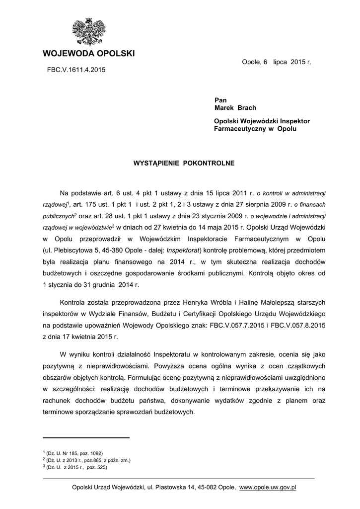 WOJEWODA OPOLSKI Opole, 6 lipca 2015 r. FBC.V.1611.4.2015 Pan Marek Brach Opolski Wojewódzki Inspektor Farmaceutyczny w Opolu WYSTĄPIENIE POKONTROLNE Na podstawie art. 6 ust. 4 pkt 1 ustawy z dnia 15 lipca 2011 r. o kontroli w administracji rządowej1, art. 175 ust. 1 pkt 1 i ust. 2 pkt 1, 2 i 3 ustawy z dnia 27 sierpnia 2009 r. o finansach publicznych2 oraz art. 28 ust. 1 pkt 1 ustawy z dnia 23 stycznia 2009 r. o wojewodzie i administracji rządowej w województwie3 w dniach od 27 kwietnia do 14 maja 2015 r. Opolski Urząd Wojewódzki w Opolu przeprowadził w Wojewódzkim Inspektoracie Farmaceutycznym w Opolu (ul. Plebiscytowa 5, 45-380 Opole - dalej: Inspektorat) kontrolę problemową, której przedmiotem była realizacja planu finansowego na 2014 r., w tym skuteczna realizacja dochodów budżetowych i oszczędne gospodarowanie środkami publicznymi. Kontrolą objęto okres od 1 stycznia do 31 grudnia 2014 r. Kontrola została przeprowadzona przez Henryka Wróbla i Halinę Małolepszą starszych inspektorów w Wydziale Finansów, Budżetu i Certyfikacji Opolskiego Urzędu Wojewódzkiego na podstawie upoważnień Wojewody Opolskiego znak: FBC.V.057.7.2015 i FBC.V.057.8.2015 z dnia 17 kwietnia 2015 r. W wyniku kontroli działalność Inspektoratu w kontrolowanym zakresie, ocenia się jako pozytywną z nieprawidłowościami. Powyższa ocena ogólna wynika z ocen cząstkowych obszarów objętych kontrolą. Formułując ocenę pozytywną z nieprawidłowościami uwzględniono w szczególności: realizację dochodów budżetowych i terminowe przekazywanie ich na rachunek dochodów budżetu państwa, dokonywanie wydatków zgodnie z planem oraz terminowe sporządzanie sprawozdań budżetowych. 1 (Dz. U. Nr 185, poz. 1092) (Dz. U. z 2013 r., poz.885, z późn. zm.) 3 (Dz. U. z 2015 r., poz. 525) 2 Opolski Urząd Wojewódzki, ul. Piastowska 14, 45-082 Opole, www.opole.uw.gov.pl 2 Ujawnione w wyniku kontroli nieprawidłowości dotyczyły: wykazania w sprawozdaniu Rb-28 z wykonania planu wydatków budżetu państwa za rok 2014 w dwóch przypadkach danych w zakresie wykonania wydatków niezgodnych z ewidencją księgową, dokonywania wydatków w wysokościach i terminach niewynikających z wcześniej zaciągniętych zobowiązań, nieprowadzenia kont pozabilansowych: Plan finansowy wydatków budżetowych oraz Plan finansowy wydatków budżetowych w układzie zadaniowym, a także nieokreślenia zasad w tym zakresie w polityce rachunkowości Inspektoratu. I. Realizacja dochodów budżetowych. 1. Z zaplanowanych na 2014 r. dochodów budżetowych w kwocie 214.000 zł, Inspektorat zrealizował dochody w wysokości 320.799,23 zł (149,91%). Analiza realizacji planu dochodów z podstawowej działalności na przestrzeni lat 2011-2014 wykazała, że Inspektorat nieprecyzyjnie planował dochody należne budżetowi państwa. W 2014 r. Inspektorat zaniżył planowane do uzyskania dochody o 100.906,98 zł, (ok. 55%)4, natomiast w okresie 2011-2013 średniorocznie o około 148 tys. zł (177%). Odnosząc się do kwestii planowania dochodów, Opolski Wojewódzki Inspektor Farmaceutyczny (dalej: Wojewódzki Inspektor) w pisemnym wyjaśnieniu podał: (…) planowanie wciąż zwiększającej się sumy dochodów w tym zakresie wydaje się nieracjonalnym i może prowadzić do znacznie przeszacowanych wartości. Zgodnie z corocznymi wytycznymi Ministerstwa Finansów, na etapie opracowywania projektu budżetu należało zwrócić uwagę na konieczność precyzyjnego planowania dochodów budżetu państwa, którego podstawę powinna stanowić pełna i rzetelna informacja o należnych budżetowi państwa dochodach, o czym Inspektorat został poinformowany pismem dyrektora Wydziału Finansów Budżetu i Certyfikacji Opolskiego Urzędu Wojewódzkiego5. Tak więc wyjaśnienie nie zasługuje na uwzględnienie. W toku kontroli sprawdzeniu poddano realizację dochodów budżetowych na kwotę 92.423,63 zł (28,81% uzyskanych dochodów), z tego na kwotę 82.006,98 zł z tytułu udzielonych pozwoleń na prowadzenie apteki ogólnodostępnej i zmian zezwolenia na prowadzenie apteki i punktu aptecznego oraz na kwotę 10.416,65 zł z tytułu wykonywania badań próbek produktów leczniczych, wyrobów medycznych oraz badań laboratoryjnych. Stwierdzono, że dochody budżetowe prawidłowo ustalono i ujęto w ewidencji księgowej. 4 5 plan – 184.000 zł, wykonanie – 284.906,98 zł z dnia 28 czerwca 2013 r. znak: FBC-I.3110.2.2013.ŁK. 3 2. Zrealizowane dochody Inspektorat terminowo przekazywał na centralny rachunek bieżący budżetu państwa, zgodnie z zapisami § 4 ust. 2 rozporządzenia Ministra Finansów z dnia 15 stycznia 2014 r. w sprawie szczegółowego sposobu wykonywania budżetu państwa6. Na koniec 2014 r. nie wystąpiły należności pozostałe do zapłaty. W badanym okresie nie stosowano ulg w spłatach należności budżetowych. II. Wykonanie wydatków budżetowych oraz ich udokumentowanie. 1. Plan finansowy Inspektoratu na rok 2014 ustalony w wysokości 754.200 zł, wykonano w kwocie 753.337,83 zł. Niewykorzystane środki 862,17 zł zwrócono na rachunek bankowy wojewody opolskiego do końca 2014 r. W trakcie kontroli ustalono, że w Inspektoracie nie uwzględniono w polityce rachunkowości oraz nie prowadzono konta pozabilansowego 980 Plan finansowy wydatków budżetowych, wymaganego rozporządzeniem Ministra Finansów z dnia 5 lipca 2010 r. w sprawie szczególnych zasad rachunkowości oraz planów kont dla budżetu państwa (…)7. Kontrolą objęto wydatki poniesione przez Inspektorat w łącznej kwocie 128.243,13 zł (17,02%), m.in. na zakup: materiałów i wyposażenia, usług remontowych i pozostałych, dostępu do sieci Internet, telekomunikacyjnych, energii oraz opłat za utrzymanie pomieszczeń, podróże służbowe, różne składki, a także opłat na rzecz budżetu jednostek samorządu terytorialnego. Wykonane wydatki były zgodne z planem finansowym, celowe oraz prawidłowo udokumentowane, z wyjątkiem wy