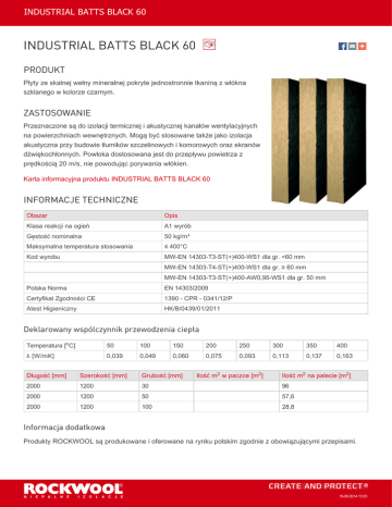 INDUSTRIAL BATTS BLACK 60 INDUSTRIAL BATTS BLACK 60 PRODUKT Płyty ze skalnej wełny mineralnej pokryte jednostronnie tkaniną z włókna szklanego w kolorze czarnym. ZASTOSOWANIE Przeznaczone są do izolacji termicznej i akustycznej kanałów wentylacyjnych na powierzchniach wewnętrznych. Mogą być stosowane także jako izolacja akustyczna przy budowie tłumików szczelinowych i komorowych oraz ekranów dźwiękochłonnych. Powłoka dostosowana jest do przepływu powietrza z prędkością 20 m/s, nie powodując porywania włókien. Karta informacyjna produktu INDUSTRIAL BATTS BLACK 60 INFORMACJE TECHNICZNE Obszar Opis Klasa reakcji na ogień A1 wyrób Gęstość nominalna 50 kg/m³ Maksymalna temperatura stosowania ≤ 400°C Kod wyrobu MWEN 14303T3ST(+)400WS1 dla gr. <60 mm MWEN 14303T4ST(+)400WS1 dla gr. ≥ 60 mm MWEN 14303T3ST(+)400AW0,95WS1 dla gr. 50 mm Polska Norma EN 14303/2009 Certyfikat Zgodności CE 1390 CPR 0341/12/P Atest Higieniczny HK/B/0439/01/2011 Deklarowany wspólczynnik przewodzenia ciepła Temperatura [o C] 50 100 150 200 250 300 350 400 λ [W/mK] 0,039 0,049 0,060 0,075 0,093 0,113 0,137 0,163 Ilość m2 w paczce [m2 ] Ilość m2 na palecie [m2 ] Długość [mm] Szerokość [mm] Grubość [mm] 2000 1200 30 96 2000 1200 50 57,6 2000 1200 100 28,8 Informacja dodatkowa Produkty ROCKWOOL są produkowane i oferowane na rynku polskim zgodnie z obowiązującymi przepisami. 1609 2014 13:23