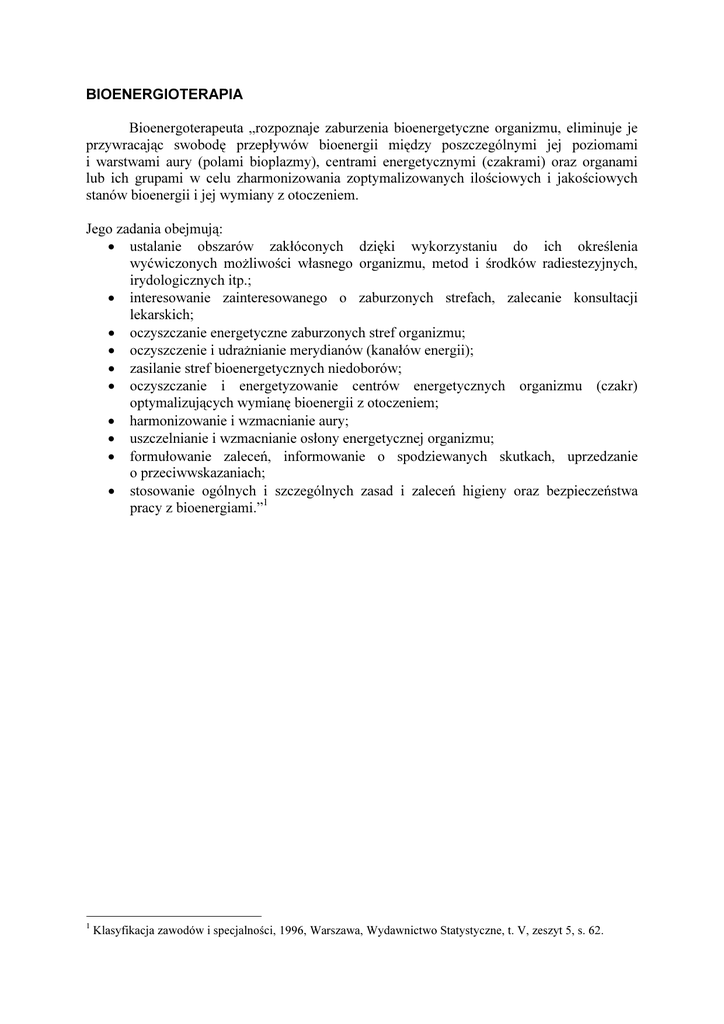 BIOENERGIOTERAPIA Bioenergoterapeuta „rozpoznaje zaburzenia bioenergetyczne organizmu, eliminuje je przyw racają c s w obod ę przepł yw ó w bioenergii mię d zy pos zczegó lnymi jej poziomami i w ars tw ami aury ( polami bioplazmy) , centrami energetycznymi ( czak rami) oraz organami lub ich grupami w celu zh armonizow ania zoptymalizow anych iloś ciow ych i jak oś ciow ych s tanó w bioenergii i jej w ymiany z otoczeniem. J ego zad ania obejmują : • us talanie obs zaró w zak ł ó conych d zię k i w yk orzys taniu d o ich ok reś lenia w yć w iczonych moż liw oś ci w ł as nego organizmu, metod i ś rod k ó w rad ies tezyjnych , iryd ologicznych itp. ; • interes ow anie zainteres ow anego o zaburzonych s tref ach , zalecanie k ons ultacji lek ars k ich ; • oczys zczanie energetyczne zaburzonych s tref organizmu; • oczys zczenie i ud raż nianie meryd ianó w ( k anał ó w energii) ; • zas ilanie s tref bioenergetycznych nied oboró w ; • oczys zczanie i energetyzow anie centró w energetycznych organizmu ( czak r) optymalizują cych w ymianę bioenergii z otoczeniem; • h armonizow anie i w zmacnianie aury; • us zczelnianie i w zmacnianie os ł ony energetycznej organizmu; • f ormuł ow anie zaleceń , inf ormow anie o s pod ziew anych s k utk ach , uprzed zanie o przeciw w s k azaniach ; • s tos ow anie ogó lnych i s zczegó lnych zas ad i zaleceń h igieny oraz bezpieczeń s tw a pracy z bioenergiami. ” 1 1 Klasyfikacja z aw o d ó w i sp e cjaln o ś ci, 1 9 9 6 , W ar sz aw a, W yd aw n ict w o S t at yst ycz n e , t . V , z e sz yt 5 , s. 6 2 .