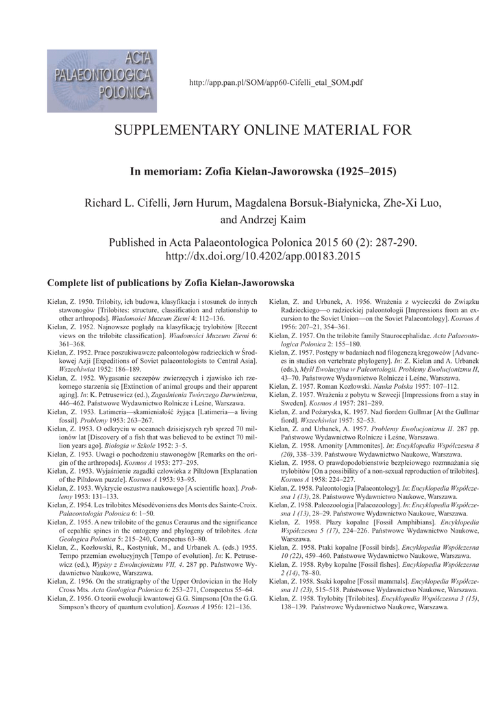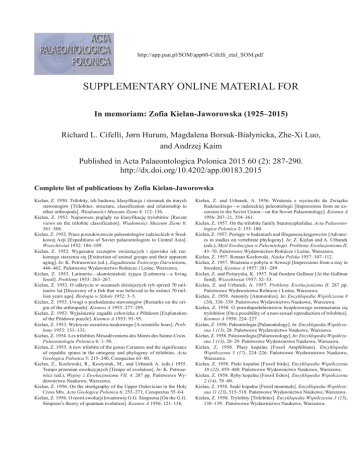 http://app.pan.pl/SOM/app60-Cifelli_etal_SOM.pdf SUPPLEMENTARY ONLINE MATERIAL FOR In memoriam: Zofia Kielan-Jaworowska (1925–2015) Richard L. Cifelli, Jørn Hurum, Magdalena Borsuk-Białynicka, Zhe-Xi Luo, and Andrzej Kaim Published in Acta Palaeontologica Polonica 2015 60 (2): 287-290. http://dx.doi.org/10.4202/app.00183.2015 Complete list of publications by Zofia Kielan-Jaworowska Kielan, Z. 1950. Trilobity, ich budowa, klasyfikacja i stosunek do innych stawonogów [Trilobites: structure, classification and relationship to other arthropods]. Wiadomości Muzeum Ziemi 4: 112–136. Kielan, Z. 1952. Najnowsze poglądy na klasyfikację trylobitów [Recent views on the trilobite classification]. Wiadomości Muzeum Ziemi 6: 361–368. Kielan, Z. 1952. Prace poszukiwawcze paleontologów radzieckich w Środkowej Azji [Expeditions of Soviet palaeontologists to Central Asia]. Wszechświat 1952: 186–189. Kielan, Z. 1952. Wygasanie szczepów zwierzęcych i zjawisko ich rzekomego starzenia się [Extinction of animal groups and their apparent aging]. In: K. Petrusewicz (ed.), Zagadnienia Twórczego Darwinizmu, 446–462. Państwowe Wydawnictwo Rolnicze i Leśne, Warszawa. Kielan, Z. 1953. Latimeria—skamieniałość żyjąca [Latimeria—a living fossil]. Problemy 1953: 263–267. Kielan, Z. 1953. O odkryciu w oceanach dzisiejszych ryb sprzed 70 milionów lat [Discovery of a fish that was believed to be extinct 70 million years ago]. Biologia w Szkole 1952: 3–5. Kielan, Z. 1953. Uwagi o pochodzeniu stawonogów [Remarks on the origin of the arthropods]. Kosmos A 1953: 277–295. Kielan, Z. 1953. Wyjaśnienie zagadki człowieka z Piltdown [Explanation of the Piltdown puzzle]. Kosmos A 1953: 93–95. Kielan, Z. 1953. Wykrycie oszustwa naukowego [A scientific hoax]. Problemy 1953: 131–133. Kielan, Z. 1954. Les trilobites Mésodévoniens des Monts des Sainte-Croix. Palaeontologia Polonica 6: 1–50. Kielan, Z. 1955. A new trilobite of the genus Ceraurus and the significance of cepahlic spines in the ontogeny and phylogeny of trilobites. Acta Geologica Polonica 5: 215–240, Conspectus 63–80. Kielan, Z., Kozłowski, R., Kostyniuk, M., and Urbanek A. (eds.) 1955. Tempo przemian ewolucyjnych [Tempo of evolution]. In: K. Petrusewicz (ed.), Wypisy z Ewolucjonizmu VII, 4. 287 pp. Państwowe Wydawnictwo Naukowe, Warszawa. Kielan, Z. 1956. On the stratigraphy of the Upper Ordovician in the Holy Cross Mts. Acta Geologica Polonica 6: 253–271, Conspectus 55–64. Kielan, Z. 1956. O teorii ewolucji kwantowej G.G. Simpsona [On the G.G. Simpson’s theory of quantum evolution]. Kosmos A 1956: 121–136. Kielan, Z. and Urbanek, A. 1956. Wrażenia z wycieczki do Związku Radzieckiego—o radzieckiej paleontologii [Impressions from an excursion to the Soviet Union—on the Soviet Palaeontology]. Kosmos A 1956: 207–21, 354–361. Kielan, Z. 1957. On the trilobite family Staurocephalidae. Acta Palaeontologica Polonica 2: 155–180. Kielan, Z. 1957. Postępy w badaniach nad filogenezą kręgowców [Advances in studies on vertebrate phylogeny]. In: Z. Kielan and A. Urbanek (eds.), Myśl Ewolucyjna w Paleontologii. Problemy Ewolucjonizmu II, 43–70. Państwowe Wydawnictwo Rolnicze i Leśne, Warszawa. Kielan, Z. 1957. Roman Kozłowski. Nauka Polska 1957: 107–112. Kielan, Z. 1957. Wrażenia z pobytu w Szwecji [Impressions from a stay in Sweden]. Kosmos A 1957: 281–289. Kielan, Z. and Pożaryska, K. 1957. Nad fiordem Gullmar [At the Gullmar fiord]. Wszechświat 1957: 52–53. Kielan, Z. and Urbanek, A. 1957. Problemy Ewolucjonizmu II. 287 pp. Państwowe Wydawnictwo Rolnicze i Leśne, Warszawa. Kielan, Z. 1958. Amonity [Ammonites]. In: Encyklopedia Współczesna 8 (20), 338–339. Państwowe Wydawnictwo Naukowe, Warszawa. Kielan, Z. 1958. O prawdopodobienstwie bezpłciowego rozmnażania się trylobitów [On a possibility of a non-sexual reproduction of trilobites]. Kosmos A 1958: 224–227. Kielan, Z. 1958. Paleontologia [Palaeontology]. In: Encyklopedia Współczesna 1 (13), 28. Państwowe Wydawnictwo Naukowe, Warszawa. Kielan, Z. 1958. Paleozoologia [Palaeozoology]. In: Encyklopedia Współczesna 1 (13), 28–29. Państwowe Wydawnictwo Naukowe, Warszawa. Kielan, Z. 1958. Płazy kopalne [Fossil Amphibians]. Encyklopedia Współczesna 5 (17), 224–226. Państwowe Wydawnictwo Naukowe, Warszawa. Kielan, Z. 1958. Ptaki kopalne [Fossil birds]. Encyklopedia Współczesna 10 (22), 459–460. Państwowe Wydawnictwo Naukowe, Warszawa. Kielan, Z. 1958. Ryby kopalne [Fossil fishes]. Encyklopedia Współczesna 2 (14), 78–80. Kielan, Z. 1958. Ssaki kopalne [Fossil mammals]. Encyklopedia Współczesna 11 (23), 515–518. Państwowe Wydawnictwo Naukowe, Warszawa. Kielan, Z. 1958. Trylobity [Trilobites]. Encyklopedia Współczesna 3 (15), 138–139. Państwowe Wydawnictwo Naukowe, Warszawa. 2 Kielan, Z. 1959. Zwierzęta sprzed milionów lat [The animals before millions of years]. Problemy 1959: 12–24. Kielan, Z. 1960. On two olenellid trilobites from Hornsund, Vestspitsbergen. Studia Geologica Polonica 4: 83–92. Kielan, Z. 1960. Upper Ordovician trilobites from Poland and some related forms from Bohemia and Scandinavia. Palaeontologia Polonica 11: 1–198. Kielan-Jaworowska, Z. 1961. On two Ordovician palychaete jaw apparatuses. Acta Palaeontologica Polonica 6: 237–260. Kielan-Jaworowska, Z. 1961. O ewolucji aparatów szczękowych u Eunicidae (Annelida, Polychaeta) [On the evolution of the jaw apparatuses in the Eunicidae (Annelida, Polychaeta)]. Kosmos A 1961: 425–441. Kielan-Jaworowska, Z. 1962. New Ordovician genera of polychaete jaw apparatuses. Acta Palaeontologica Polonica 7: 291–332. Kielan-Jaworowska, Z. 1962. Odkrycie najstarszych skamieniałości w prekambrze Australii [Discovery of the oldest fossils in the Precambrian of Australia]. Problemy 1962: 19–24. Kielan-Jaworowska, Z. 1962. Zakład Paleozoologii PAN [Institute of Paleozoology of the Polish Academy of Sciences]. Kosmos 1962: 354–358. Kiel