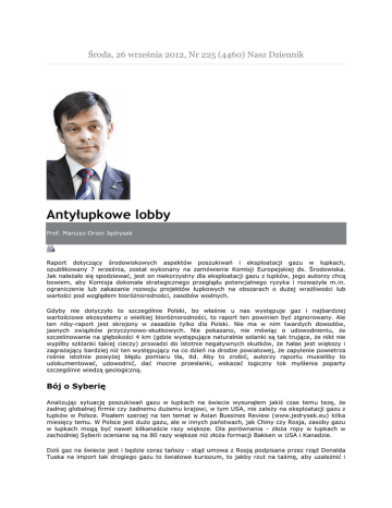 Środa, 26 września 2012, Nr 225 (4460) Nasz Dziennik Antyłupkowe lobby Prof. Mariusz-Orion Jędrysek Raport dotyczący środowiskowych aspektów poszukiwań i eksploatacji gazu w łupkach, opublikowany 7 września, został wykonany na zamówienie Komisji Europejskiej ds. Środowiska. Jak należało się spodziewać, jest on niekorzystny dla eksploatacji gazu z łupków, jego autorzy chcą bowiem, aby Komisja dokonała strategicznego przeglądu potencjalnego ryzyka i rozważyła m.in. ograniczenie lub zakazanie rozwoju projektów łupkowych na obszarach o dużej wrażliwości lub wartości pod względem bioróżnorodności, zasobów wodnych. Gdyby nie dotyczyło to szczególnie Polski, bo właśnie u nas występuje gaz i najbardziej wartościowe ekosystemy o wielkiej bioróżnorodności, to raport ten powinien być zignorowany. Ale ten niby-raport jest skrojony w zasadzie tylko dla Polski. Nie ma w nim twardych dowodów, jasnych związków przyczynowo-skutkowych. Nie pokazano, nie mówiąc o udowodnieniu, że szczelinowanie na głębokości 4 km (gdzie występujące naturalnie solanki są tak trujące, że nikt nie wypiłby szklanki takiej cieczy) prowadzi do istotnie negatywnych skutków, że hałas jest większy i zagrażający bardziej niż ten występujący na co dzień na drodze powiatowej, że zapylenie powietrza rośnie istotnie powyżej błędu pomiaru tła, itd. Aby to zrobić, autorzy raportu musieliby to udokumentować, udowodnić, dać mocne przesłanki, wskazać logiczny tok myślenia poparty szczególnie wiedzą geologiczną. Bój o Syberię Analizując sytuację poszukiwań gazu w łupkach na świecie wysunąłem jakiś czas temu tezę, że żadnej globalnej firmie czy żadnemu dużemu krajowi, w tym USA, nie zależy na eksploatacji gazu z łupków w Polsce. Pisałem szerzej na ten temat w Asian Bussines Review (www.jedrysek.eu) kilka miesięcy temu. W Polsce jest dużo gazu, ale w innych państwach, jak Chiny czy Rosja, zasoby gazu w łupkach mogą być nawet kilkanaście razy większe. Dla porównania - złoża ropy w łupkach w zachodniej Syberii oceniane są na 80 razy większe niż złoża formacji Bakken w USA i Kanadzie. Dziś gaz na świecie jest i będzie coraz tańszy - stąd umowa z Rosją podpisana przez rząd Donalda Tuska na import tak drogiego gazu to światowe kuriozum, to jakby rzut na taśmę, aby uzależnić i zapłacić jak najwięcej, bo później będziemy musieli wydać mniej albo wcale, gdyż będziemy mieli swój gaz. Syberyjskie zasoby ropy w łupkach są podobnej wielkości co w Arabii Saudyjskiej czy w Wenezueli, gdzie surowiec ten stanowi o międzynarodowej sile tych krajów - to zrobiło 300 miliardów baryłek ropy. Złoża arktyczne (Morze Karskie, okolice bieguna północnego) są ważne i perspektywiczne, ale nie teraz - obecnie chodzi o ropę i gaz z łupków na Syberii. Jak wielokrotnie i od lat powtarzam - świat nie ma problemu z ograniczeniem ilości gazu - jest problem z nadprodukcją gazu i spadającą ceną, ropa jest teraz znacznie bardziej w cenie niż gaz i to ona finansuje poszukiwania i eksploatację gazu w łupkach. Gaz stanie się z czasem produktem ubocznym, kopaliną towarzyszącą. Rzecz jasna decydujące są jednak motywy polityczne, skoro nie widzimy tego na naszych rachunkach za gaz. Strategia zniechęcania Dlatego Polska, mając tak nieudolny rząd, nie znajduje sojuszników broniących gazu z łupków. Mieliśmy szanse w latach 2006-2007, gdy w poszukiwaniu gazu w łupkach byliśmy drudzy na świecie po USA i Kanadzie. W Rosji, gdzie obecnie inwestują wielkie zachodnie firmy naftowe, w tym największa z nich Exxon Mobil, a także Statoil, ENI (ta pewnie zrezygnuje z poszukiwań w Polsce, ale koncesji formalnie nie odda), robi się gęsto. Idzie o przeogromne zachodniosyberyjskie złoża ropy, a także gazu w łupkach. Exxon Mobil zarzucił poszukiwania w Polsce nie tylko dlatego, że Rosja przedstawiła mu korzystniejszą ofertę, ale głównie przez splot fatalnych posunięć rządu Donalda Tuska z nim samym na czele. Kto wytrzyma ciągły wzrost ryzyka inwestycyjnego powodujący wzrost kosztów w tempie podobnym do wzrostu dziury budżetowej, brak uregulowań, i to 6 lat po udzieleniu pierwszych koncesji (gdy były niemal gotowe w 2007 roku), straszenie przez premiera nieznanymi obciążeniami, atmosferę podejrzeń o korupcję przy koncesjonowaniu, grę polityczną i PR-ową rządu wokół gazu itd. To wszystko zniechęca najbardziej pożądane firmy. Rzecz jasna omawiany raport pogarsza atmosferę wokół poszukiwań gazu w łupkach, ale nie ma kluczowego znaczenia dla firm. Zasadnicze znaczenie ma miernota rządzenia. Rząd próbuje wykorzystać raport jako zasłonę dymną tego, co popsuł. A popsuł wiele. Ostatnio wiceminister środowiska powiedział, że to nie ocena merytoryczna bierze górę w tym raporcie, a ocena polityczna. A dlaczego nie słychać było głosu ministerstwa gdy niszczono wszystko, co było do zniszczenia? Rząd Donalda Tuska, który zepsuł więcej, niż mogło sobie zamarzyć jakiekolwiek antyłupkowe lobby, miałby teraz obronić polski gaz z łupków? W maju br. zorganizowałem w Sejmie RP konferencję informacyjną dla wójtów, geologów powiatowych i starostów gmin i powiatów objętych koncesjami na gaz w łupkach - według ich informacji była to pierwsza tego typu akcja w Polsce. Jak więc ci ludzie wydali opinię dotyczącą udzielania koncesji? A gdzie program wsparcia geologii powiatowej i reforma administracji geologicznej rozpoczęte w 2006 roku? Minister skarbu zapowiada, że za trzy lata ruszy przemysłowe wydobycie. Wątpię, chyba że na mikroskalę. A jeśli tak, to dlaczego rząd mówi o zakupie elektrowni jądrowych? Dlaczego Waldemar Pawlak podpisał tak fatalną umowę zobowiązującą nas na dziesięciolecia do zakupu z Rosji ogromnych ilości najdroższego gazu w Europie bez praw do reeksportu? Dlaczego premier Tusk podpisał pakiet klimatyczno-energetyczny 