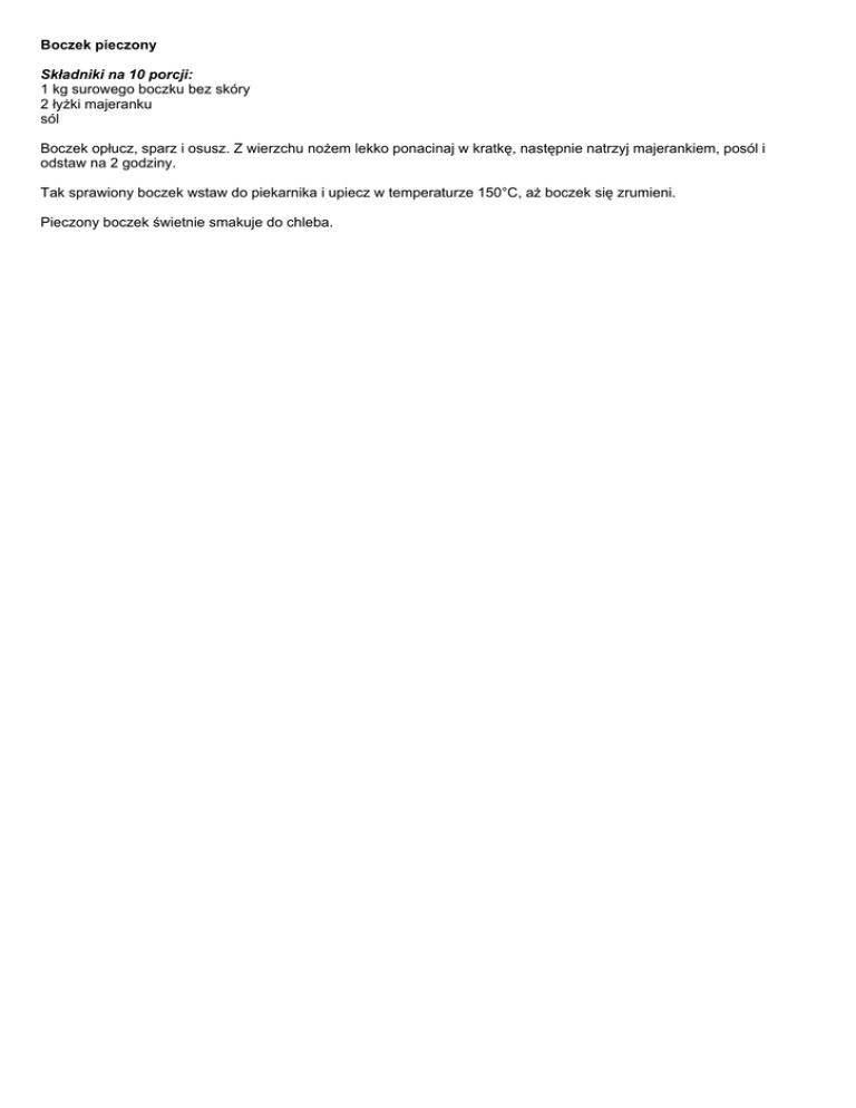 Boczek pieczony Składniki na 10 porcji: 1 kg surowego boczku bez skóry 2 łyżki majeranku sól Boczek opłucz, sparz i osusz. Z wierzchu nożem lekko ponacinaj w kratkę, następnie natrzyj majerankiem, posól i odstaw na 2 godziny. Tak sprawiony boczek wstaw do piekarnika i upiecz w temperaturze 150°C, aż boczek się zrumieni. Pieczony boczek świetnie smakuje do chleba.