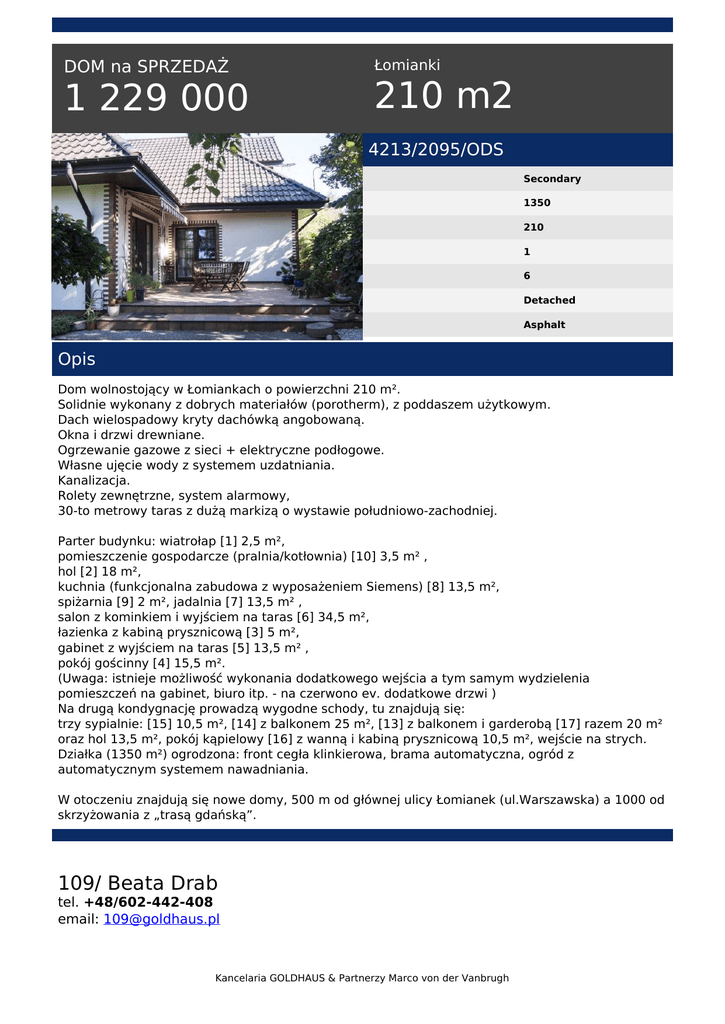 DOM na SPRZEDAŻ 1 229 000 Łomianki 210 m2 4213/2095/ODS Secondary 1350 210 1 6 Detached Asphalt Opis Dom wolnostojący w Łomiankach o powierzchni 210 m². Solidnie wykonany z dobrych materiałów (porotherm), z poddaszem użytkowym. Dach wielospadowy kryty dachówką angobowaną. Okna i drzwi drewniane. Ogrzewanie gazowe z sieci + elektryczne podłogowe. Własne ujęcie wody z systemem uzdatniania. Kanalizacja. Rolety zewnętrzne, system alarmowy, 30-to metrowy taras z dużą markizą o wystawie południowo-zachodniej. Parter budynku: wiatrołap [1] 2,5 m², pomieszczenie gospodarcze (pralnia/kotłownia) [10] 3,5 m² , hol [2] 18 m², kuchnia (funkcjonalna zabudowa z wyposażeniem Siemens) [8] 13,5 m², spiżarnia [9] 2 m², jadalnia [7] 13,5 m² , salon z kominkiem i wyjściem na taras [6] 34,5 m², łazienka z kabiną prysznicową [3] 5 m², gabinet z wyjściem na taras [5] 13,5 m² , pokój gościnny [4] 15,5 m². (Uwaga: istnieje możliwość wykonania dodatkowego wejścia a tym samym wydzielenia pomieszczeń na gabinet, biuro itp. - na czerwono ev. dodatkowe drzwi ) Na drugą kondygnację prowadzą wygodne schody, tu znajdują się: trzy sypialnie: [15] 10,5 m², [14] z balkonem 25 m², [13] z balkonem i garderobą [17] razem 20 m² oraz hol 13,5 m², pokój kąpielowy [16] z wanną i kabiną prysznicową 10,5 m², wejście na strych. Działka (1350 m²) ogrodzona: front cegła klinkierowa, brama automatyczna, ogród z automatycznym systemem nawadniania. W otoczeniu znajdują się nowe domy, 500 m od głównej ulicy Łomianek (ul.Warszawska) a 1000 od skrzyżowania z „trasą gdańską”. 109/ Beata Drab tel. +48/602-442-408 email: [email protected] Kancelaria GOLDHAUS & Partnerzy Marco von der Vanbrugh Kancelaria GOLDHAUS & Partnerzy Marco von der Vanbrugh Powered by TCPDF (www.tcpdf.org)