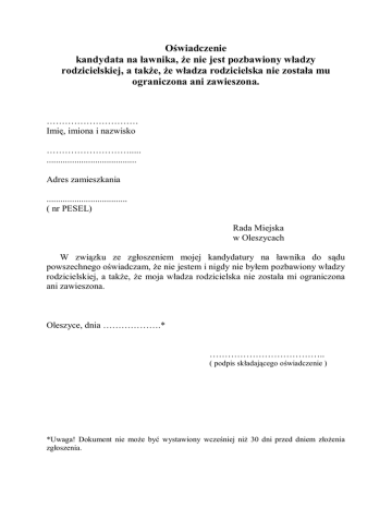 Oświadczenie kandydata na ławnika, że nie jest pozbawiony władzy rodzicielskiej, a także, że władza rodzicielska nie została mu ograniczona ani zawieszona. ………………………… Imię, imiona i nazwisko ………………………..... ....................................... Adres zamieszkania ................................... ( nr PESEL) Rada Miejska w Oleszycach W związku ze zgłoszeniem mojej kandydatury na ławnika do sądu powszechnego oświadczam, że nie jestem i nigdy nie byłem pozbawiony władzy rodzicielskiej, a także, że moja władza rodzicielska nie została mi ograniczona ani zawieszona. Oleszyce, dnia ……………….* ……………………………….. ( podpis składającego oświadczenie ) *Uwaga! Dokument nie może być wystawiony wcześniej niż 30 dni przed dniem złożenia zgłoszenia.