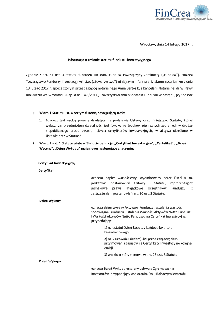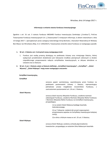 Wrocław, dnia 14 lutego 2017 r. Informacja o zmianie statutu funduszu inwestycyjnego Zgodnie z art. 31 ust. 3 statutu funduszu MEDARD Fundusz Inwestycyjny Zamknięty („Fundusz”), FinCrea Towarzystwo Funduszy Inwestycyjnych S.A. („Towarzystwo”) niniejszym informuje, iż aktem notarialnym z dnia 13 lutego 2017 r. sporządzonym przez zastępcę notarialnego Annę Bartosik, z Kancelarii Notarialnej dr Wisławy Boć-Mazur we Wrocławiu (Rep. A nr 1343/2017), Towarzystwo zmieniło statut Funduszu w następujący sposób: 1. W art. 1 Statutu ust. 4 otrzymał nową następującą treść: 1. 2. Fundusz jest osobą prawną działającą na podstawie Ustawy oraz niniejszego Statutu, której wyłącznym przedmiotem działalności jest lokowanie środków pieniężnych zebranych w drodze niepublicznego proponowania nabycia certyfikatów inwestycyjnych, w aktywa określone w Ustawie oraz w Statucie. W art. 2 ust. 1 Statutu użyte w Statucie definicje: „Certyfikat Inwestycyjny”, „Certyfikat” , „Dzień Wyceny”, „Dzień Wykupu” mają nowe następujące znaczenie: Certyfikat Inwestycyjny, Certyfikat oznacza papier wartościowy, wyemitowany przez Fundusz na podstawie postanowień Ustawy i Statutu, reprezentujący jednakowe prawa majątkowe Uczestników Funduszu, z zastrzeżeniem postanowień art. 10 ust. 2 Statutu; Dzień Wyceny oznacza dzień wyceny Aktywów Funduszu, ustalenia wartości zobowiązań Funduszu, ustalenia Wartości Aktywów Netto Funduszu i Wartości Aktywów Netto Funduszu na Certyfikat Inwestycyjny, przypadający: 1) na ostatni Dzień Roboczy każdego kwartału kalendarzowego, 2) na 7 (słownie: siedem) dni przed rozpoczęciem przyjmowania zapisów na Certyfikaty Inwestycyjne kolejnej emisji, 3) w dniu o którym mowa w art. 25 ust. 5 Statutu; Dzień Wykupu oznacza Dzień Wykupu ustalony uchwałą Zgromadzenia Inwestorów przypadający w ostatnim Dniu Roboczym kwartału kalendarzowego. Towarzystwo będzie niezwłocznie publikować na stronie internetowej www.fincrea.pl informacje o ustalonych przez Zgromadzenie Inwestorów Dniach Wykupu. Dzień Wykupu nie może przypadać wcześniej niż na 4 miesiące od dnia podjęcia uchwały przez Zgromadzenia Inwestorów o jego ustaleniu 3. 4. 5. W art. 6 Statutu ust 7 i 8 otrzymał nową następującą treść: 7. Głosowanie na Zgromadzeniu Inwestorów jest jawne. Zgromadzenie Inwestorów może wybrać Przewodniczącego Zgromadzenia, który kieruje obradami Zgromadzenia. Towarzystwo może nadać Zgromadzeniu Inwestorów regulamin określający szczegółowo tryb działania Zgromadzenia Inwestorów. 8. Uchwały Zgromadzenia Inwestorów są protokołowane w formie pisemnej. Uchwały Zgromadzenia są protokołowane przez osobę wyznaczoną przez Towarzystwo, a w razie niewyznaczenia protokolanta przez Towarzystwo protokół sporządza Uczestnik wybrany przez Zgromadzenie Inwestorów. Wszyscy uczestnicy Zgromadzenia składają parafy na każdej karcie protokołu i podpisują się na ostatniej stronie. W protokole należy stwierdzić prawidłowość zwołania Zgromadzenia Inwestorów, jego zdolność do powzięcia uchwał i wymienić powzięte uchwały oraz dołączyć listę obecności z podpisami uczestników Zgromadzenia Inwestorów. Protokoły Zgromadzeń Inwestorów przekazywane są Towarzystwu w ciągu dwóch Dni Roboczych wraz z pełnomocnictwami, o których mowa w ust. 6, a Towarzystwo przechowuje je i udostępnia na każde żądanie każdego Uczestnika. W art. 7 Statutu ust. 1 i 2 otrzymał nową następującą treść: 1. Towarzystwo zwołuje Zgromadzenie Inwestorów , zawiadamiając o nim co najmniej na 21 (dwadzieścia jeden) dni przed terminem planowanego Zgromadzenia Inwestorów. Ogłoszenie jest dokonywane na stronie internetowej Towarzystwa www.fincrea.pl. Ogłoszenie uważa się za dokonane, jeżeli zostało opublikowane na co najmniej 21 (słownie: dwadzieścia jeden) dni przed terminem planowanego Zgromadzenia Inwestorów na stronie internetowej Towarzystwa www.fincrea.pl. 2. W ogłoszeniu o zwołaniu Zgromadzenia Inwestorów, o którym mowa w ust. 1 powyżej, oznacza się dokładne miejsce (adres), w którym odbywać się będzie Zgromadzenie Inwestorów, datę i godzinę jego rozpoczęcia, a także zamieszcza się jego porządek obrad. Art. 8 Statutu otrzymał nową następującą treść: Art. 8 Uprawnienia Zgromadzenia Inwestorów 3. Zgromadzenie Inwestorów, w drodze uchwały, wyraża zgodę na: 1) --- zmianę Depozytariusza Funduszu; 2) --- przejęcie zarządzania funduszem inwestycyjnym zamkniętym przez inne towarzystwo; 3) --- przejęcie zarządzania funduszem inwestycyjnym zamkniętym i prowadzenia jego spraw przez zarządzającego z UE 4) --- emisję nowych Certyfikatów Inwestycyjnych przez Fundusz; 5) --- emisję obligacji przez Fundusz; 6) --- wypłatę dochodów uczestnikom Funduszu, zgodnie z art. 22 statutu Funduszu; 7) --- ustalanie Dni Wykupu Certyfikatów Inwestycyjnych, z zastrzeżeniem że Dni Wykupu będą ustalane w ostatnich Dniach Roboczych kwartału kalendarzowego, a pierwszy Dzień Wykupu ustalony przez Zgromadzenie Inwestorów daną uchwałą nie będzie przypadać wcześniej niż 4 miesiące od dnia podjęcia tej uchwały przez Zgromadzenie Inwestorów; 8) --- przekształcenie Certyfikatów Inwestycyjnych Funduszu w Certyfikaty na okaziciela; 9) --- zmiana Statutu, o której mowa w art. 117a ust. 1 Ustawy; 10) -- zmiana Statutu w zakresie polityki inwestycyjnej Funduszu. 6. 7. 2. Zgromadzenie Inwestorów jest uprawnione i może postanowić o rozwiązaniu Funduszu. ------------- 3. Wyboru podmiotu uprawnionego do badania lub przeglądu sprawozdań finansowych, który będzie przeprowadzać badanie lub przegląd sprawozdań finansowych Funduszu, dokonuje rada nadzorcza Towarzystwa. W art. 10 ust. 2, 6 i 8 Statutu otrzymał nową następującą treść: 2. Certyfikaty Inwestycyjne reprezentują jednakowe prawa majątkowe, z zastrzeżeniem uprzywilejowania Certyfikatów Inwestycyjnych