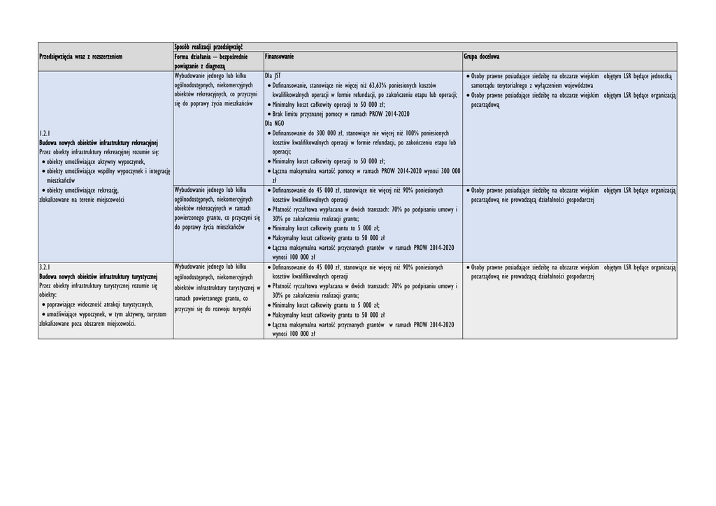 Sposób realizacji przedsięwzięć Finansowanie Forma działania – bezpośrednie powiązanie z diagnozą Wybudowanie jednego lub kilku Dla JST ogólnodostępnych, niekomercyjnych Dofinansowanie, stanowiące nie więcej niż 63,63% poniesionych kosztów obiektów rekreacyjnych, co przyczyni kwalifikowalnych operacji w formie refundacji, po zakończeniu etapu lub operacji; się do poprawy życia mieszkańców Minimalny koszt całkowity operacji to 50 000 zł; Brak limitu przyznanej pomocy w ramach PROW 2014-2020 Dla NGO Dofinansowanie do 300 000 zł, stanowiące nie więcej niż 100% poniesionych 1.2.1 kosztów kwalifikowalnych operacji w formie refundacji, po zakończeniu etapu lub Budowa nowych obiektów infrastruktury rekreacyjnej operacji; Przez obiekty infrastruktury rekreacyjnej rozumie się: Minimalny koszt całkowity operacji to 50 000 zł; obiekty umożliwiające aktywny wypoczynek, Łączna maksymalna wartość pomocy w ramach PROW 2014-2020 wynosi 300 000 obiekty umożliwiające wspólny wypoczynek i integrację zł mieszkańców Wybudowanie jednego lub kilku obiekty umożliwiające rekreację, Dofinansowanie do 45 000 zł, stanowiące nie więcej niż 90% poniesionych ogólnodostępnych, niekomercyjnych zlokalizowane na terenie miejscowości kosztów kwalifikowalnych operacji obiektów rekreacyjnych w ramach Płatność ryczałtowa wypłacana w dwóch transzach: 70% po podpisaniu umowy i powierzonego grantu, co przyczyni się 30% po zakończeniu realizacji grantu; do poprawy życia mieszkańców Minimalny koszt całkowity grantu to 5 000 zł; Maksymalny koszt całkowity grantu to 50 000 zł Łączna maksymalna wartość przyznanych grantów w ramach PROW 2014-2020 wynosi 100 000 zł Wybudowanie jednego lub kilku 3.2.1 Dofinansowanie do 45 000 zł, stanowiące nie więcej niż 90% poniesionych Budowa nowych obiektów infrastruktury turystycznej kosztów kwalifikowalnych operacji ogólnodostępnych, niekomercyjnych Przez obiekty infrastruktury turystycznej rozumie się obiektów infrastruktury turystycznej w Płatność ryczałtowa wypłacana w dwóch transzach: 70% po podpisaniu umowy i obiekty: 30% po zakończeniu realizacji grantu; ramach powierzonego grantu, co poprawiające widoczność atrakcji turystycznych, Minimalny koszt całkowity grantu to 5 000 zł; przyczyni się do rozwoju turystyki umożliwiające wypoczynek, w tym aktywny, turystom Maksymalny koszt całkowity grantu to 50 000 zł zlokalizowane poza obszarem miejscowości. Łączna maksymalna wartość przyznanych grantów w ramach PROW 2014-2020 wynosi 100 000 zł Przedsięwzięcia wraz z rozszerzeniem Grupa docelowa Osoby prawne posiadające siedzibę na obszarze wiejskim objętym LSR będące jednostką samorządu terytorialnego z wyłączeniem województwa Osoby prawne posiadające siedzibę na obszarze wiejskim objętym LSR będące organizacją pozarządową Osoby prawne posiadające siedzibę na obszarze wiejskim objętym LSR będące organizacją pozarządową nie prowadzącą działalności gospodarczej Osoby prawne posiadające siedzibę na obszarze wiejskim objętym LSR będące organizacją pozarządową nie prowadzącą działalności gospodarczej