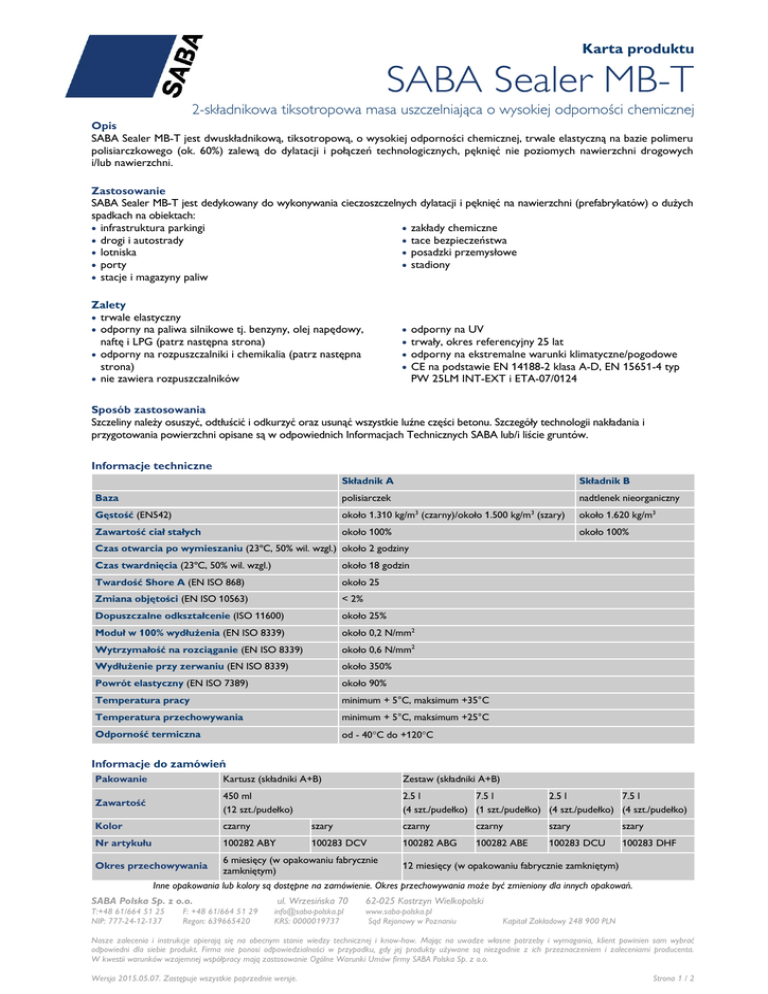 Karta produktu SABA Sealer MB-T 2-składnikowa tiksotropowa masa uszczelniająca o wysokiej odporności chemicznej Opis SABA Sealer MB-T jest dwuskładnikową, tiksotropową, o wysokiej odporności chemicznej, trwale elastyczną na bazie polimeru polisiarczkowego (ok. 60%) zalewą do dylatacji i połączeń technologicznych, pęknięć nie poziomych nawierzchni drogowych i/lub nawierzchni. Zastosowanie SABA Sealer MB-T jest dedykowany do wykonywania cieczoszczelnych dylatacji i pęknięć na nawierzchni (prefabrykatów) o dużych spadkach na obiektach: infrastruktura parkingi zakłady chemiczne drogi i autostrady tace bezpieczeństwa lotniska posadzki przemysłowe porty stadiony stacje i magazyny paliw Zalety trwale elastyczny odporny na paliwa silnikowe tj. benzyny, olej napędowy, naftę i LPG (patrz następna strona) odporny na rozpuszczalniki i chemikalia (patrz następna strona) nie zawiera rozpuszczalników odporny na UV trwały, okres referencyjny 25 lat odporny na ekstremalne warunki klimatyczne/pogodowe CE na podstawie EN 14188-2 klasa A-D, EN 15651-4 typ PW 25LM INT-EXT i ETA-07/0124 Sposób zastosowania Szczeliny należy osuszyć, odtłuścić i odkurzyć oraz usunąć wszystkie luźne części betonu. Szczegóły technologii nakładania i przygotowania powierzchni opisane są w odpowiednich Informacjach Technicznych SABA lub/i liście gruntów. Informacje techniczne Składnik A Składnik B Baza polisiarczek nadtlenek nieorganiczny Gęstość (EN542) około 1.310 kg/m3 (czarny)/około 1.500 kg/m3 (szary) około 1.620 kg/m3 Zawartość ciał stałych około 100% około 100% Czas otwarcia po wymieszaniu (23ºC, 50% wil. wzgl.) około 2 godziny Czas twardnięcia (23ºC, 50% wil. wzgl.) około 18 godzin Twardość Shore A (EN ISO 868) około 25 Zmiana objętości (EN ISO 10563) < 2% Dopuszczalne odkształcenie (ISO 11600) około 25% Moduł w 100% wydłużenia (EN ISO 8339) około 0,2 N/mm2 Wytrzymałość na rozciąganie (EN ISO 8339) około 0,6 N/mm2 Wydłużenie przy zerwaniu (EN ISO 8339) około 350% Powrót elastyczny (EN ISO 7389) około 90% Temperatura pracy minimum + 5°C, maksimum +35°C Temperatura przechowywania minimum + 5°C, maksimum +25°C Odporność termiczna od - 40C do +120C Informacje do zamówień Pakowanie Kartusz (składniki A+B) Zestaw (składniki A+B) Zawartość 450 ml (12 szt./pudełko) 2.5 l 7.5 l 2.5 l 7.5 l (4 szt./pudełko) (1 szt./pudełko) (4 szt./pudełko) (4 szt./pudełko) Kolor czarny szary czarny czarny szary szary Nr artykułu 100282 ABY 100283 DCV 100282 ABG 100282 ABE 100283 DCU 100283 DHF Okres przechowywania 6 miesięcy (w opakowaniu fabrycznie zamkniętym) 12 miesięcy (w opakowaniu fabrycznie zamkniętym) Inne opakowania lub kolory są dostępne na zamówienie. Okres przechowywania może być zmieniony dla innych opakowań. SABA Polska Sp. z o.o. T:+48 61/664 51 25 NIP: 777-24-12-137 F: +48 61/664 51 29 Regon: 639665420 ul. Wrzesińska 70 [email protected] KRS: 0000019737 62-025 Kostrzyn Wielkopolski www.saba-polska.pl Sąd Rejonowy w Poznaniu Kapitał Zakładowy 248 900 PLN Nasze zalecenia i instrukcje opierają się na obecnym stanie wiedzy technicznej i know-how. Mając na uwadze własne potrzeby i wymagania, klient powinien sam wybrać odpowiedni dla siebie produkt. Firma nie ponosi odpowiedzialności w przypadku, gdy jej produkty używane są niezgodnie z ich przeznaczeniem i zaleceniami producenta. W kwestii warunków wzajemnej współpracy mają zastosowanie Ogólne Warunki Umów firmy SABA Polska Sp. z o.o. Wersja 2015.05.07. Zastępuje wszystkie poprzednie wersje. Strona 1 / 2 Karta produktu SABA Sealer MB-T 2-składnikowa tiksotropowa masa uszczelniająca o wysokiej odporności chemicznej Zalecenia dotyczące bezpieczeństwa Więcej informacji dotyczących bezpieczeństwa zawiera Karta charakterystyki produktu. Inne informacje 1. Certyfikaty Europejska Aprobata Techniczna Nr ETA-07/0124 do stosowania na nawierzchniach cieczoszczelnych zagrożonych substancjami szkodliwymi dla środowiska. Orzeczenie ITWL nr 5/24/2007 o przydatności do nawierzchni lotniskowych. SABA Sealer MB-T był testowany przez KIWA Polymer Institute i spełnia wymagania normy FS S-SS200E w zakresie specyfikacji do stosowania na lotniskach. 2. Odporność na chemikalia Spełnia wymagania EN 14188-2 dla następujących grup chemicznych: LC1 Benzyna, super benzyna wg EN228 LC1a Benzyna dla silników z zapłonem iskrowym, super lub normalna (wg EN 228:2004-03) z maximum 20% objętościowym dodatkiem bioalkoholu LC2 Paliwo lotnicze LC3 Lekki olej napędowy, olej napędowy, nieużywane olej silnikowe, nieużywane oleje przekładniowe z punktem zapłonu >55°C LC3a Olej napędowy (wg EN 590) z maximum 5% objętościowym dodatkiem biodisla LC3b Olej napędowy (wg EN 590) z maximum 5% objętościowym dodatkiem biodisla LC4 Wszystkie węglowodory LC4a Benzen i jego mieszaniny LC4b Olej nieprzerobiony LC4c Olej nieprzerobiony LC5 Mono- i wielofunkcyjne alkohole (o zawartości metanolu do 48% objętości), glikol, eter LC5a Wszystkie alkohole i etery glikolowe LC5b Mono- i wielofunkcyjne alkohole LC7 Wszystkie estry organiczne i ketony LC7a Wszystkie estry aromatyczne i ketony LC7b Bio diesel LC8 Roztwory wodne aldehydów alifatycznych o stężeniu do 40% LC8a Aldehydy alifatyczne i ich roztwory wodne LC9 Roztwory wodne kwasów organicznych o stężeniu do 10% i ich sole LC10 Kwasy nieorganiczne o stężeniu do 20% oraz sole nieorganiczne w wodzie (pH<6) z wyłączeniem fluorowodorów i ich soli LC11 Związki nieorganiczne takie jak nieorganiczne sole w wodzie (pH>8) z wyłączeniem amoniaku i soli utleniających LC12 Roztwory wodne nieutleniających soli nieorganicznych dla pH w zakresie 6-8 - Skydrol LC13 Amina i jej sole (w roztworach wodnych) - Adblue, max. 35% mocznika w roztworze wodnym - Paliwo E85, mieszanka paliwowa 85% bio-etanol i 15% benzyna Więcej informacji na temat odporności dla konkretnych substancji lub grup substancji dostępne na żądanie. SABA P