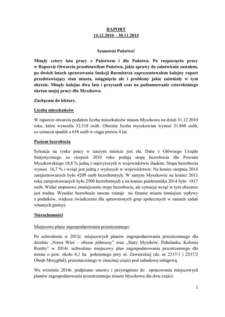 RAPORT 14.12.2010 – 30.11.2014 Szanowni Państwo! Minęły cztery lata pracy z Państwem i dla Państwa. Po rozpoczęciu pracy w Raporcie Otwarcia przedstawiłem Państwu, jakie sprawy do załatwienia zastałem, po dwóch latach sprawowania funkcji Burmistrza zaprezentowałem kolejny raport przedstawiający stan miasta, osiągnięcia ale i problemy jakie zaistniały w tym okresie. Minęły kolejne dwa lata i przyszedł czas na podsumowanie czteroletniego okresu mojej pracy dla Myszkowa. Zachęcam do lektury. Liczba mieszkańców W raporcie otwarcia podałem liczbę mieszkańców miasta Myszkowa na dzień 31.12.2010 roku, która wynosiła 32.518 osób. Obecnie liczba myszkowian wynosi 31.860 osób, co oznacza spadek o 658 osób w ciągu prawie 4 lat. Poziom bezrobocia Sytuacja na rynku pracy w naszym mieście jest zła. Dane z Głównego Urzędu Statystycznego za sierpień 2010 roku podają stopę bezrobocia dla Powiatu Myszkowskiego 18,8 % jedną z najwyższych w województwie śląskim. Stopa bezrobocia wynosi 16,7 % i wciąż jest jedną z wyższych w województwie. Na koniec sierpnia 2014 zarejestrowanych było 4209 osób bezrobotnych. W samym Myszkowie na koniec 2013 roku zarejestrowanych było 2500 bezrobotnych a na koniec października 2014 było 1817 osób. Widać stopniowe zmniejszenie stopy bezrobocia, ale sytuacja wciąż w tym obszarze jest trudna. Wysokie bezrobocie mocno rzutuje na finanse miasta (mniejsze wpływy z podatków, większe świadczenia dla uprawnionych grup społecznych w ramach zadań własnych gminy). Nieruchomości Miejscowe plany zagospodarowania przestrzennego: Po uchwaleniu w 2012r. miejscowych planów zagospodarowania przestrzennego dla dzielnic „Nowa Wieś – obszar północny” oraz „Stary Myszków, Pohulanka, Kolonia Remby” w 2014r. uchwalono miejscowy plan zagospodarowania przestrzennego dla terenu o pow. około 4,1 ha położonego przy ul. Zawierckiej (dz. nr 2537/1 i 2537/2 Obręb Mrzygłód), przeznaczonego w znacznej części pod zabudowę usługową. We wrześniu 2014r. podpisano umowy i przystąpiono do opracowania miejscowych planów zagospodarowania przestrzennego miasta Myszkowa dla dwu części: 1 I. miejscowe plany zagospodarowania przestrzennego dla terenów położonych w obrębie: dzielnic Ciszówka i Gruchla – o pow. ok. 512,5 ha, ul. Gruchla – o pow. ok. 7,1 ha. II. miejscowe plany zagospodarowania przestrzennego dla terenów położonych w centrum miasta w rejonie: ul. Pułaskiego – o pow. ok. 2,6 ha, wiaduktu w ciągu ul. Pułaskiego – o pow. ok. 3,2 ha, ul. Kopernika – o pow. ok. 6,2 ha. Po uchwaleniu ww. planów miejscowych miasto pokryte będzie planami w około 52 %, z czego ponad połowa stanowiła będzie tereny mocno zurbanizowane. Część zmian podyktowana jest określeniem terenów co do zamiarów inwestycyjnych co może skutkować powstawaniem na nich w przyszłości nowych miejsc pracy. Regulacja stanu prawnego dróg gminnych Drogi których stan prawny został uregulowany w drodze zasiedzenia. Różana Szpitalna Powstańców Śląskich Kościuszki od Placu Dworcowego do Urzędu Miasta Brzozowa Nowowiejska Plac Dworcowy Boczna Mała Szpitalna Broniewskiego Asnyka Ofiar Katynia Okrzei Odlewnicza Ceramiczna Olszowa Grabowa Świerkowa Sosnowa Zajęcza Myśliwska 2 Ulice, dla których uregulowano stan prawny w zakresie działek drogowych poprzez złożenie przez Gminę wniosku bezpośrednio do Sądu o urządzenie księgi wieczystej. Wojska Polskiego Korczaka Dywizjonu 303 Lipowa Powstania Styczniowego Lotnicza Barwna Malownicza Tęczowa Sadowa Błękitna Drogi objęte regulacją stanu prawnego w zakresie części działek stanowiących własność osób fizycznych przyległych do działki drogowej a zajętych pod drogi gminne w trybie art. 73 ustawy z dnia 13 października 1998 r. Przepisy wprowadzające ustawy reformujące administrację publiczną ( Dz. U. Nr 133 poz. 872 z późniejszymi zmianami): Ceramiczna Boczna Mała Szpitalna Wronia Akacjowa Grabowa Sarnia Rysia Lisia Reja Klonowa Ogrodowa Słoneczna Z uwagi na odmowę przez sąd, począwszy od marca 2013r. stwierdzenia nabycia przez Gminę własności nieruchomości drogowych w postępowaniu o zasiedzenie regulacja dróg dokonywana jest w oparciu o art. art. 51 ust. 1 pkt 2 ustawy z dnia 21 marca 1985 r. o drogach publicznych. Na podstawie ww. przepisu Starosta wydaje stosowne zaświadczenie i zakłada księgę wieczystą wpisując, jako właściciela Skarb Państwa, następnie Gmina występuje do Wojewody Śląskiego z wnioskiem o wydanie decyzji administracyjnej stwierdzającej 3 nabycie nieruchomości stanowiących drogi gminne. Na chwilę obecną przedmiotowy tryb regulacji stanów prawnych dróg gminnych jest najkorzystniejszy dla Gminy z uwagi na koszty i procedurę postępowania, w której większość czynności leży po stronie Starosty reprezentującego Skarb Państwa (wydanie zaświadczenia, ujawnienie prawa własności w ewidencji gruntów i budynków i założenie księgi wieczystej) W ww. trybie regulacją objęto ulice: Reja Lisia Rysia Sarnia droga do stadionu miejskiego, Ogrodowa droga do schroniska (przedłużenie ul. Pogodnej – droga gruntowa) Parkowa Słoneczna Partyzantów na odcinku od ul. 1 maja do torów kolejowych Klonowa Sadowa Kwiatkowskiego we fragmentach Cmentarna Szewska Osińska Góra Błotna Jesionowa Rybna Szkolna Ciemna Grzybowa Ziemniaczana Pszenna Gryczana Zielna Poprzeczna Zaułek Ponadto w roku 2014 zlecony został pomiar do regulacji stanu prawnego dla nw. dróg gminnych: Dworskiej Gołębiej Nierada 4 Czarnieckiego Ciasnej Dobrej Robotniczej Pięknej Strugi Tereny inwestycyjne 1. Nieruchomości oznaczone nr ewid. 10241/1, 10241/6, 1024/7 o pow. łącznej około 2,7 ha położone przy ul. Gruchla objęte KSSE. Teren nie objęty obowiązującym planem zagospodarowania przestrzennego, zgodnie ze studium uwarunkowań i kierunków zagospodarowania przestrzennego teren przeznaczony pod tereny produkcyjno-usługo