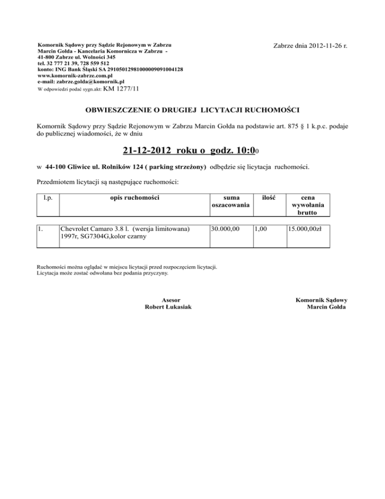 Komornik Sądowy przy Sądzie Rejonowym w Zabrzu Marcin Gołda - Kancelaria Komornicza w Zabrzu 41-800 Zabrze ul. Wolności 345 tel. 32 777 21 39, 728 559 512 konto: ING Bank Śląski SA 29105012981000009091004128 www.komornik-zabrze.com.pl e-mail: [email protected] W odpowiedzi podać sygn.akt: KM Zabrze dnia 2012-11-26 r. 1277/11 OBWIESZCZENIE O DRUGIEJ LICYTACJI RUCHOMOŚCI Komornik Sądowy przy Sądzie Rejonowym w Zabrzu Marcin Gołda na podstawie art. 875 § 1 k.p.c. podaje do publicznej wiadomości, że w dniu 21-12-2012 roku o godz. 10:00 w 44-100 Gliwice ul. Rolników 124 ( parking strzeżony) odbędzie się licytacja ruchomości. Przedmiotem licytacji są następujące ruchomości: l.p. 1. opis ruchomości Chevrolet Camaro 3.8 l. (wersja limitowana) 1997r, SG7304G,kolor czarny suma oszacowania 30.000,00 ilość 1,00 cena wywołania brutto 15.000,00zł Ruchomości można oglądać w miejscu licytacji przed rozpoczęciem licytacji. Licytacja może zostać odwołana bez podania przyczyny. Asesor Robert Łukasiak Komornik Sądowy Marcin Gołda