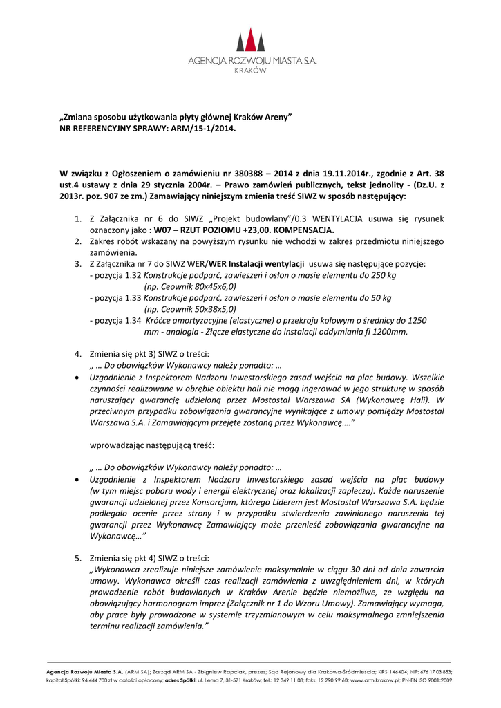 „Zmiana sposobu użytkowania płyty głównej Kraków Areny” NR REFERENCYJNY SPRAWY: ARM/15-1/2014. W związku z Ogłoszeniem o zamówieniu nr 380388 – 2014 z dnia 19.11.2014r., zgodnie z Art. 38 ust.4 ustawy z dnia 29 stycznia 2004r. – Prawo zamówień publicznych, tekst jednolity - (Dz.U. z 2013r. poz. 907 ze zm.) Zamawiający niniejszym zmienia treść SIWZ w sposób następujący: 1. Z Załącznika nr 6 do SIWZ „Projekt budowlany”/0.3 WENTYLACJA usuwa się rysunek oznaczony jako : W07 – RZUT POZIOMU +23,00. KOMPENSACJA. 2. Zakres robót wskazany na powyższym rysunku nie wchodzi w zakres przedmiotu niniejszego zamówienia. 3. Z Załącznika nr 7 do SIWZ WER/WER Instalacji wentylacji usuwa się następujące pozycje: - pozycja 1.32 Konstrukcje podparć, zawieszeń i osłon o masie elementu do 250 kg (np. Ceownik 80x45x6,0) - pozycja 1.33 Konstrukcje podparć, zawieszeń i osłon o masie elementu do 50 kg (np. Ceownik 50x38x5,0) - pozycja 1.34 Króćce amortyzacyjne (elastyczne) o przekroju kołowym o średnicy do 1250 mm - analogia - Złącze elastyczne do instalacji oddymiania fi 1200mm. 4. Zmienia się pkt 3) SIWZ o treści: „ … Do obowiązków Wykonawcy należy ponadto: … Uzgodnienie z Inspektorem Nadzoru Inwestorskiego zasad wejścia na plac budowy. Wszelkie czynności realizowane w obrębie obiektu hali nie mogą ingerować w jego strukturę w sposób naruszający gwarancję udzieloną przez Mostostal Warszawa SA (Wykonawcę Hali). W przeciwnym przypadku zobowiązania gwarancyjne wynikające z umowy pomiędzy Mostostal Warszawa S.A. i Zamawiającym przejęte zostaną przez Wykonawcę….” wprowadzając następującą treść: „ … Do obowiązków Wykonawcy należy ponadto: … Uzgodnienie z Inspektorem Nadzoru Inwestorskiego zasad wejścia na plac budowy (w tym miejsc poboru wody i energii elektrycznej oraz lokalizacji zaplecza). Każde naruszenie gwarancji udzielonej przez Konsorcjum, którego Liderem jest Mostostal Warszawa S.A. będzie podlegało ocenie przez strony i w przypadku stwierdzenia zawinionego naruszenia tej gwarancji przez Wykonawcę Zamawiający może przenieść zobowiązania gwarancyjne na Wykonawcę…” 5. Zmienia się pkt 4) SIWZ o treści: „Wykonawca zrealizuje niniejsze zamówienie maksymalnie w ciągu 30 dni od dnia zawarcia umowy. Wykonawca określi czas realizacji zamówienia z uwzględnieniem dni, w których prowadzenie robót budowlanych w Kraków Arenie będzie niemożliwe, ze względu na obowiązujący harmonogram imprez (Załącznik nr 1 do Wzoru Umowy). Zamawiający wymaga, aby prace były prowadzone w systemie trzyzmianowym w celu maksymalnego zmniejszenia terminu realizacji zamówienia.” [Wpisz tekst] wprowadzając następującą treść: „Wykonawca zrealizuje niniejsze zamówienie maksymalnie w ciągu 30 dni roboczych od dnia zawarcia umowy. Wykonawca w Formularzu oferty określi czas realizacji zamówienia podając ilość dni roboczych przewidzianych na jego wykonanie. Za dzień roboczy uznaje się każdy dzień (w tym soboty) w którym możliwe jest prowadzenie robót budowlanych w Kraków Arenie. Do dni roboczych nie należą dni „imprezowe” wskazane w załączniku nr 1 do Wzoru umowy oraz niedziele i dni świąteczne. Zamawiający wymaga, aby prace były prowadzone w systemie trzyzmianowym w celu maksymalnego zmniejszenia terminu realizacji zamówienia.” 6. Zmienia się Załącznik nr 1 do Wzoru umowy. (1 str. z załączeniu) Ponadto, Zamawiający informuje, że po terminie przewidzianym na zadawanie pytań wpłynęły zapytania do treści SIWZ. Zamawiający postanowił pozostawić je bez odpowiedzi – podstawa prawna z art. 38 ust.1a) ustawy z dnia 29 stycznia 2004r. Prawo zamówień publicznych (Dz.U. z 2013r. poz. 907 ze zm.). 1.12.2014r. [Wpisz tekst] Zarząd ARM S.A.