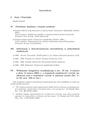 Autoreferat I. Imie֒ i Nazwisko Bogdan Damski II. Posiadane dyplomy i stopnie naukowe • Stopień doktora nauk fizycznych w zakresie fizyki, Uniwersytet Jagielloński, Kraków, 2003 r. Tytul rozprawy: Kolektywne zjawiska w zdegenerowanych gazach atomowych. Promotor: Prof. Dr hab. Jakub Zakrzewski. • Stopień magistra fizyki, Uniwersytet Jagielloński, Kraków, 1999 r. Tytul rozprawy: Supersymetryczne metody uzyskiwania równań Bogomolnego. Promotor: Dr hab. Leszek Hadasz. III. Informacje o dotychczasowym zatrudnieniu w jednostkach naukowych • 2009 – obecnie: Pracownik (“Staff member”), Los Alamos National Laboratory, USA. • 2005 – 2009: Postdok, Los Alamos National Laboratory, USA. • 2003 – 2005: Postdok, Institut für Theoretische Physik, Hannover. • 2000 – 2003: Doktorant, Uniwersytet Jagielloński, Kraków. IV. Wskazanie osiagni ecia wynikajacego z art. 16 ust. 2 ustawy ֒ ֒ ֒ z dnia 14 marca 2003 r. o stopniach naukowych i tytule naukowym oraz o stopniach i tytule w zakresie sztuki (Dz. U. nr 65, poz. 595 ze zm.) Jako osiagni ecie naukowe przedstawiam jednotematyczny cykl 8 publikacji na temat dy֒ ֒ namiki przejść fazowych: 1. “The simplest quantum model supporting the Kibble-Zurek mechanism of topological defect production: Landau-Zener transitions from a new perspective ”, B. Damski, Phys. Rev. Lett. 95, 035701 (2005). 2. “Adiabatic-Impulse approximation for avoided level crossings: from phase transition dynamics to Landau-Zener evolutions and back again ”, B. Damski and W.H. Zurek, Phys. Rev. A 73, 063405 (2006). 2 3. “Dynamics of a quantum phase transition in a ferromagnetic Bose-Einstein condensate ”, B. Damski and W.H. Zurek, Phys. Rev. Lett. 99, 130402 (2007). 4. “How to fix a broken symmetry: quantum dynamics of symmetry restoration in a ferromagnetic Bose-Einstein condensate ”, B. Damski and W.H. Zurek, New J. Phys. 10, 045023 (2008). 5. “Quantum phase transition in space in a ferromagnetic spin-1 Bose-Einstein condensate ”, B. Damski and W.H. Zurek, New J. Phys. 11, 063014 (2009). 6. “Dynamics of a quantum quench in an ultracold atomic BCS superfluid ”, C.C. Chien and B. Damski, Phys. Rev. A 82, 063616 (2010). 7. “Critical dynamics of decoherence ”, B. Damski, H.T. Quan, and W.H. Zurek, Phys. Rev. A 83, 062104 (2011). 8. “Soliton creation during a Bose-Einstein condensation ”, B. Damski and W.H. Zurek, Phys. Rev. Lett. 104, 160404 (2010). Informacje na temat ilości cytowań/wskaźnika “impact factor” tych publikacji znajduja֒ sie֒ w referencjach [1–8]. Te artykuly zostana֒ omówione w rozdziale V (podsumowanie wszystkich moich publikacji [1–29] znajduje sie֒ w rozdziale VI). V. Omówienie celu naukowego i uzyskanych wyników w jednotematycznym cyklu prac przedstawionym jako osiagni ecie na֒ ֒ ukowe Poniżej przedstawimy pogladow a֒ dyskusje֒ prac [1–8]. Nie bedziemy wchodzić w szczególy ֒ ֒ tych obliczeń a ilość wzorów ograniczymy do minimum niezbednego do jasnego przedstawie֒ nia dyskutowanych problemów. Wszystkie wzory bed ֒ a֒ zapisane przy pomocy bezwymiarowych wielkości. A. Wprowadzenie Przejścia fazowe zachodza֒ wtedy, gdy wlasności ukladu zmieniaja֒ sie֒ dramatycznie na skutek malej zmiany pewnego parametru (w tej rozprawie zaweżamy sie֒ do przejść fazo֒ wych drugiego rodzaju). W przypadku klasycznych przejść fazowych takim parametrem jest typowo temperatura T . Jako przyklad warto tutaj podać przejścia metal – nadprzewodnik i normalny gaz – kondensat Bosego-Einsteina. Obydwa procesy zachodza֒ na skutek obniżania temperatury ukladu i dla każdego z nich istnieje temperatura krytyczna Tc , poniżej której uklad wkracza do nowej fazy. Dramatyczna zmiana stanu ukladu po dwóch stronach przejścia fazowego jest sygnalizowana osobliwościami w równowagowych wlasnościach ukladu. Polożenie tych osobliwości definiuje punkt krytyczny. Na przyklad, dlugość korelacji w pobliżu punktu krytycznego typowo rośnie potegowo i jest opisana wykladnikiem krytycznym ν > 0: ֒ ξ ∼ |ε − εc |−ν , 3 gdzie ε jest parametrem przejścia a εc jest polożeniem punktu krytycznego (na przyklad ε = T /Tc i wtedy εc = 1). Podobnie czas relaksacji ukladu – czas po jakim uklad powraca do stanu równowagi termodynamicznej po malym zaburzeniu – jest osobliwy w punkcie krytycznym. Typowo ta rozbieżność ma postać: τ ∼ |ε − εc |−zν , gdzie z > 0 jest dynamicznym wykladnikiem krytycznym. Wykladniki krytyczne z i ν odzwierciedlaja֒ symetrie ukladu, czyli jego klase֒ uniwersalności. Implikacje istnienia tych osobliwości na dynamike֒ ukladu sa֒ bardzo ciekawe: na skutek rozbieżności czasu relaksacji nie jest możliwa adiabatyczna ewolucja przez punkt krytyczny w skończonym czasie [30]. Zatem pojawia sie֒ pytanie jak można w systematyczny sposób badać nierównowagowa֒ ewolucje֒ przez punkt krytyczny ? Najprostszy pomysl polega na przeprowadzeniu ukladu z jednej fazy do drugiej poprzez liniowa֒ w czasie zmiane֒ parametru przejścia: ε(t) = εc + t , τQ (1) gdzie czas przebiega od t ≪ 0 do t ≫ 0 a τQ jest parametrem. Uklad przechodzi przez punkt krytyczny w chwili t = 0 a szybkość zmiany parametru przejścia jest odwrotnie proporcjonalna do τQ : adiabatyczna ewolucja odpowiada granicy τQ → ∞ a diabatyczna τQ → 0. Najprostsze podejście pozwalajace na analityczny wglad ֒ ֒ w dynamike֒ przejścia fazowego jest oparte na przybliżeniu adiabatyczno-impulsowym. To przybliżenie zaklada, że uklad bedzie ewoluowal adiabatycznie daleko od punktu krytycznego gdzie czas relaksacji jest ֒ maly. Z kolei w okolicy punktu krytycznego, jego ewolucja bedzie w przybliżeniu diaba֒ tyczna/impulsowa: jego stan nie bedzie sie֒ zmienial ponieważ czas relaksacji jest zbyt duży ֒ aby uklad mógl zareagować na przylożone zaburzenie. Pozostaje zatem pytanie jak duży jest impulsowy obszar dynamiki i jakie konsekwencje wynikaja֒ z jego i