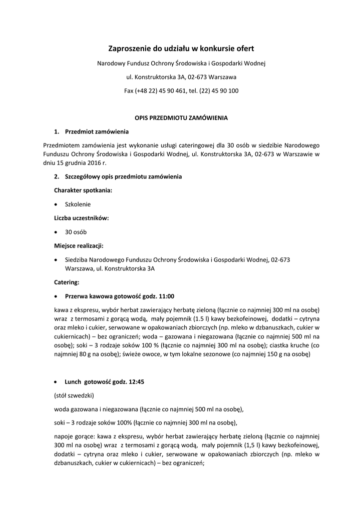 Zaproszenie do udziału w konkursie ofert Narodowy Fundusz Ochrony Środowiska i Gospodarki Wodnej ul. Konstruktorska 3A, 02-673 Warszawa Fax (+48 22) 45 90 461, tel. (22) 45 90 100 OPIS PRZEDMIOTU ZAMÓWIENIA 1. Przedmiot zamówienia Przedmiotem zamówienia jest wykonanie usługi cateringowej dla 30 osób w siedzibie Narodowego Funduszu Ochrony Środowiska i Gospodarki Wodnej, ul. Konstruktorska 3A, 02-673 w Warszawie w dniu 15 grudnia 2016 r. 2. Szczegółowy opis przedmiotu zamówienia Charakter spotkania: Szkolenie Liczba uczestników: 30 osób Miejsce realizacji: Siedziba Narodowego Funduszu Ochrony Środowiska i Gospodarki Wodnej, 02-673 Warszawa, ul. Konstruktorska 3A Catering: Przerwa kawowa gotowość godz. 11:00 kawa z ekspresu, wybór herbat zawierający herbatę zieloną (łącznie co najmniej 300 ml na osobę) wraz z termosami z gorącą wodą, mały pojemnik (1.5 l) kawy bezkofeinowej, dodatki – cytryna oraz mleko i cukier, serwowane w opakowaniach zbiorczych (np. mleko w dzbanuszkach, cukier w cukiernicach) – bez ograniczeń; woda – gazowana i niegazowana (łącznie co najmniej 500 ml na osobę); soki – 3 rodzaje soków 100 % (łącznie co najmniej 300 ml na osobę); ciastka kruche (co najmniej 80 g na osobę); świeże owoce, w tym lokalne sezonowe (co najmniej 150 g na osobę) Lunch gotowość godz. 12:45 (stół szwedzki) woda gazowana i niegazowana (łącznie co najmniej 500 ml na osobę), soki – 3 rodzaje soków 100% (łącznie co najmniej 300 ml na osobę), napoje gorące: kawa z ekspresu, wybór herbat zawierający herbatę zieloną (łącznie co najmniej 300 ml na osobę) wraz z termosami z gorącą wodą, mały pojemnik (1,5 l) kawy bezkofeinowej, dodatki – cytryna oraz mleko i cukier, serwowane w opakowaniach zbiorczych (np. mleko w dzbanuszkach, cukier w cukiernicach) – bez ograniczeń; sałaty i sałatki – co najmniej 3 propozycje (łącznie co najmniej 150 g na osobę); zupa – 1 propozycja (co najmniej 300 ml na osobę); danie główne – co najmniej 3 propozycje (co najmniej 450-500 g na osobę, w tym dodatek mięsny, rybny, wegetariański nie mniej niż 250 g oraz dwa dodatki skrobiowe (jako dodatek skrobiowy rozumie się np. ziemniaki, ryż, kaszę lub makaron) danie główne obejmować będzie potrawy mięsne (jeden rodzaj), rybne (jeden rodzaj, wegetariańskie (jeden rodzaj); deser – sałatka owocowa lub świeże owoce, w tym lokalne sezonowe (co najmniej 250 g na osobę) i co najmniej 3 rodzaje ciast (łącznie co najmniej 100 g na osobę). Usługi: przygotowanie, dowóz, sprzątanie, obsługa kelnerska, stoły koktajlowe 3. Termin realizacji 15 grudnia 2016 r. 4. Termin, miejsce i sposób składania ofert Oferty należy składać w wersji elektronicznej na adres e-mail: [email protected] do dnia 12.12.2016 r. do godz. 12.00. 5. Kryteria oceny ofert Oferty zostaną ocenione przez Zamawiającego w oparciu o następujące kryterium: Kryterium Waga pkt Cena (C) 100 Oferty zostaną ocenione wg wzoru: najniższa oferowana cena C = --------------------------------------------- x 100 pkt. cena ocenianej oferty Punkty będą obliczane z dokładnością do dwóch miejsc po przecinku. Niniejsze zamówienie zostanie udzielone temu Wykonawcy, którego oferta uzyska najwyższą liczbę punktów w ostatecznej ocenie punktowej.
