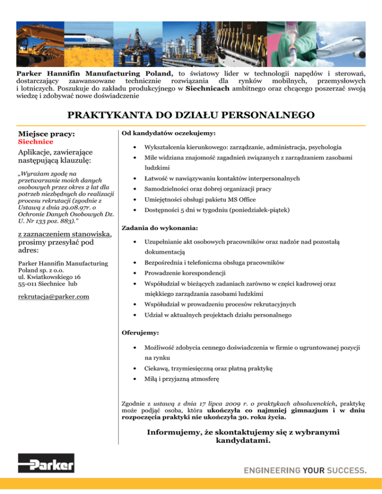 Parker Hannifin Manufacturing Poland, to światowy lider w technologii napędów i sterowań, dostarczający zaawansowane technicznie rozwiązania dla rynków mobilnych, przemysłowych i lotniczych. Poszukuje do zakładu produkcyjnego w Siechnicach ambitnego oraz chcącego poszerzać swoją wiedzę i zdobywać nowe doświadczenie PRAKTYKANTA DO DZIAŁU PERSONALNEGO Miejsce pracy: Od kandydatów oczekujemy: Siechnice Aplikacje, zawierające następującą klauzulę: • Wykształcenia kierunkowego: zarządzanie, administracja, psychologia • Mile widziana znajomość zagadnień związanych z zarządzaniem zasobami ludzkimi „Wyrażam zgodę na przetwarzanie moich danych osobowych przez okres 2 lat dla potrzeb niezbędnych do realizacji procesu rekrutacji (zgodnie z Ustawą z dnia 29.08.97r. o Ochronie Danych Osobowych Dz. U. Nr 133 poz. 883).” • Łatwość w nawiązywaniu kontaktów interpersonalnych • Samodzielności oraz dobrej organizacji pracy • Umiejętności obsługi pakietu MS Office • Dostępności 5 dni w tygodniu (poniedziałek-piątek) Zadania do wykonania: z zaznaczeniem stanowiska, prosimy przesyłać pod adres: Parker Hannifin Manufacturing Poland sp. z o.o. ul. Kwiatkowskiego 16 55-011 Siechnice lub • Uzupełnianie akt osobowych pracowników oraz nadzór nad pozostałą dokumentacją • Bezpośrednia i telefoniczna obsługa pracowników • Prowadzenie korespondencji • Współudział w bieżących zadaniach zarówno w części kadrowej oraz miękkiego zarządzania zasobami ludzkimi [email protected] • Współudział w prowadzeniu procesów rekrutacyjnych • Udział w aktualnych projektach działu personalnego Oferujemy: • Możliwość zdobycia cennego doświadczenia w firmie o ugruntowanej pozycji na rynku • Ciekawą, trzymiesięczną oraz płatną praktykę • Miłą i przyjazną atmosferę Zgodnie z ustawą z dnia 17 lipca 2009 r. o praktykach absolwenckich, praktykę może podjąć osoba, która ukończyła co najmniej gimnazjum i w dniu rozpoczęcia praktyki nie ukończyła 30. roku życia. Informujemy, że skontaktujemy się z wybranymi kandydatami.